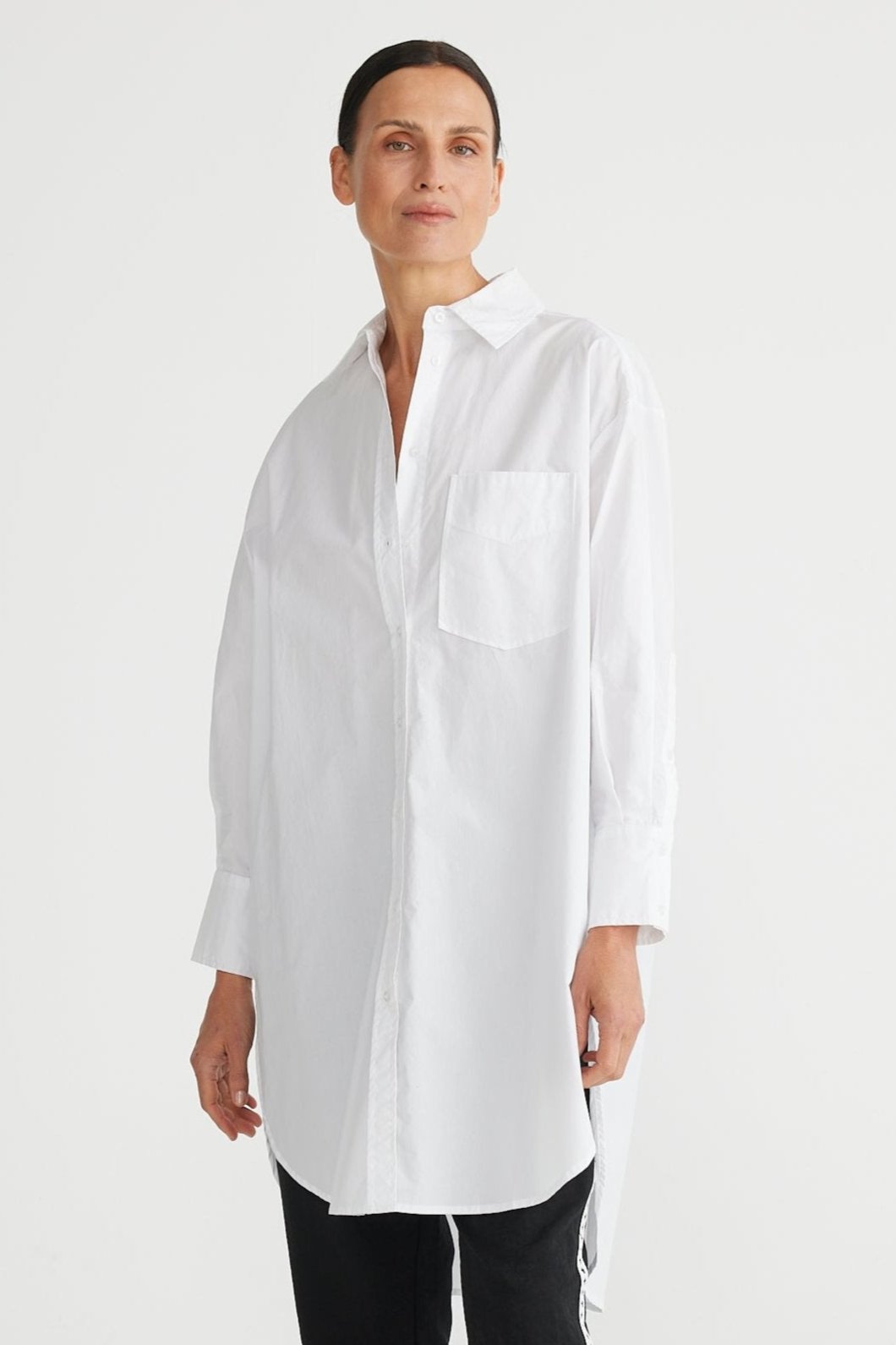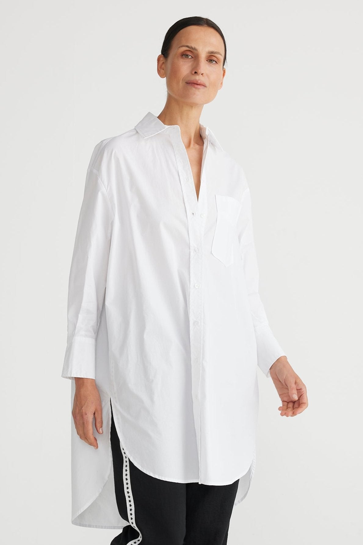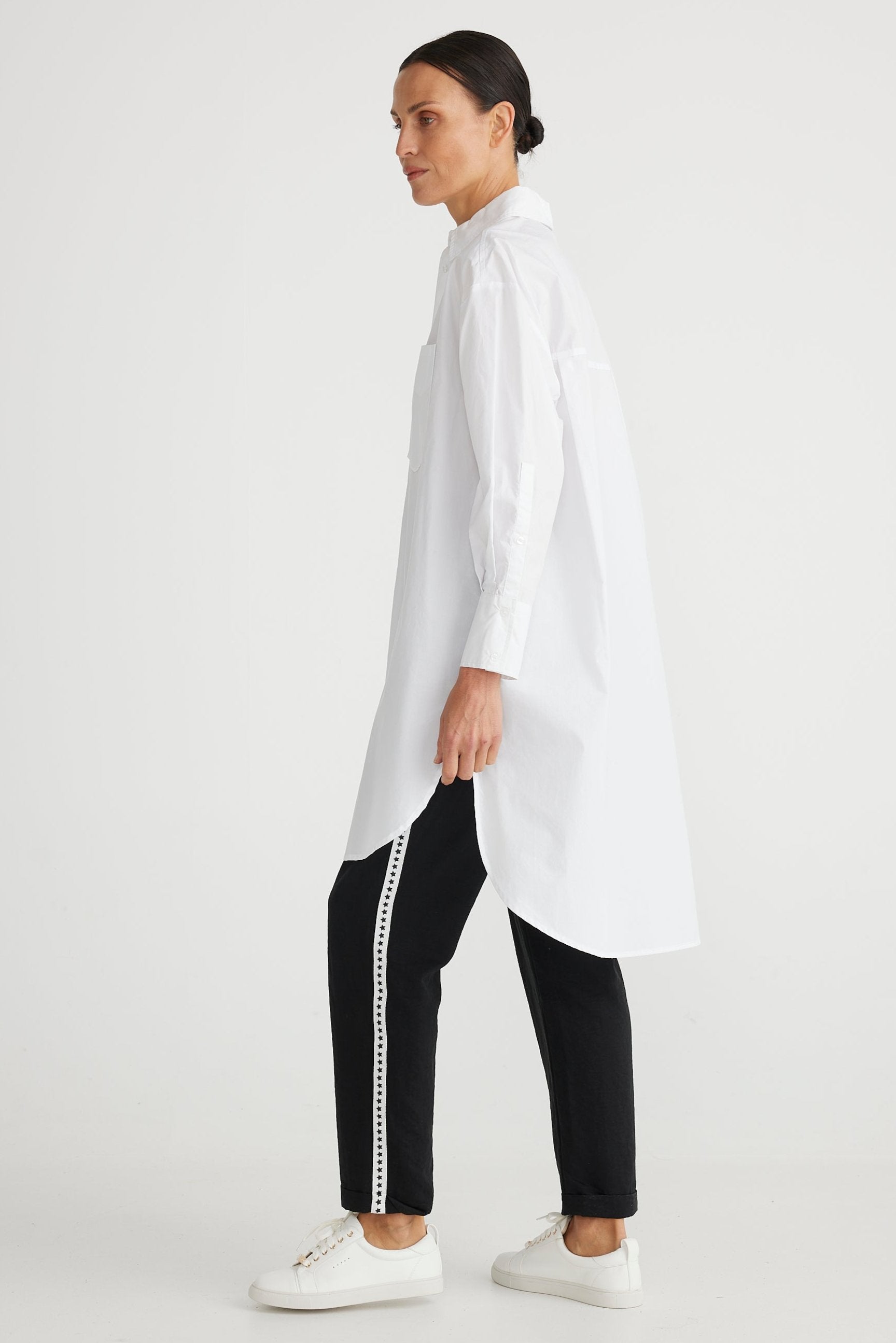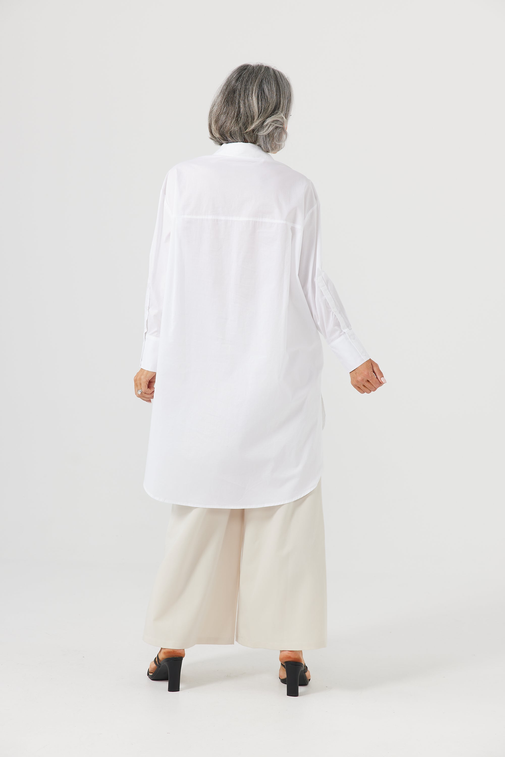 A good white shirt is the key piece to a perfect wardrobe. Take charge like a General in this classic long line over shirt. Elegant design lines make this the most flattering and versatile shirt to grace your wardrobe. Wear it buttoned up, or open as a layering piece.
