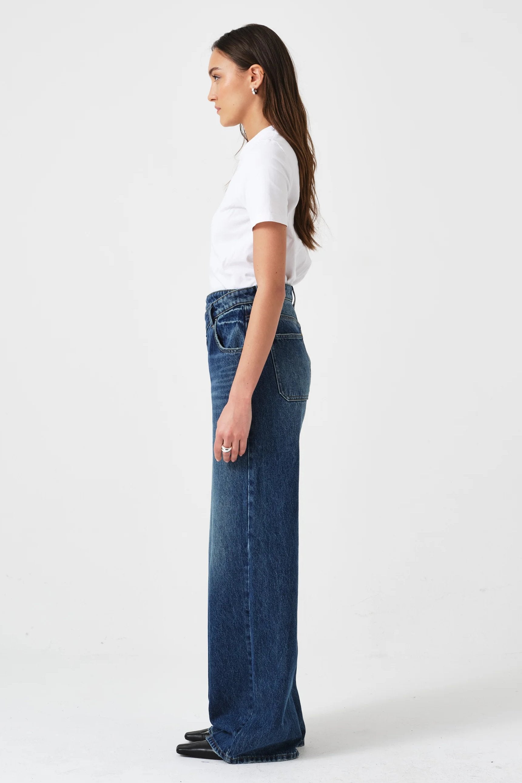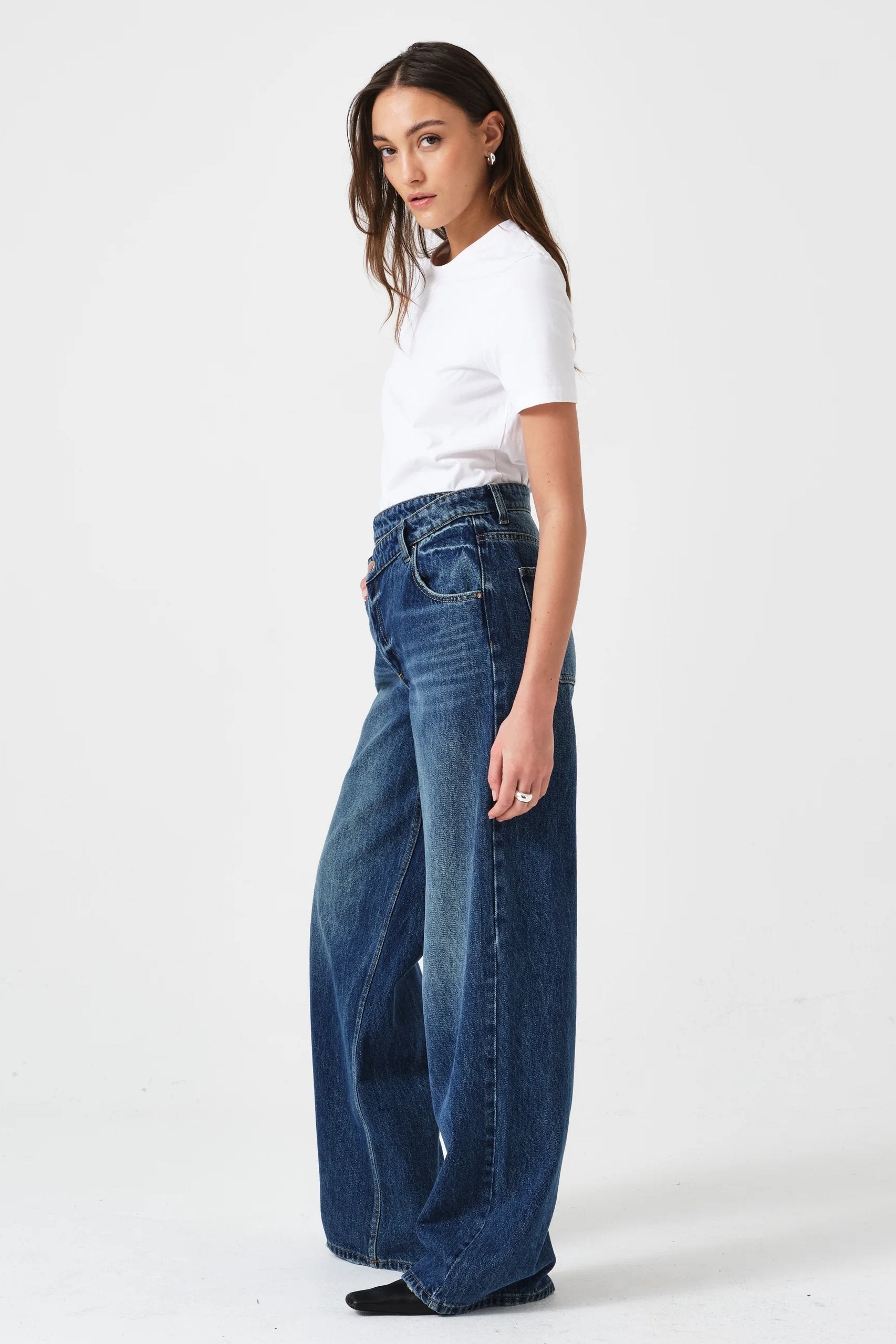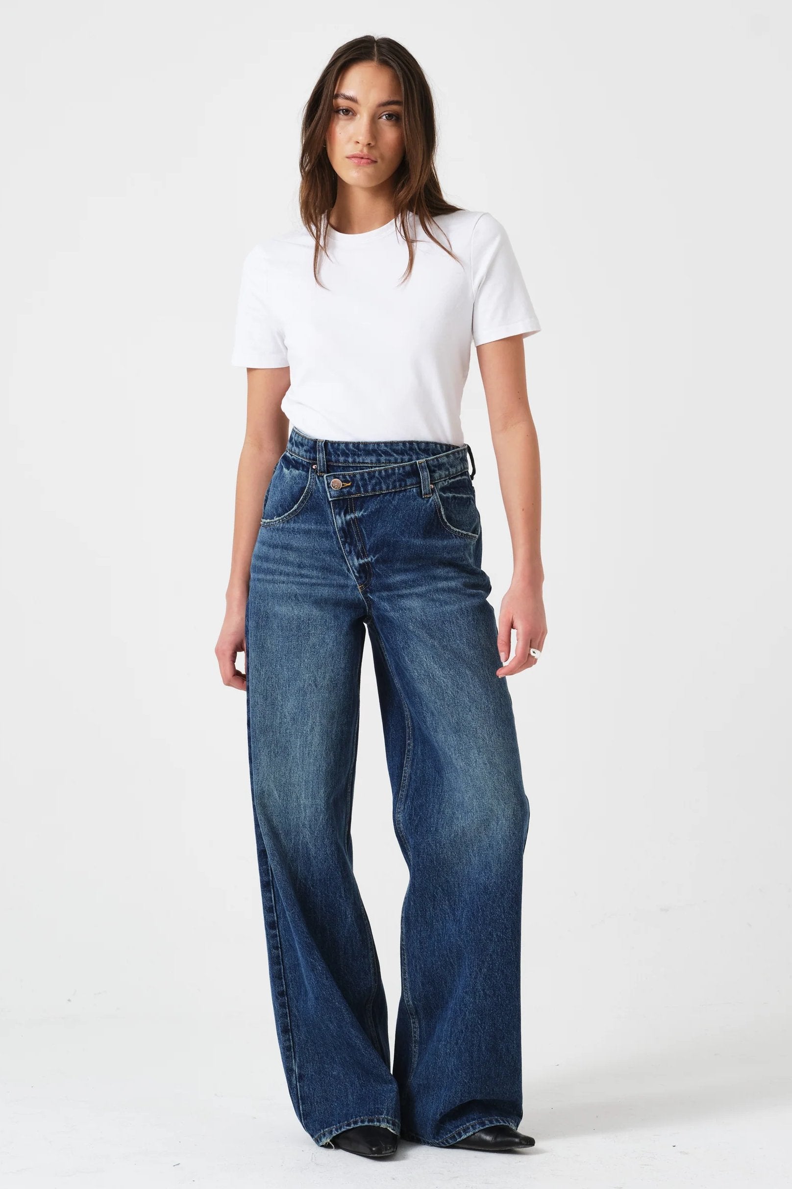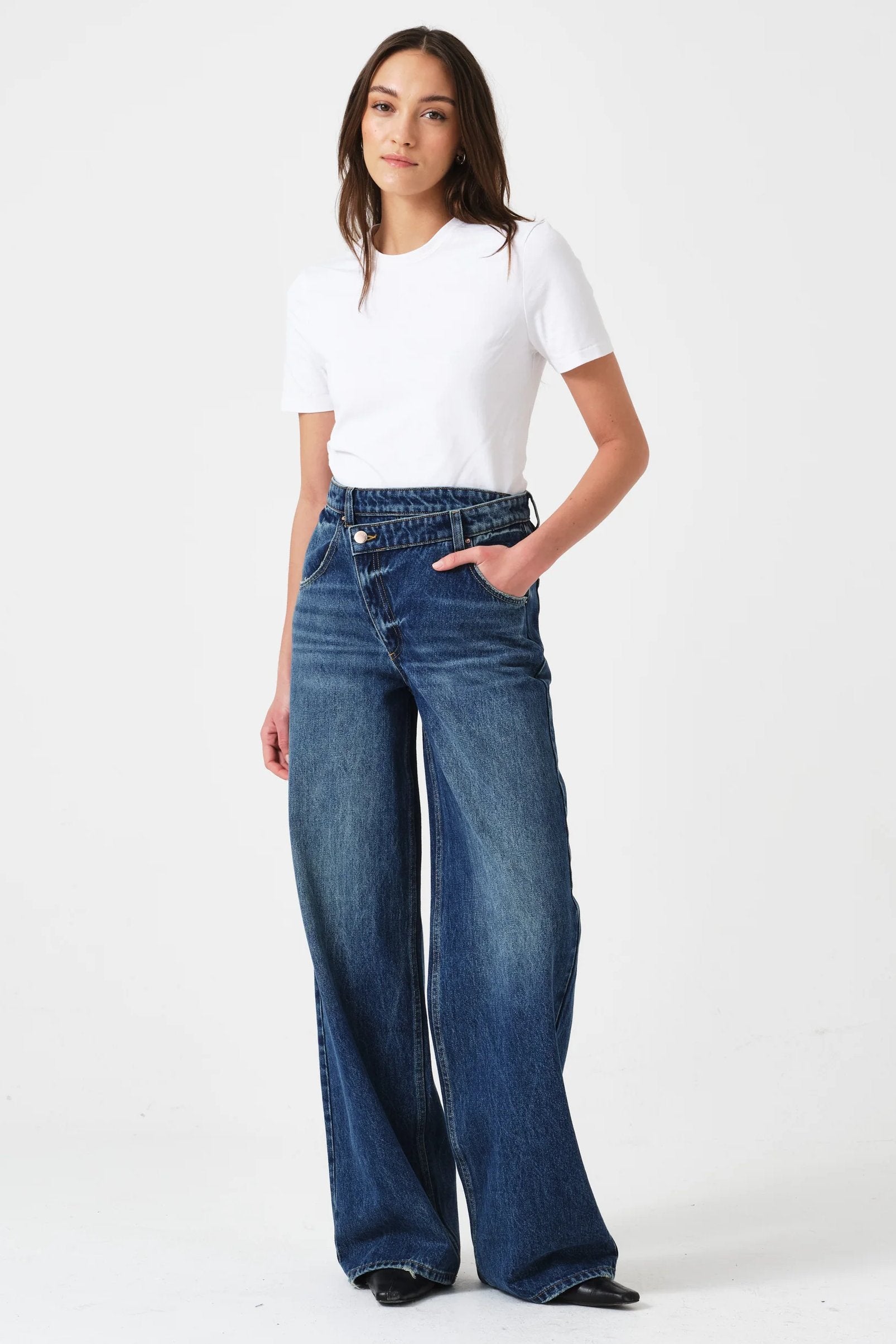 The Lia: your new go-to jean with a sleek crossover waistband and an easy, wide-leg fit
