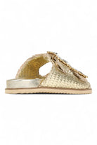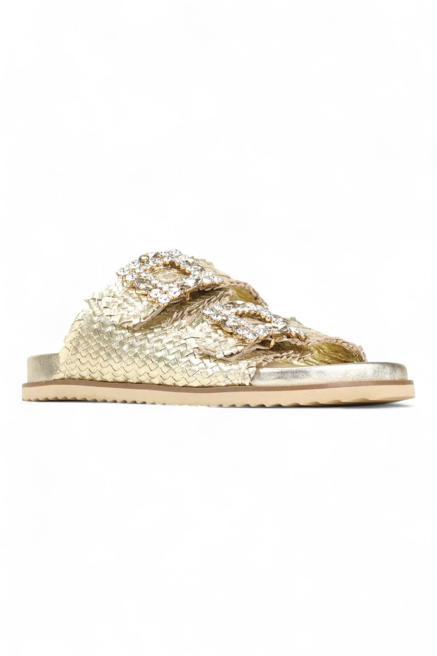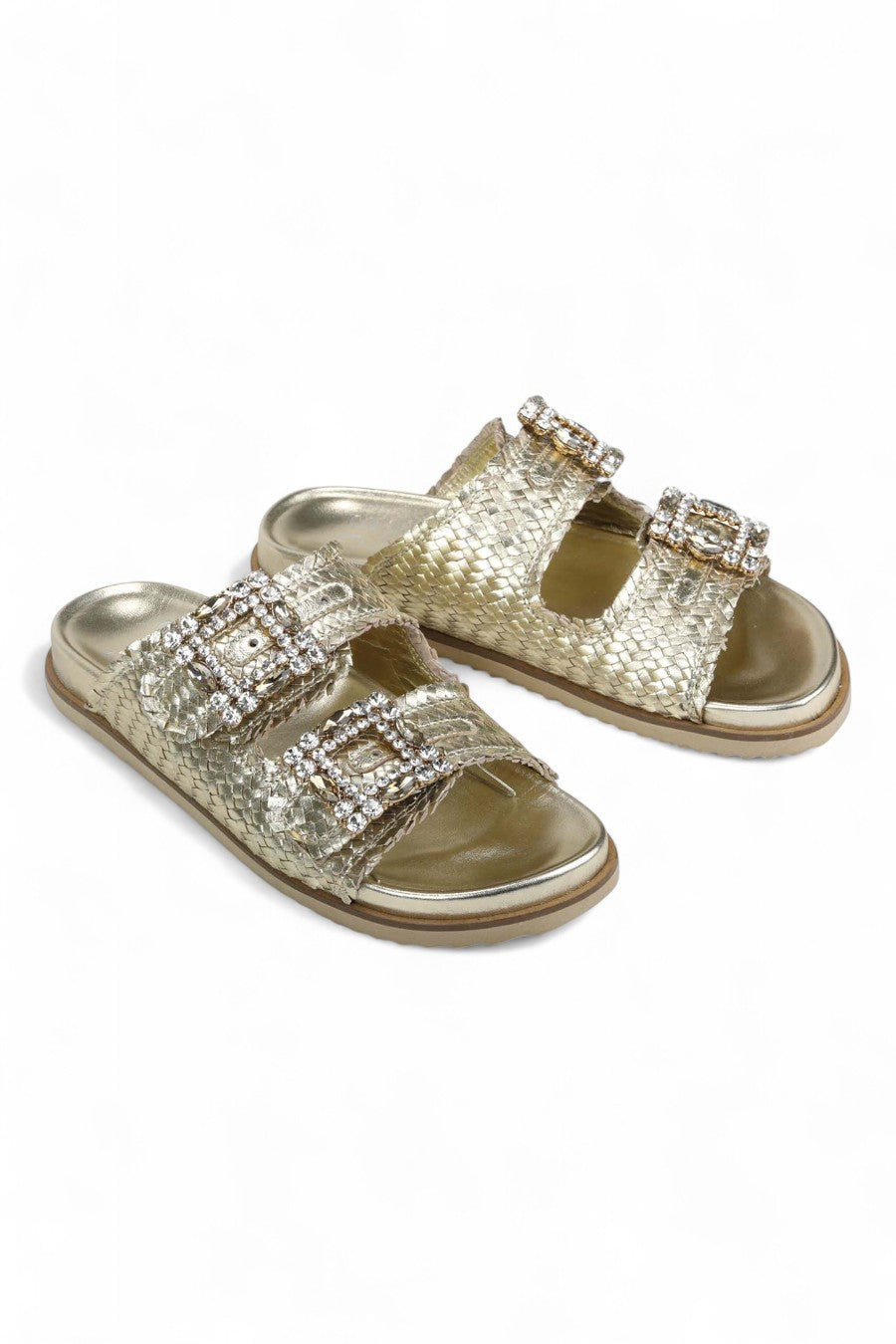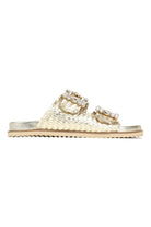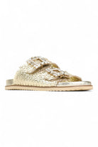 Our ADINAH Sandals are designed to combine style and comfort effortlessly. Crafted from metallic woven leather with rhinestone-embellished buckles, these slides offer a touch of glamour while staying practical. Dual adjustable straps and a leather-moulded footbed provide a secure fit and support your natural arch, making them perfect for all-day wear.
