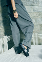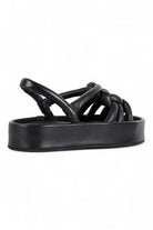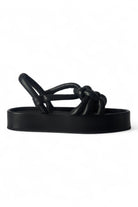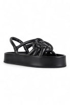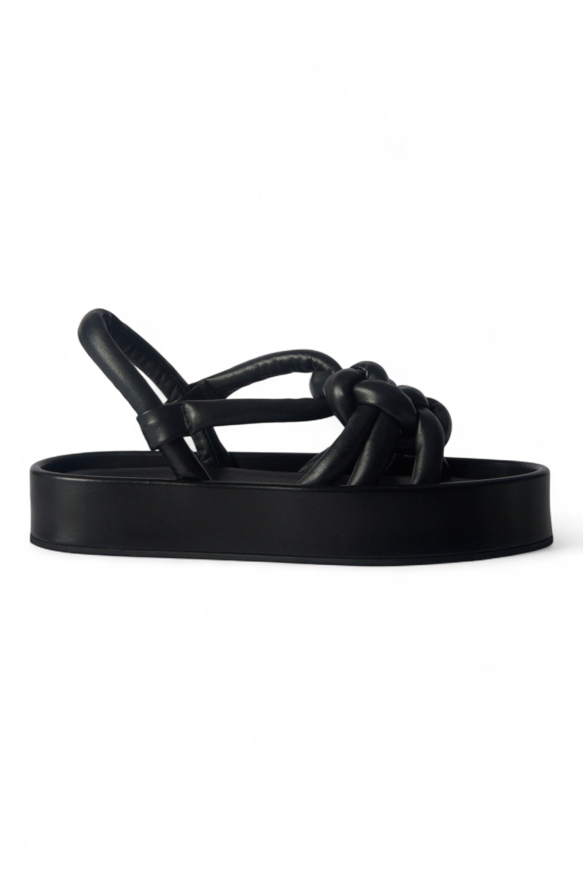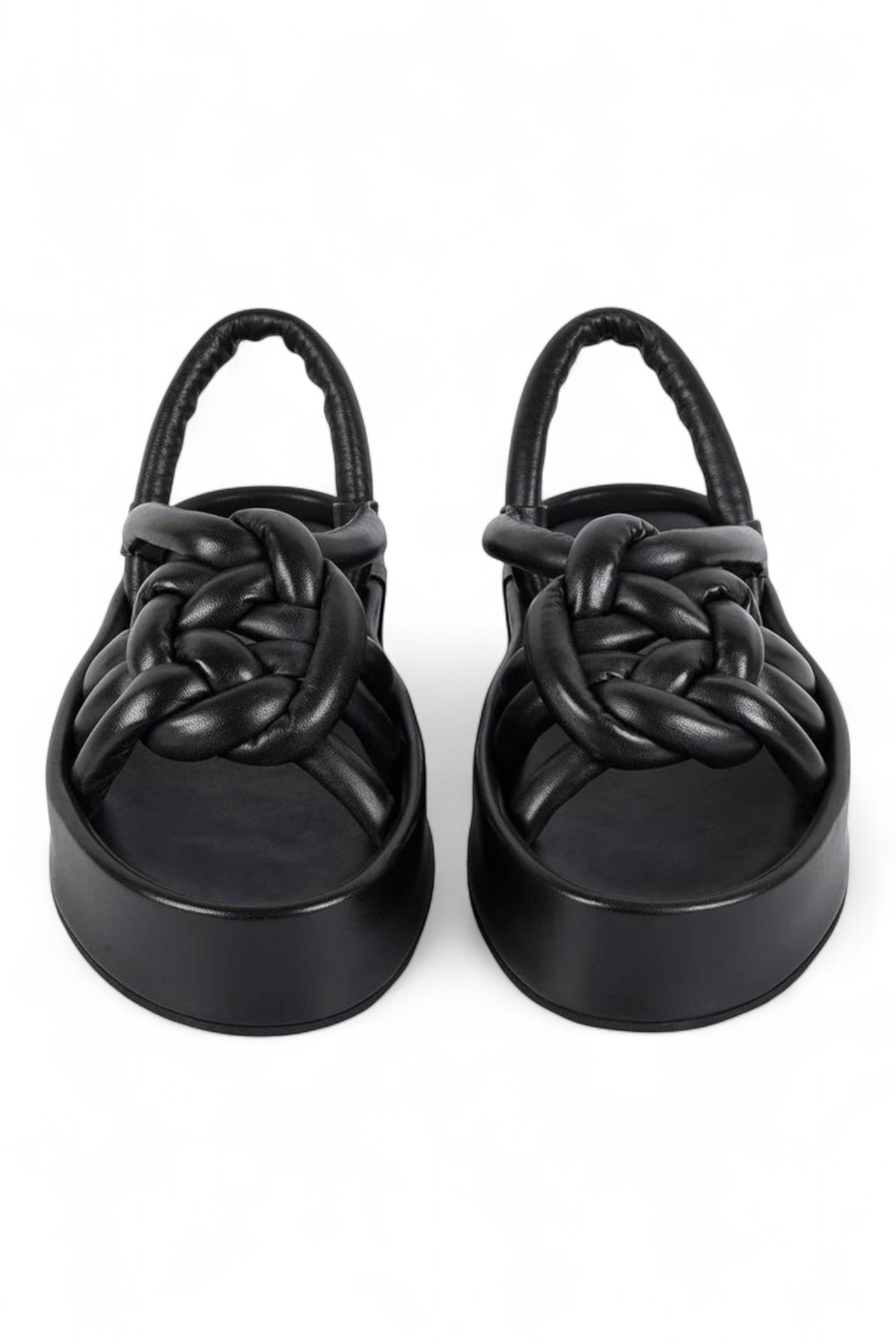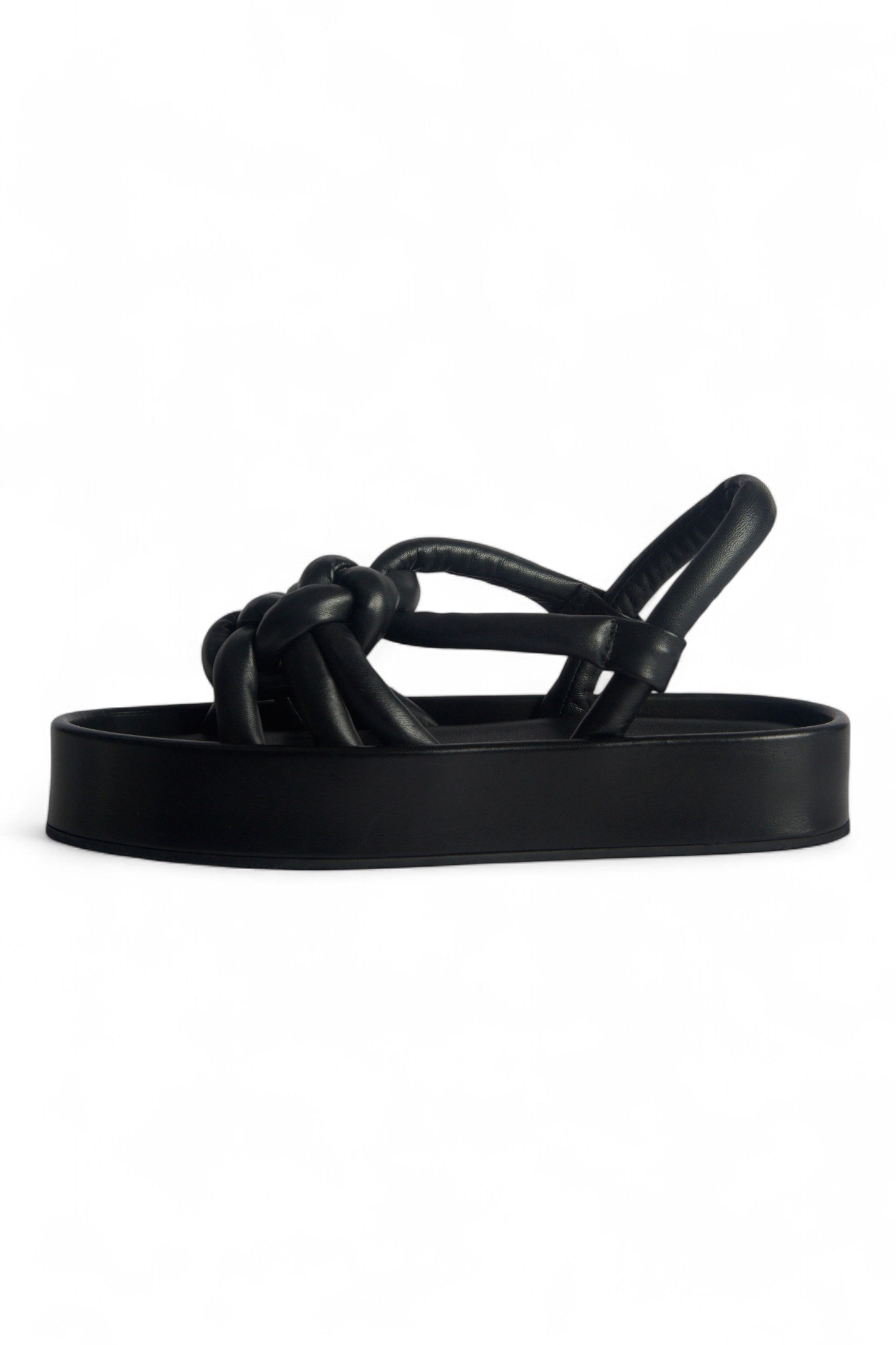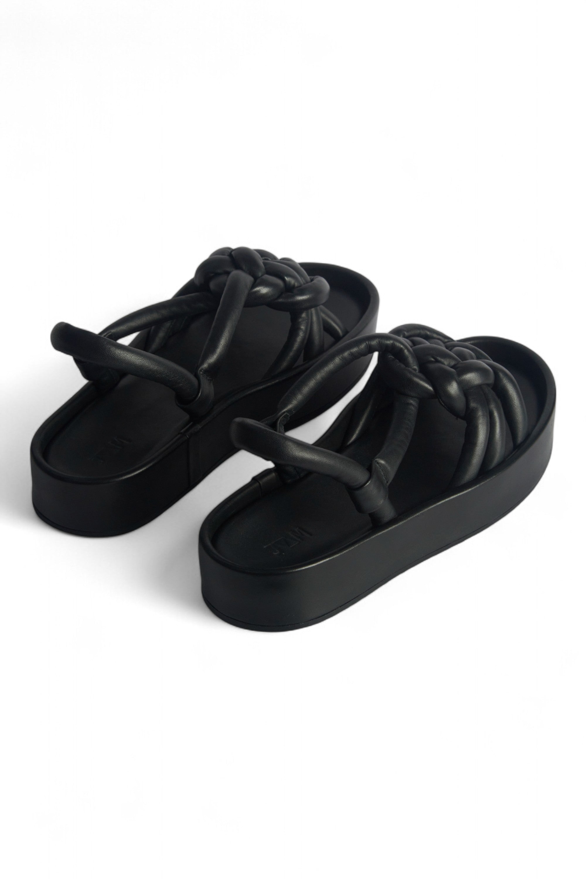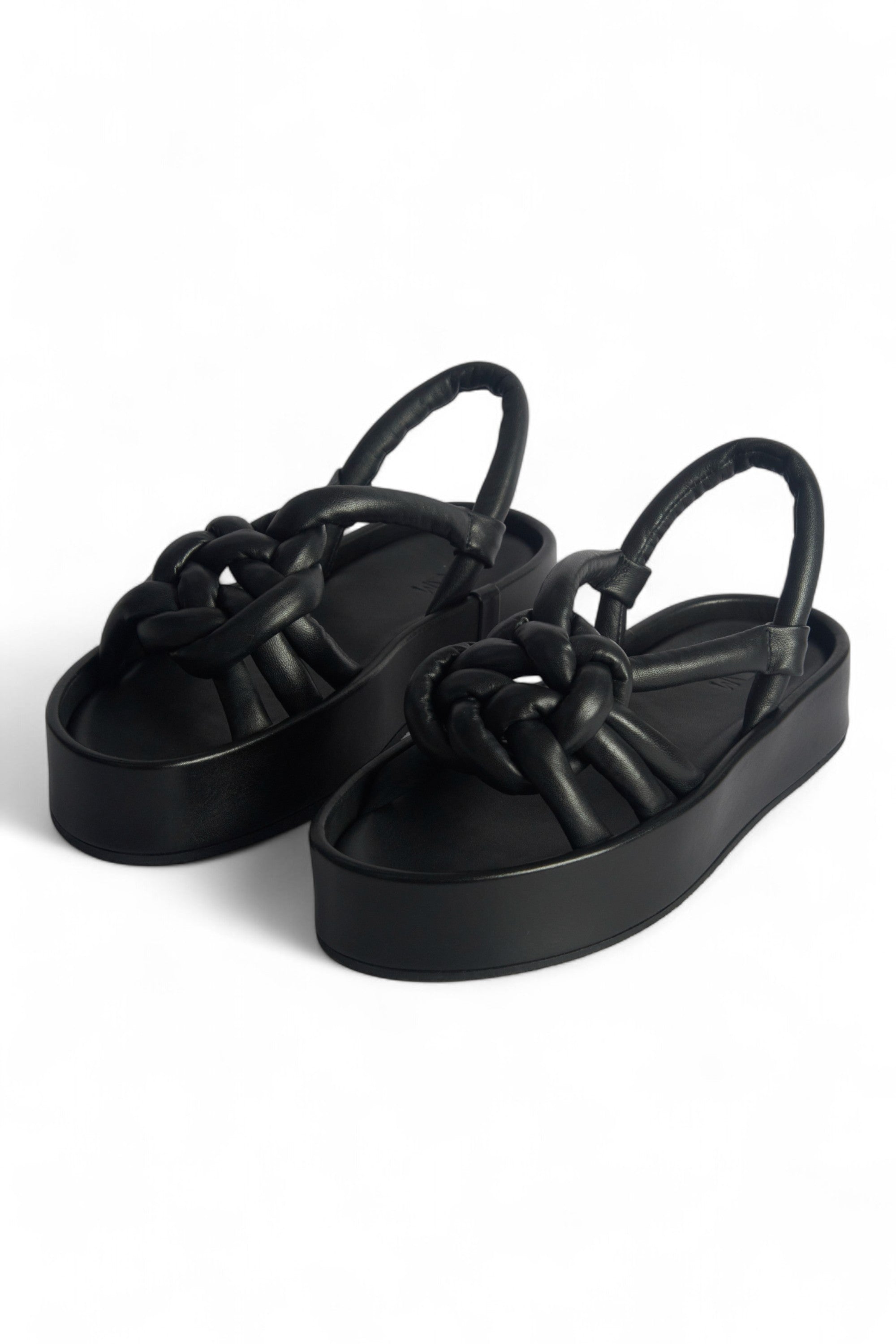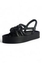 These black leather hand-knotted tubular sandals are boldly designed with a pizza dish inspired footbed and padded cushioning for comfort. By JVAM - artisanal yet modern.