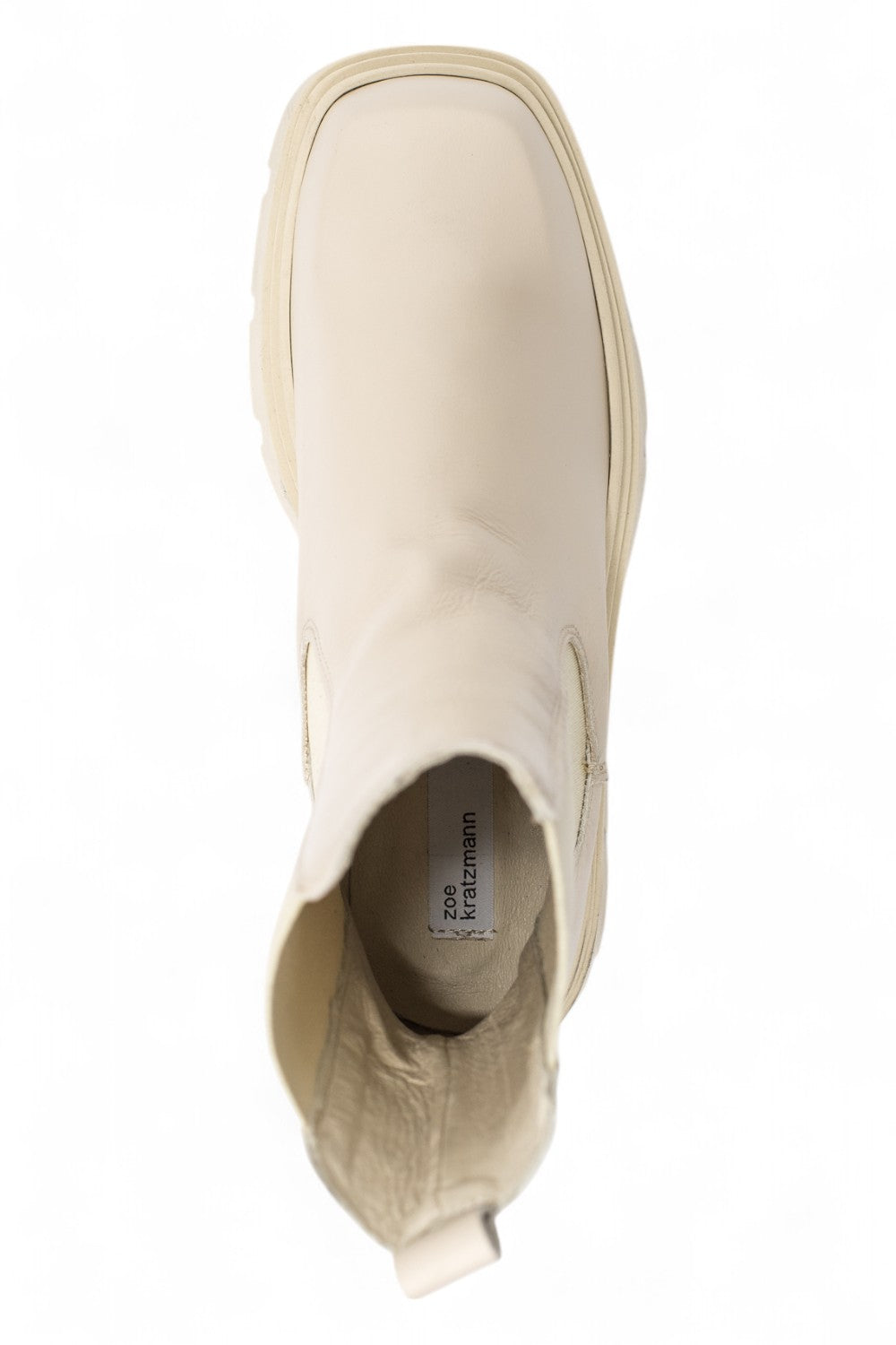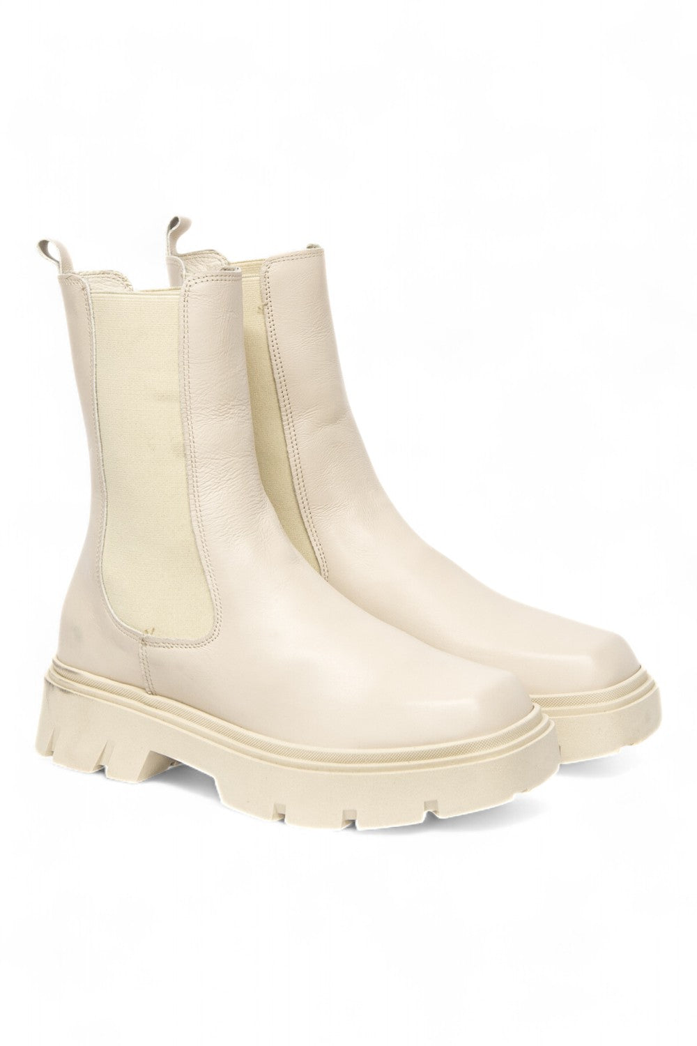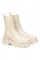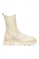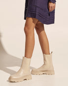 The Empire Boot by Zoe Kratzmann has a clean, cool and minimalistic aesthetic. It offers a fresh and dramatic take on a popular combat boot. These high shaft ankle boots provide a secure fit with an elasticised ankle section and a heavily treaded sole. Crafted in a smooth soft leather in a clean marble shade, they will add instant edge to autumn outfits. Also Available in Black.