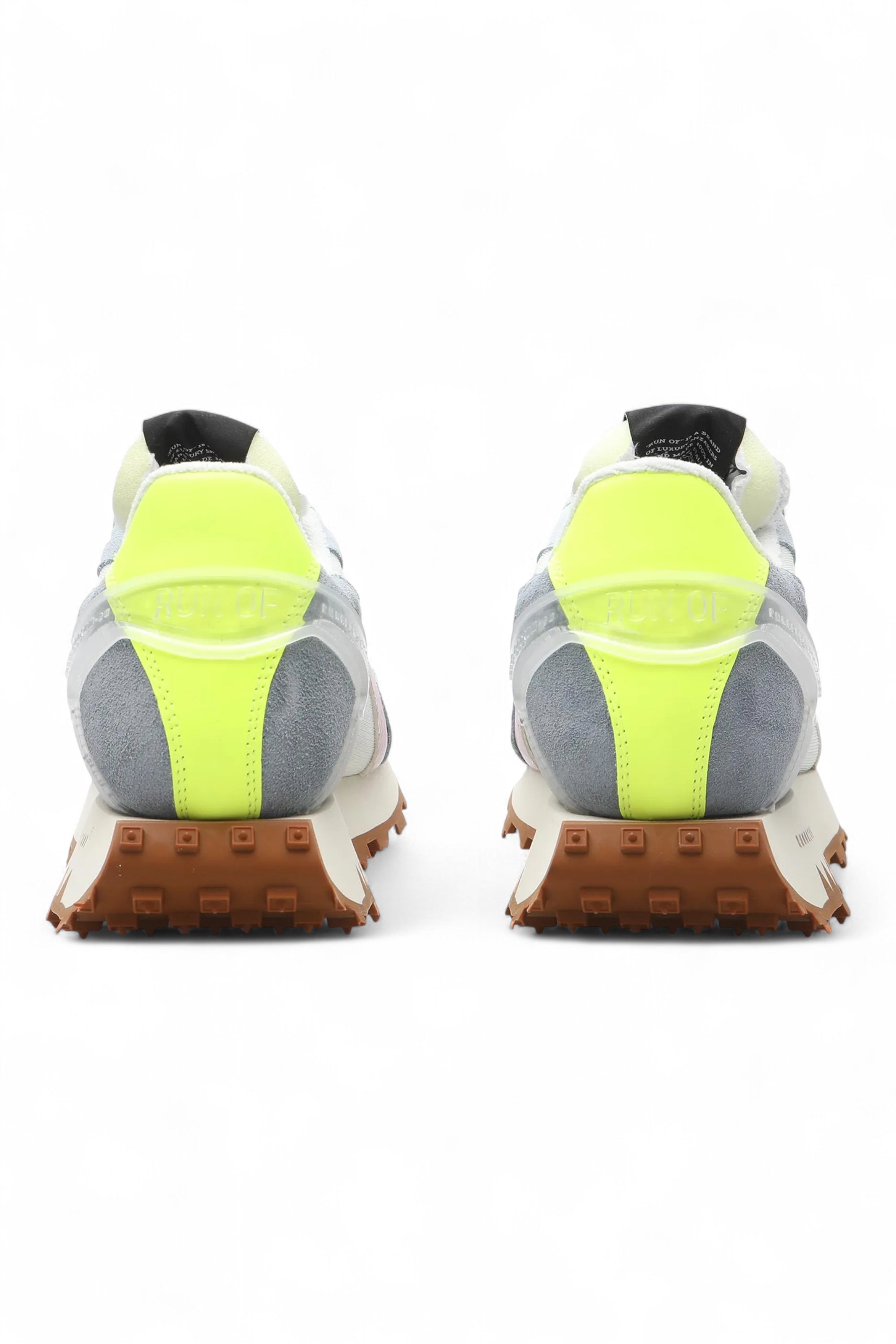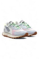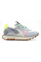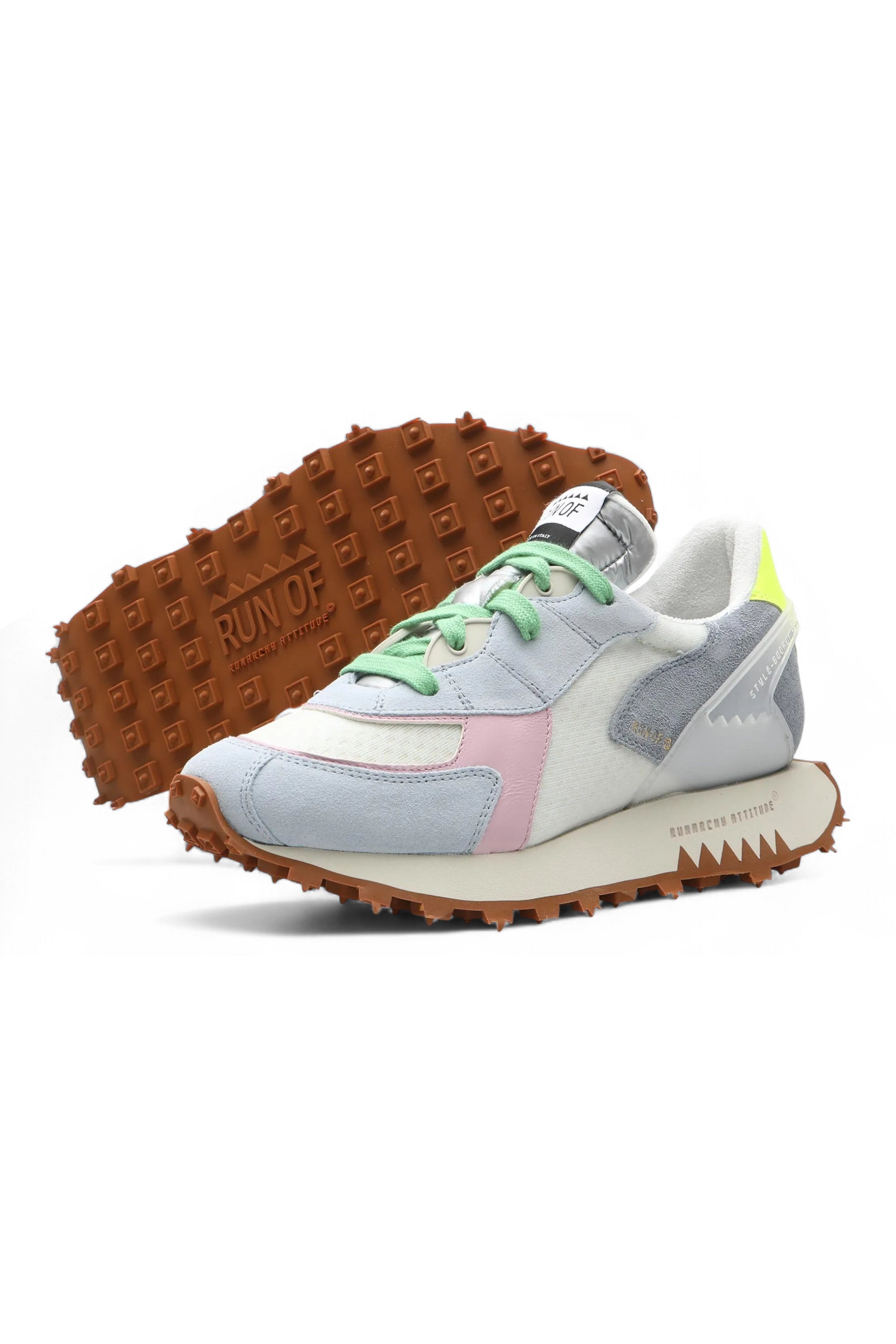 Woman sneakers in light sky suede, pink leather, mesh and plastic shoelace eyelets, with yellow leather heel tab and back rubber support in microinjection. Handmade in Italy.