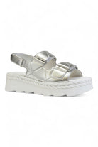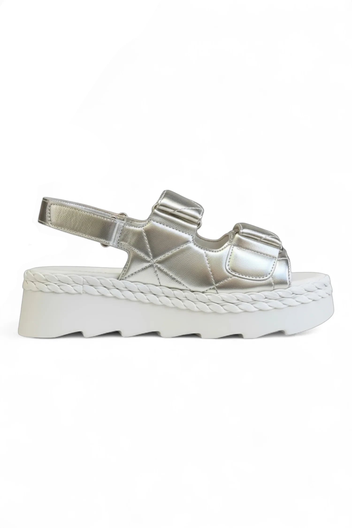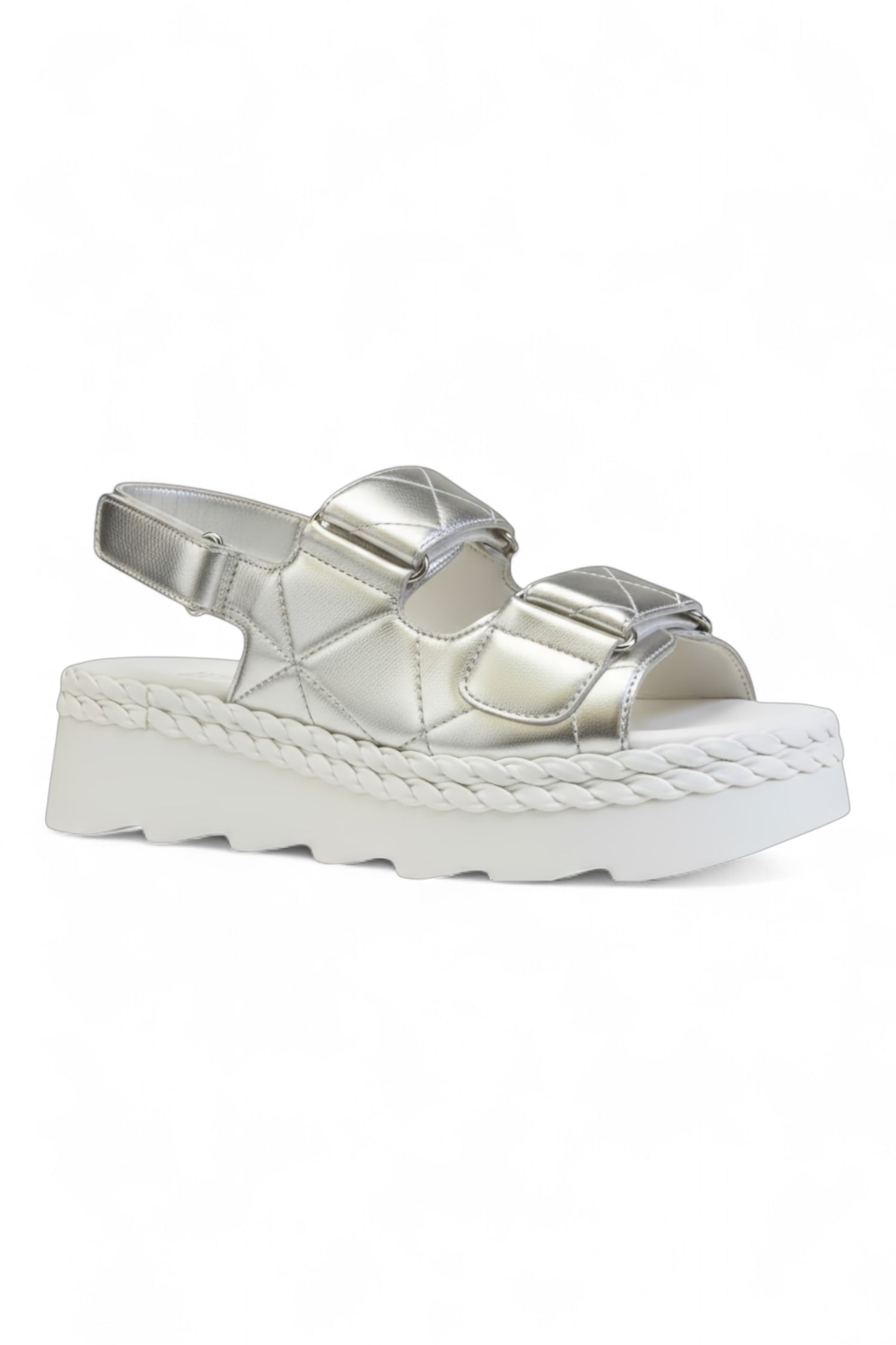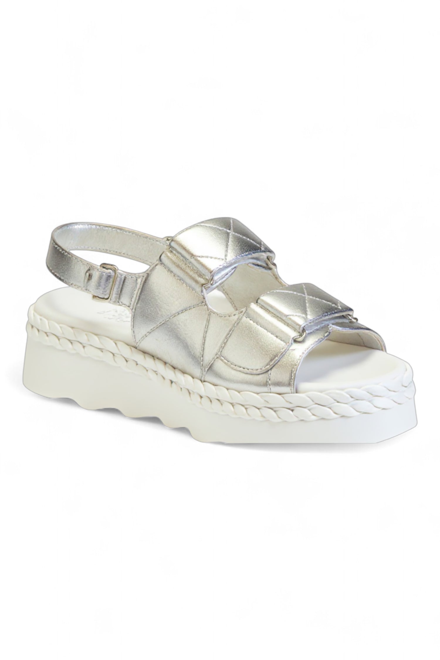A new take on our best-selling platform sandal. Situation combines an ultra-light weight platform wedge sole with feature sole plait wrap. Featuring cream leather with quilted detail on puffy padded dual velcro straps across the foot and an adjustable velcro slingback heel strap.