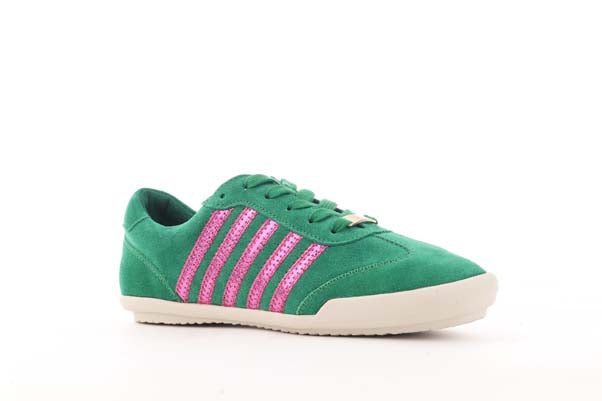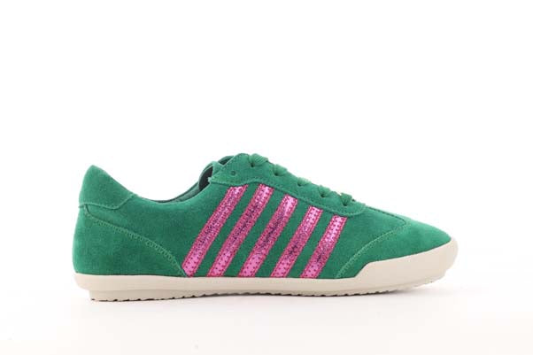 Sleek in profile this sneaker features a white-coloured rubber sole, striped white detail pink trim and a forest green leathered suede upper with new sporty terry lining. A spin on a retro classic sneaker.