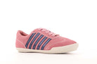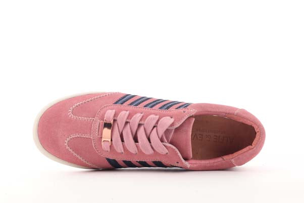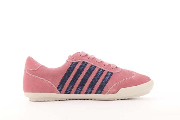 Sleek in profile this sneaker features a white-coloured rubber sole, striped white detail Navy metallic stripe trim and a gorgeous rose pink leathered suede upper with new sporty terry lining. A spin on a retro classic sneaker.