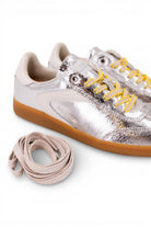 Spectacular without being excessive, the Nova Galaxy features cracked metallic leather that instantly catches the eye. Its textured silver effect creates a striking contrast with the smooth leather inserts, giving it a futuristic yet surprisingly easy-to-wear look. The caramel sole provides the necessary balance, softening the overall look and making it truly versatile. Its yellow laces add a touch of pep. It`s the perfect sneaker to brighten up any outfit: it transforms a simple pair of jeans and a white T-shirt into a bold look, while remaining comfortable for everyday wear. A bold pair for those who love a touch of confidence.