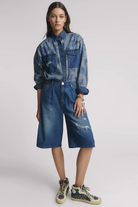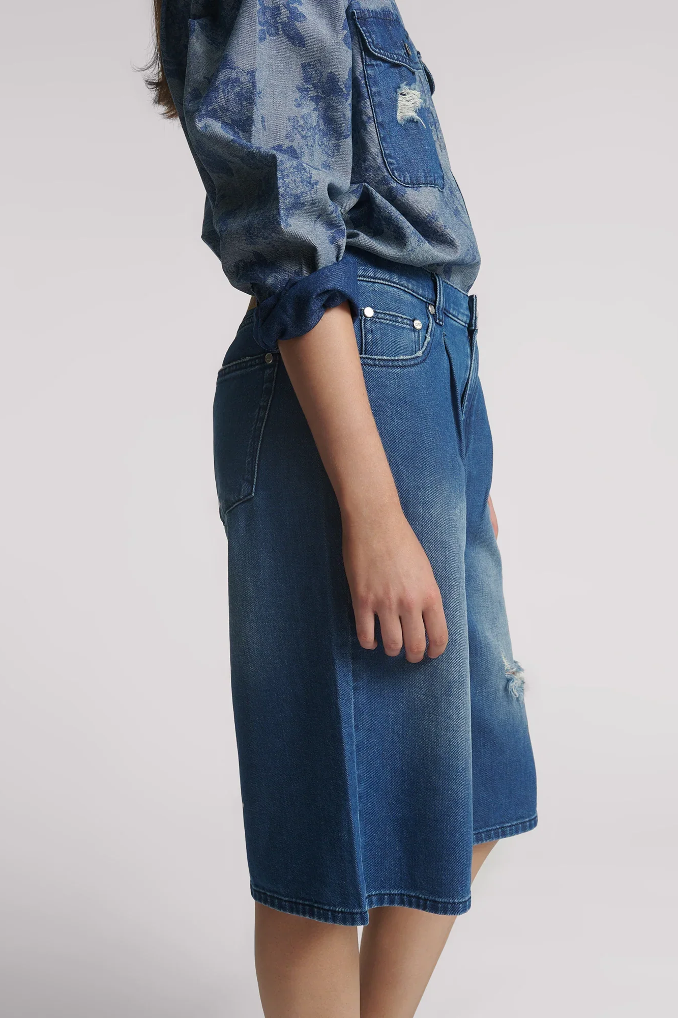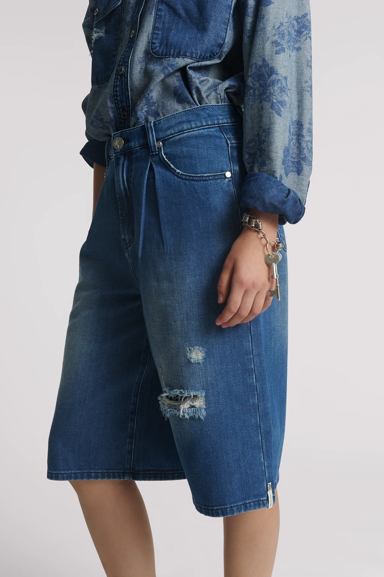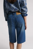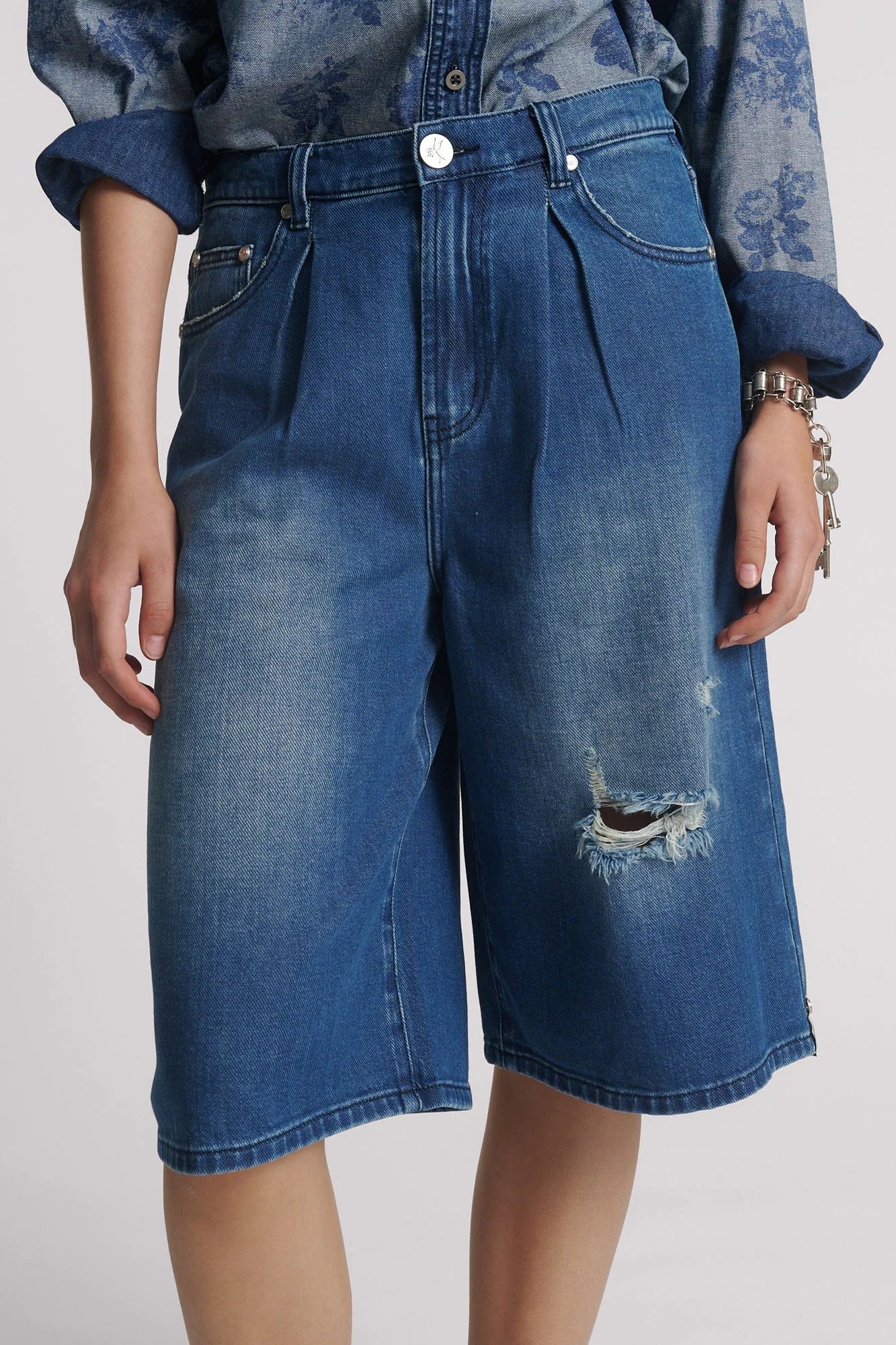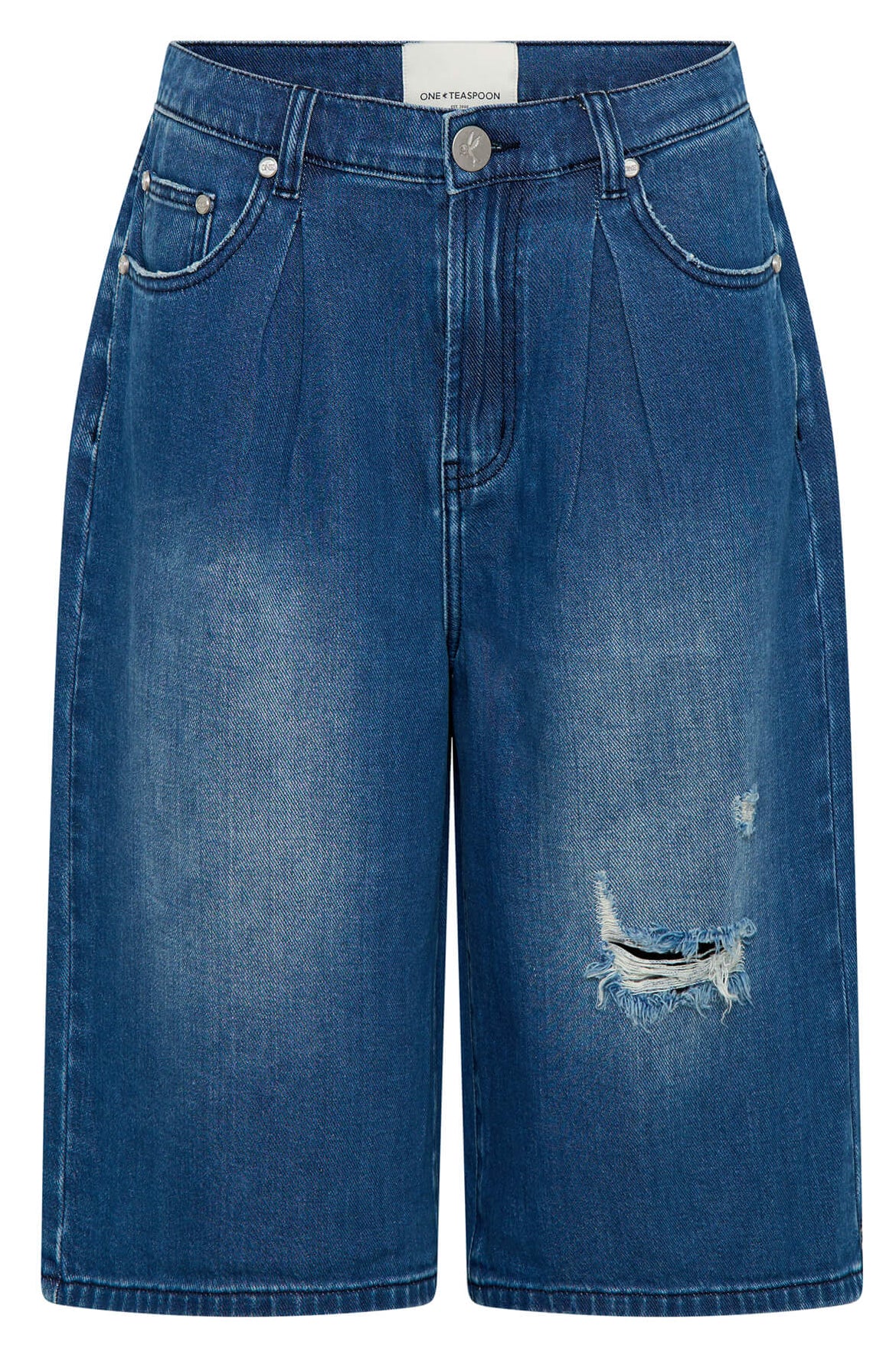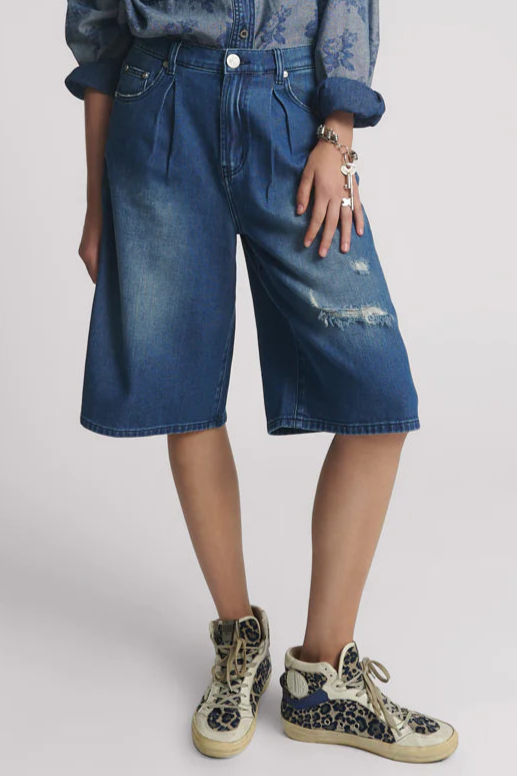 THE BEASTIE LOW WAIST WIDE LEG DENIM SHORTS are the ultimate boyfriend skater short. Low waist, long and super wide through the leg with pleated tailoring at the front waist.