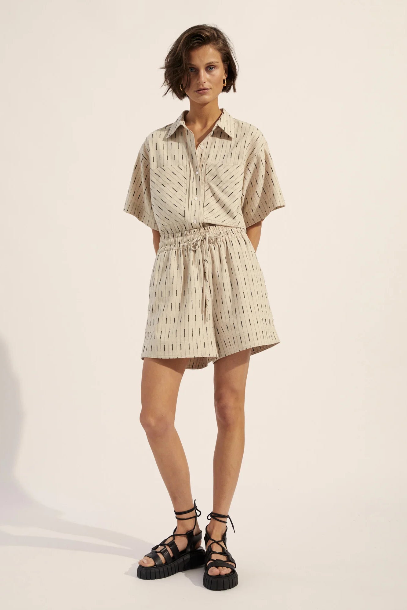 The Joist Short by Zoe Kratzmann is a flattering lightweight short tailored to every type of figure. An elasticated waist is finished with a drawstring tie for the ideal amount of detail. A top-stitched hem ensures a quality finish whilst oversized patch pockets lend a playful edge. Also Available in Safari, Black, White, Chambray, Blue Stripe, Liquorice and Caramello.