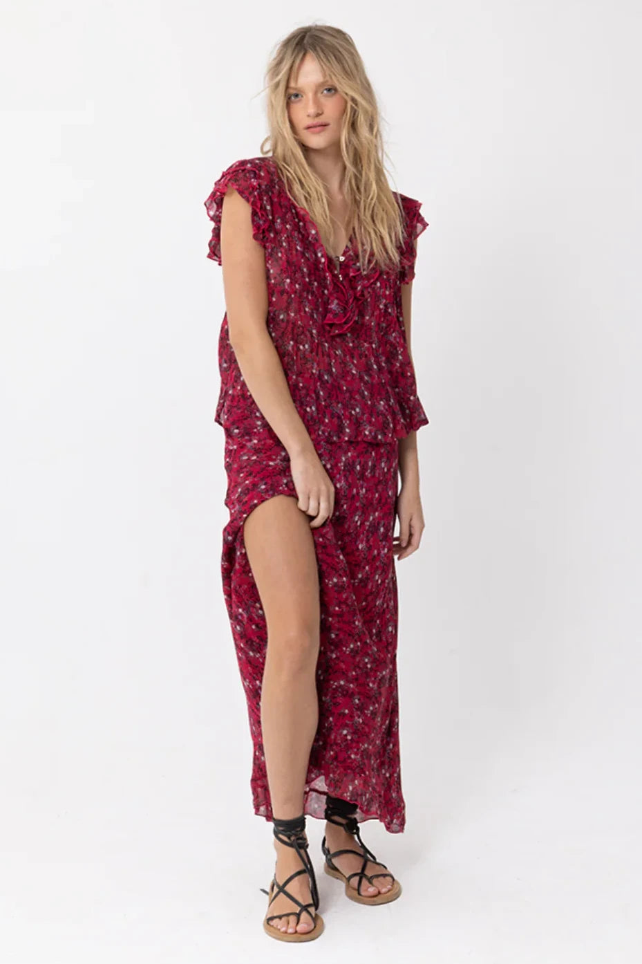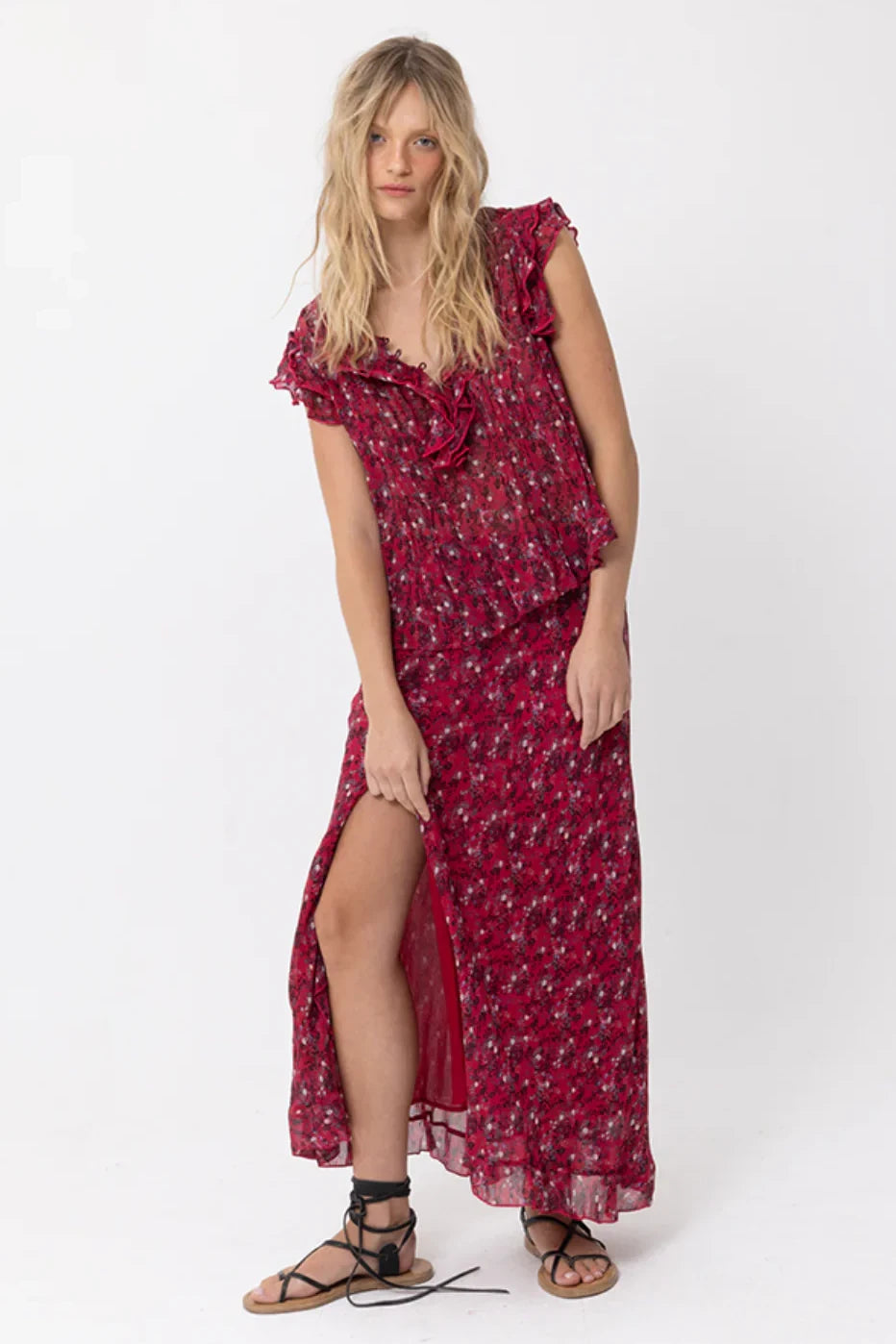 Made from luxurious crinkle viscose, the Captivate Skirt in French Floral Scarlet is the perfect blend of elegance and ease. With a soft drape and romantic ruffle trims, this double-layered, bias-cut silhouette flows beautifully with movement. The French-inspired floral print features subtle touches of sand, blue, green and pink, making it a versatile addition to your wardrobe. A comfortable elastic waist ensures a flattering and easy fit — ideal for pairing with anything from soft knits to matching blouses.