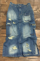 Denim Maxi Skirt with side cargo pockets and general areas of distressing. Brown contrast stitching against the mid blue washed denim. Stud button closure with front zip and elasticated waist at back.
