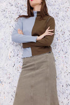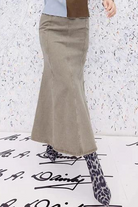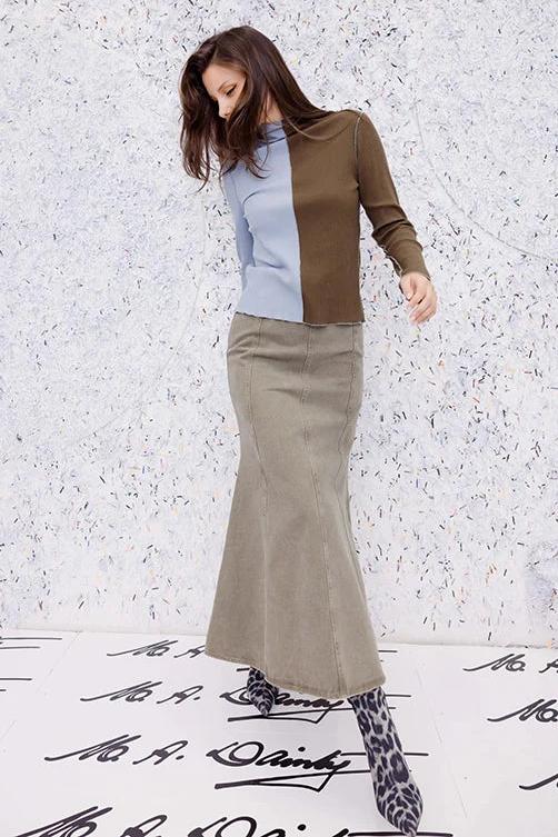 The Mermaid Denim Skirt in Caper, from Maud Dainty. Made with high-quality denim, this skirt features a flattering silhouette of vertical panels that will accentuate your curves. Flicks out in the below the knee for a great fit and easy movement.