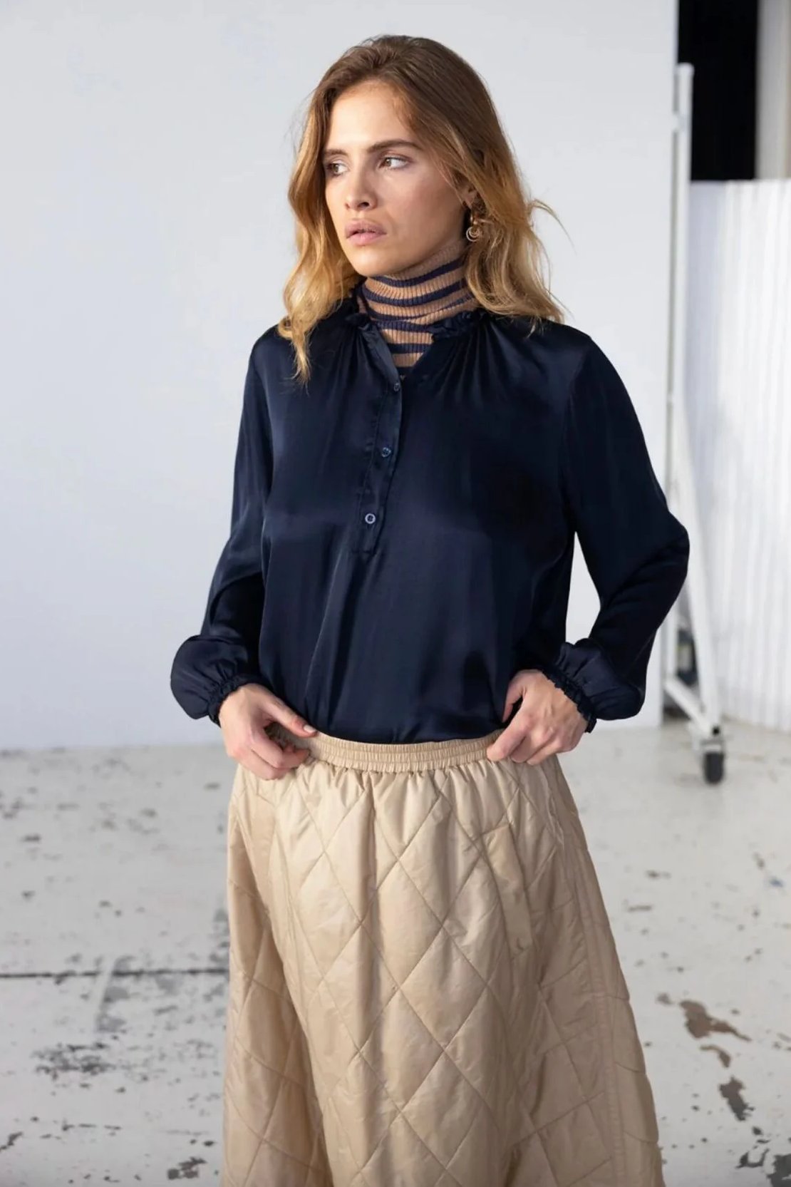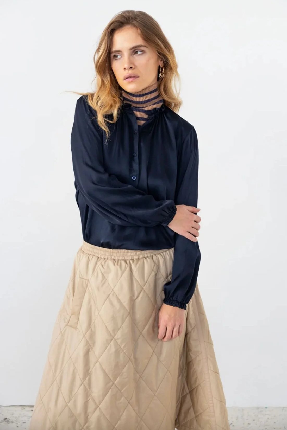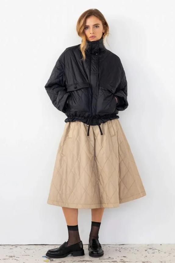 NICOLINE is a midi skirt made of lightweight, insulated and padded nylon. It has two slanted side pockets and an elasticated waistband. NICOLINE is adorned with a narrow matching band in each side of the A-shaped skirt.