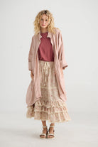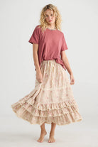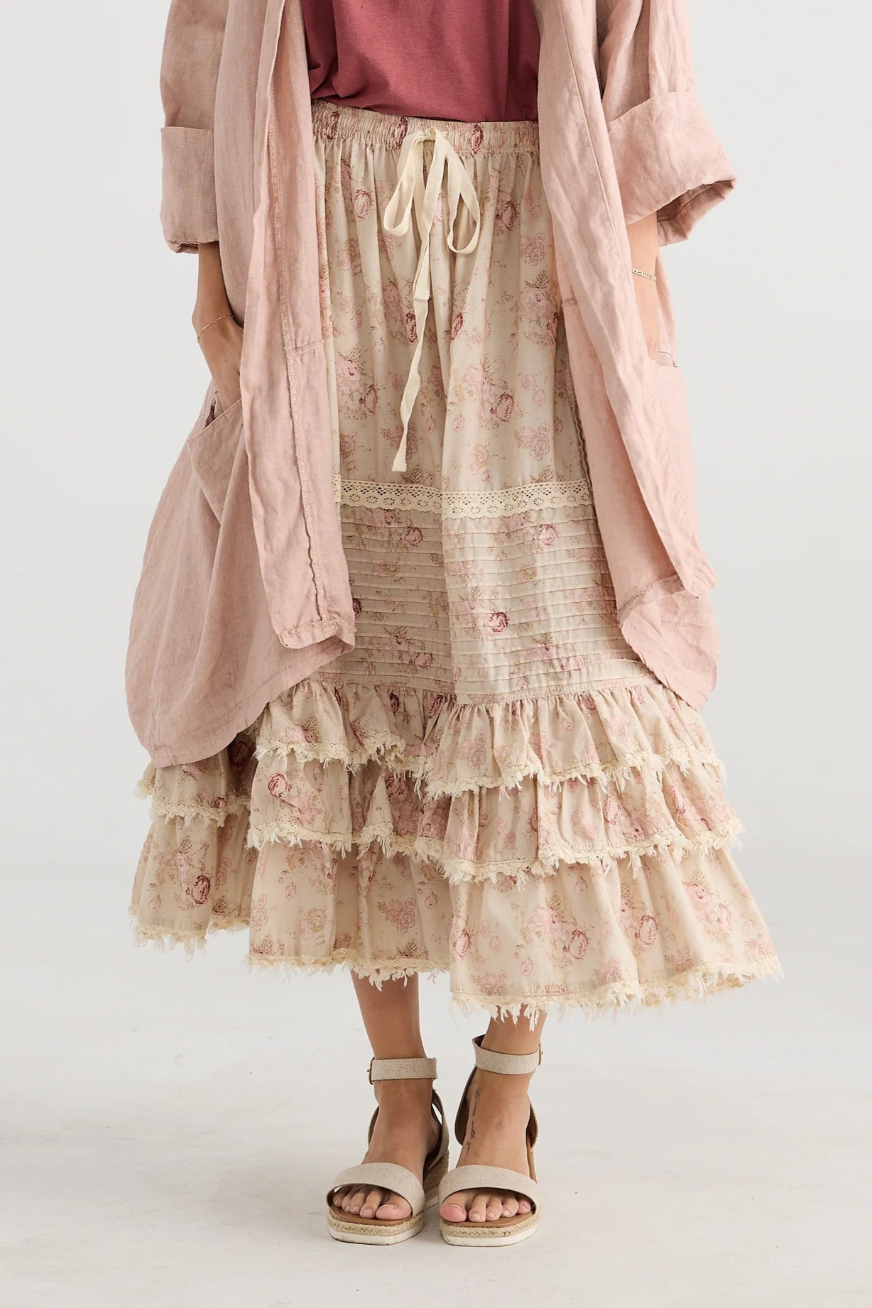 Perdita is the kind of skirt that makes your heart skip a beat! With its lace-edged ruffles and a wide band of pintucks, not to mention the soft faded rose design, this skirt is for twirling and dancing. Simply the most feminine and extravagantly wonderful skirt ever.