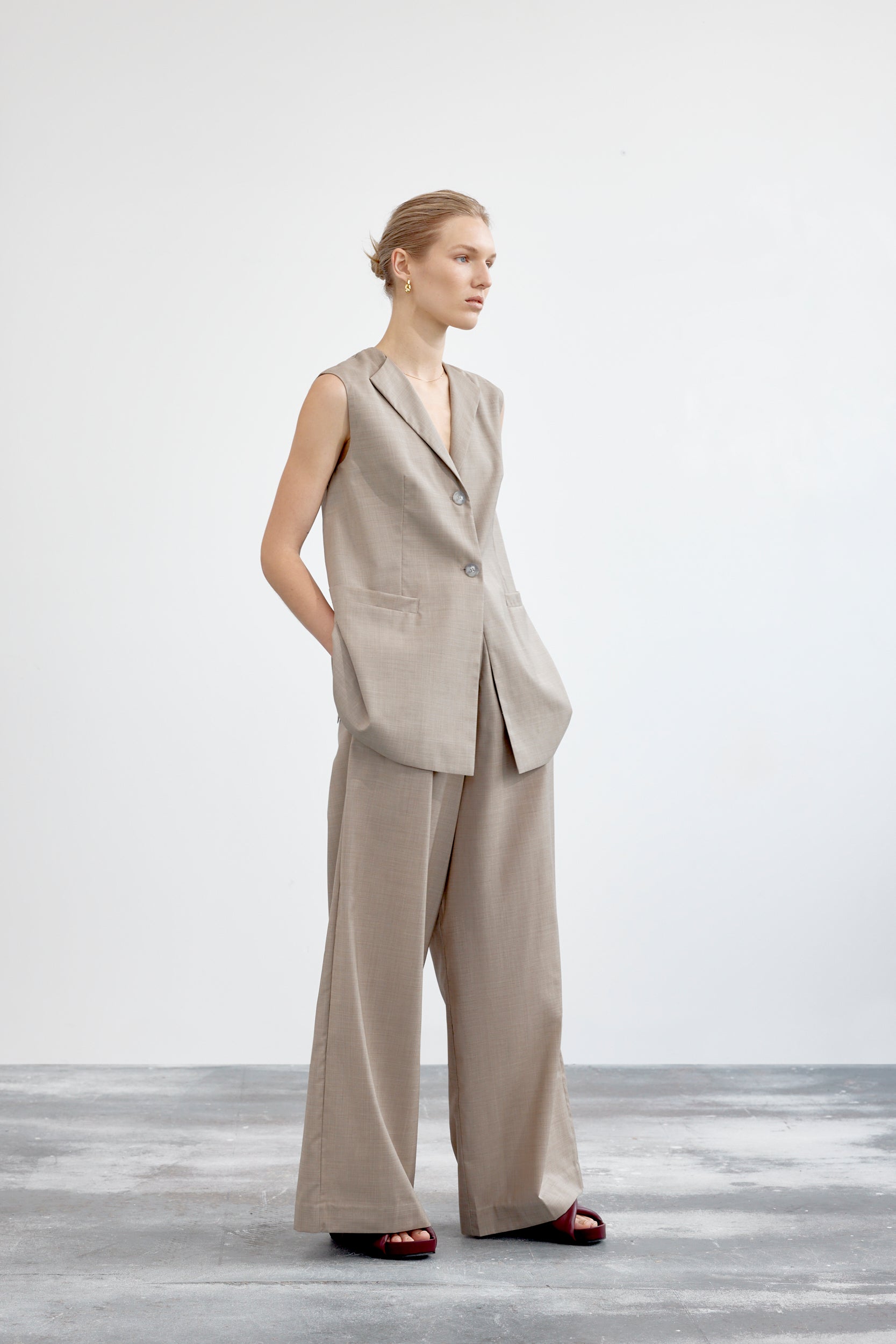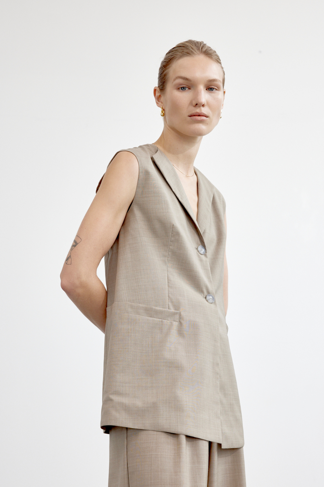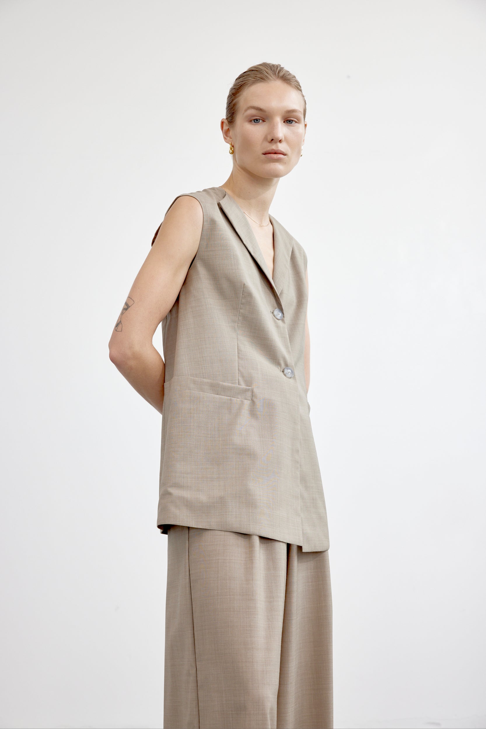 A fresh interpretation of a classic menswear vest combining effortless style and fine tailoring details. The sleeveless silhouette is constructed with sharp lapels, double button fastening, patch pockets at the waist and a rear vent. Forgo a shirt for a cool ‘90s look.