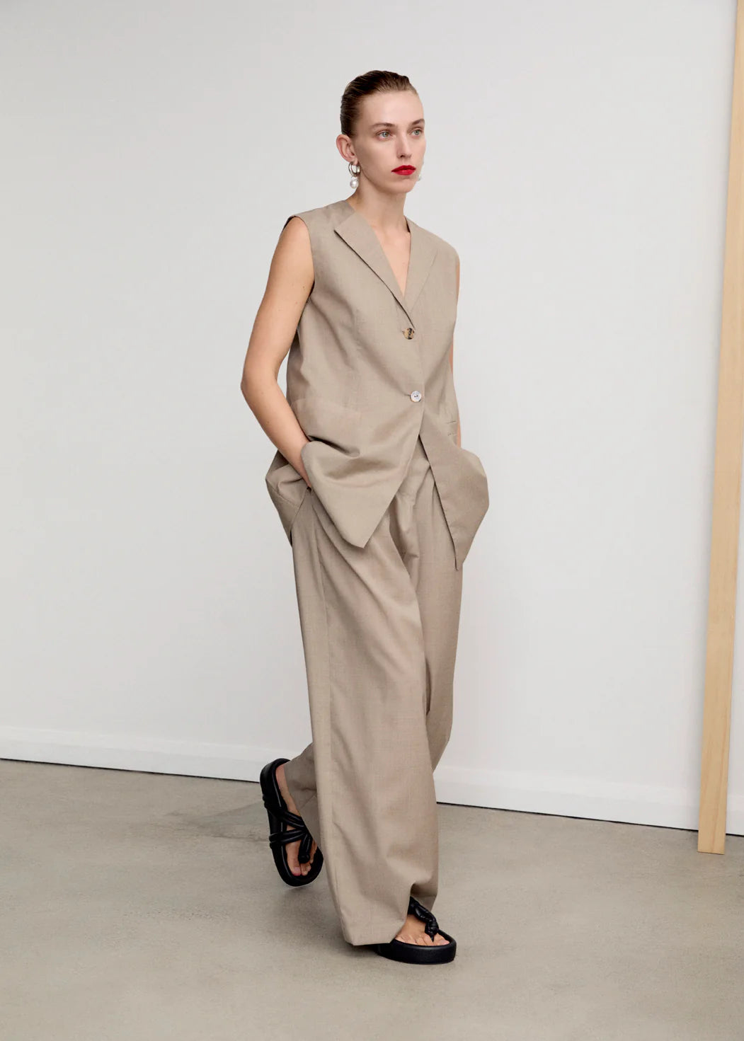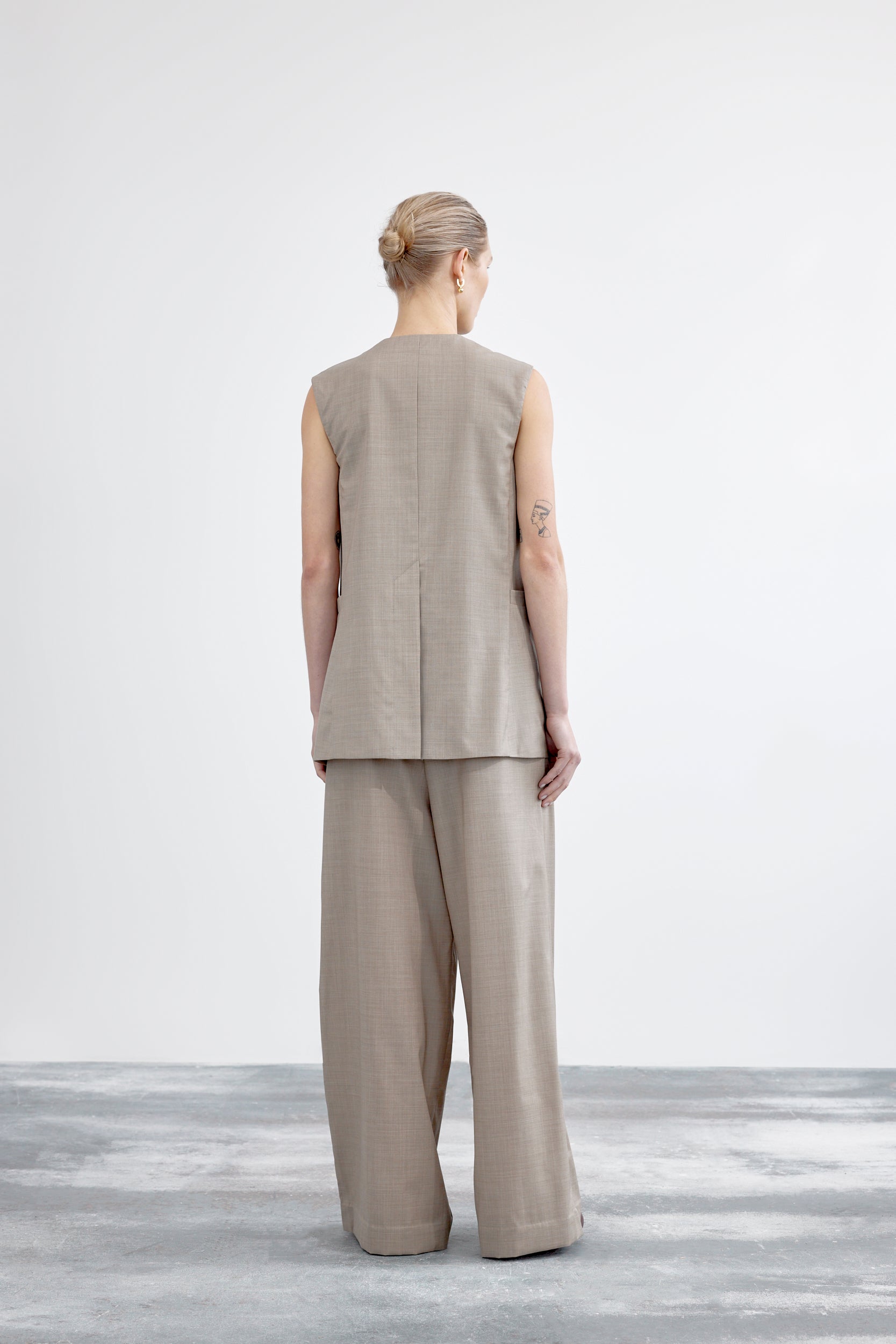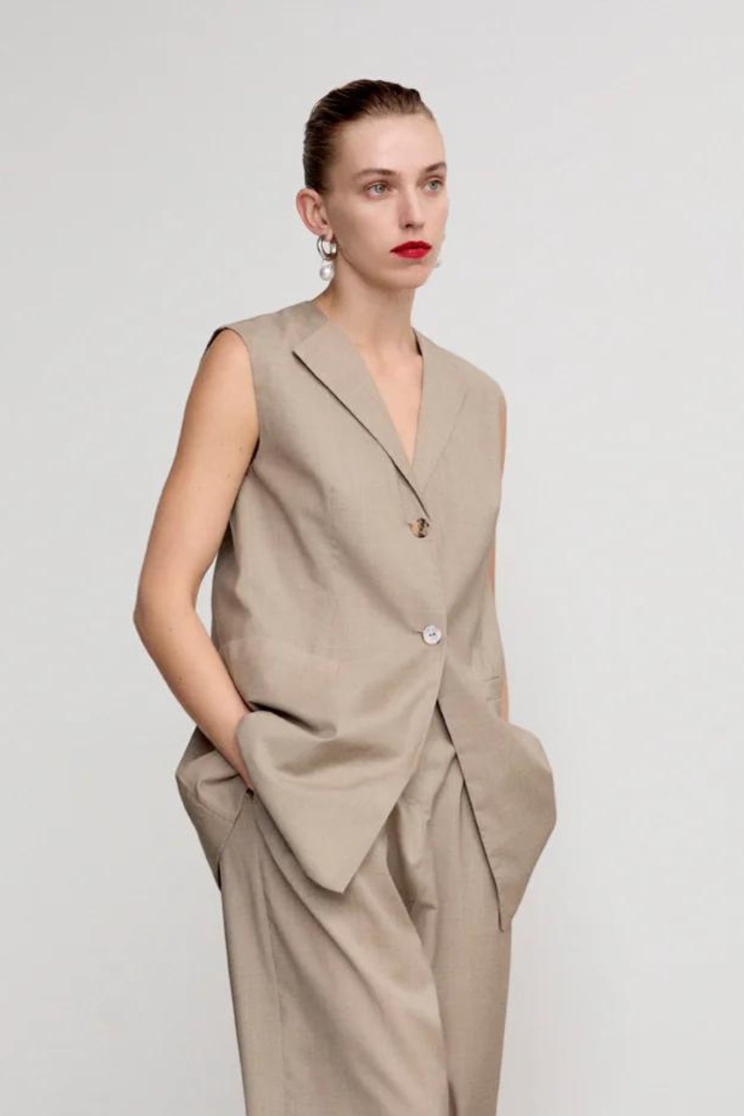 A fresh interpretation of a classic menswear vest combining effortless style and fine tailoring details. The sleeveless silhouette is constructed with sharp lapels, double button fastening, patch pockets at the waist and a rear vent. Forgo a shirt for a cool ‘90s look.