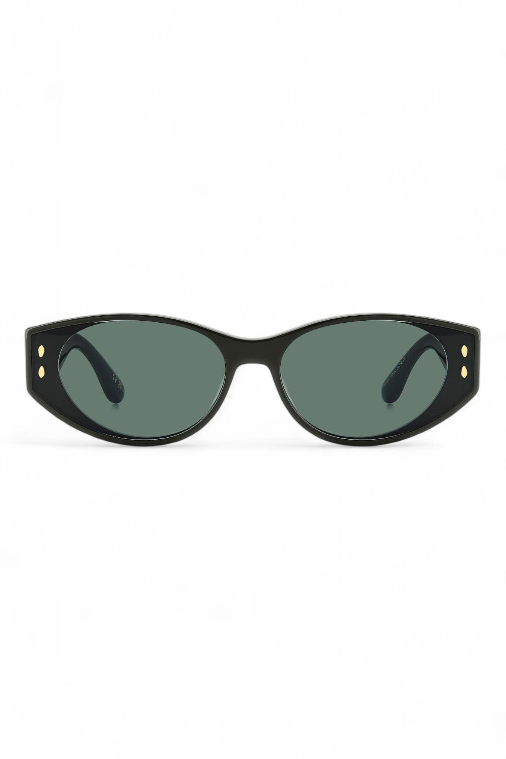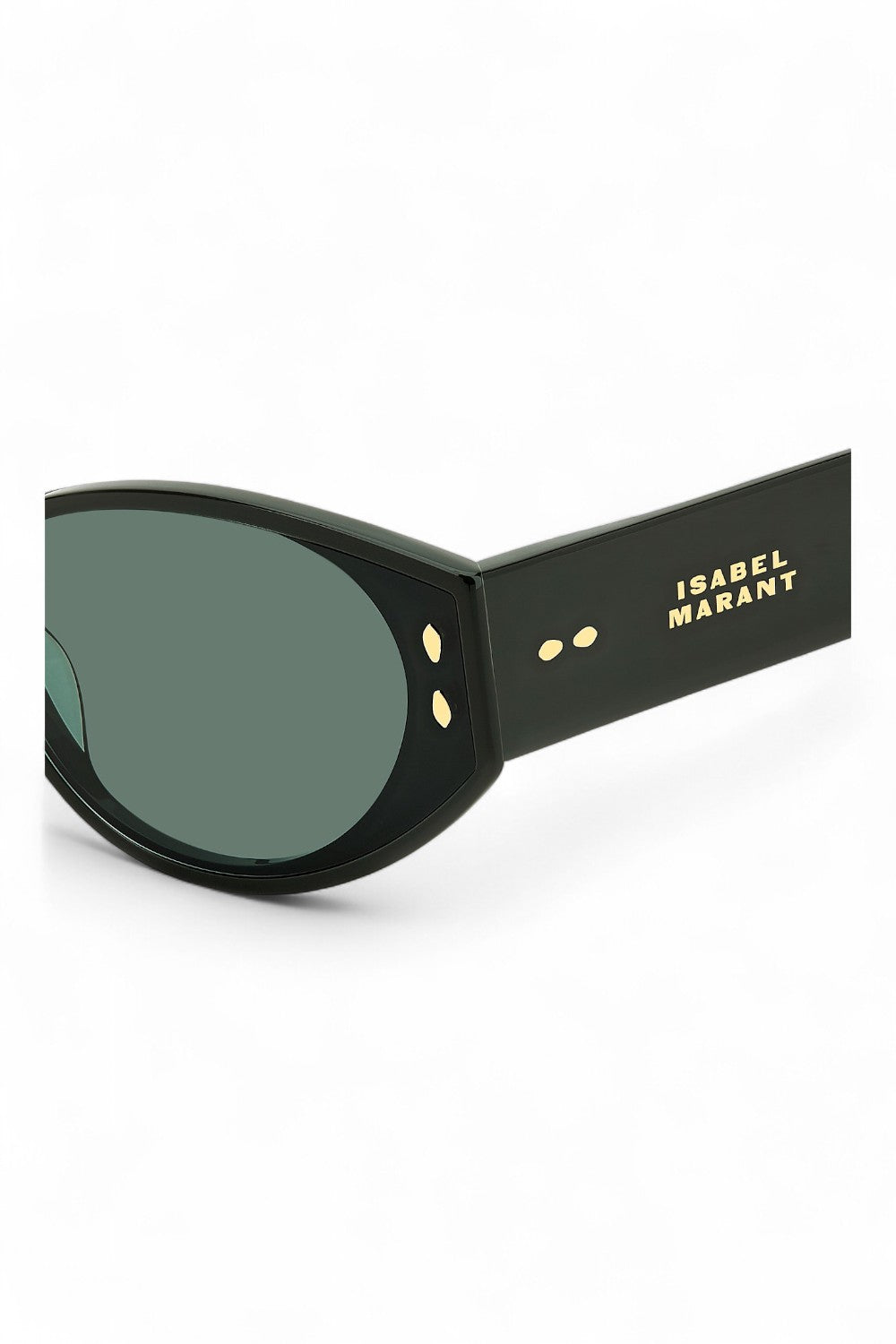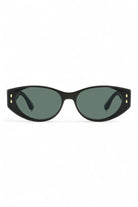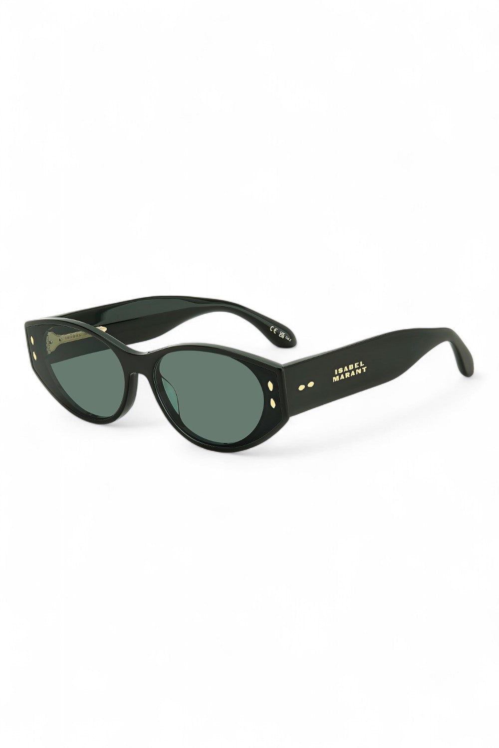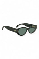 The Isabel Marant IM 0185/G/S sunglasses will elevate any ensemble with a hint of Parisian allure. Crafted as an ultra-flat oval silhouette, this exceptional design features a premium dark green acetate frame enhanced with chunky temples and silver metal rivets celebrating the brand's iconic leaf motif. Paired with matching green lenses, this design showcases a modern double frame effect that will make a statement with every wear whilst protecting your eyes from high UV rays.