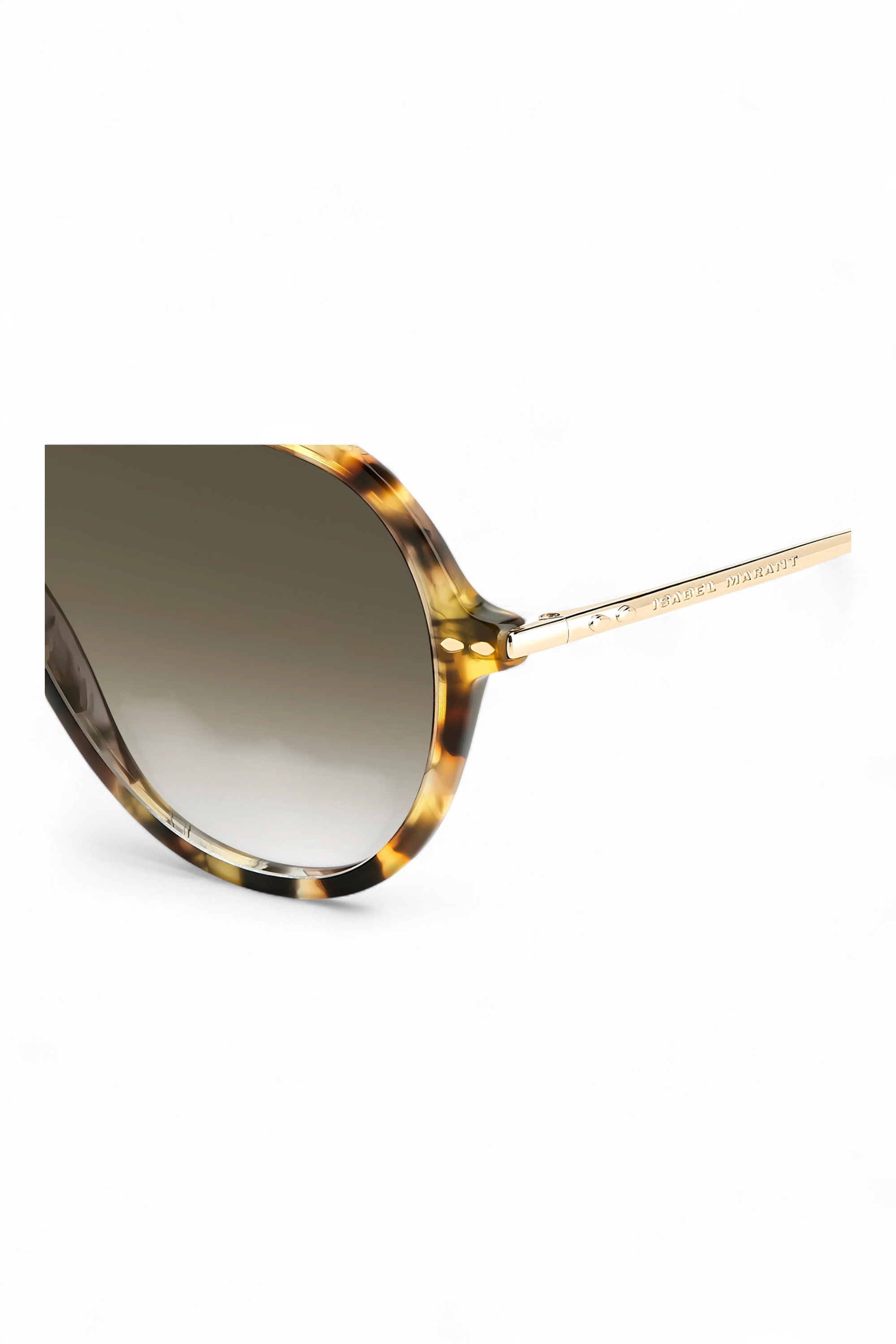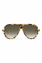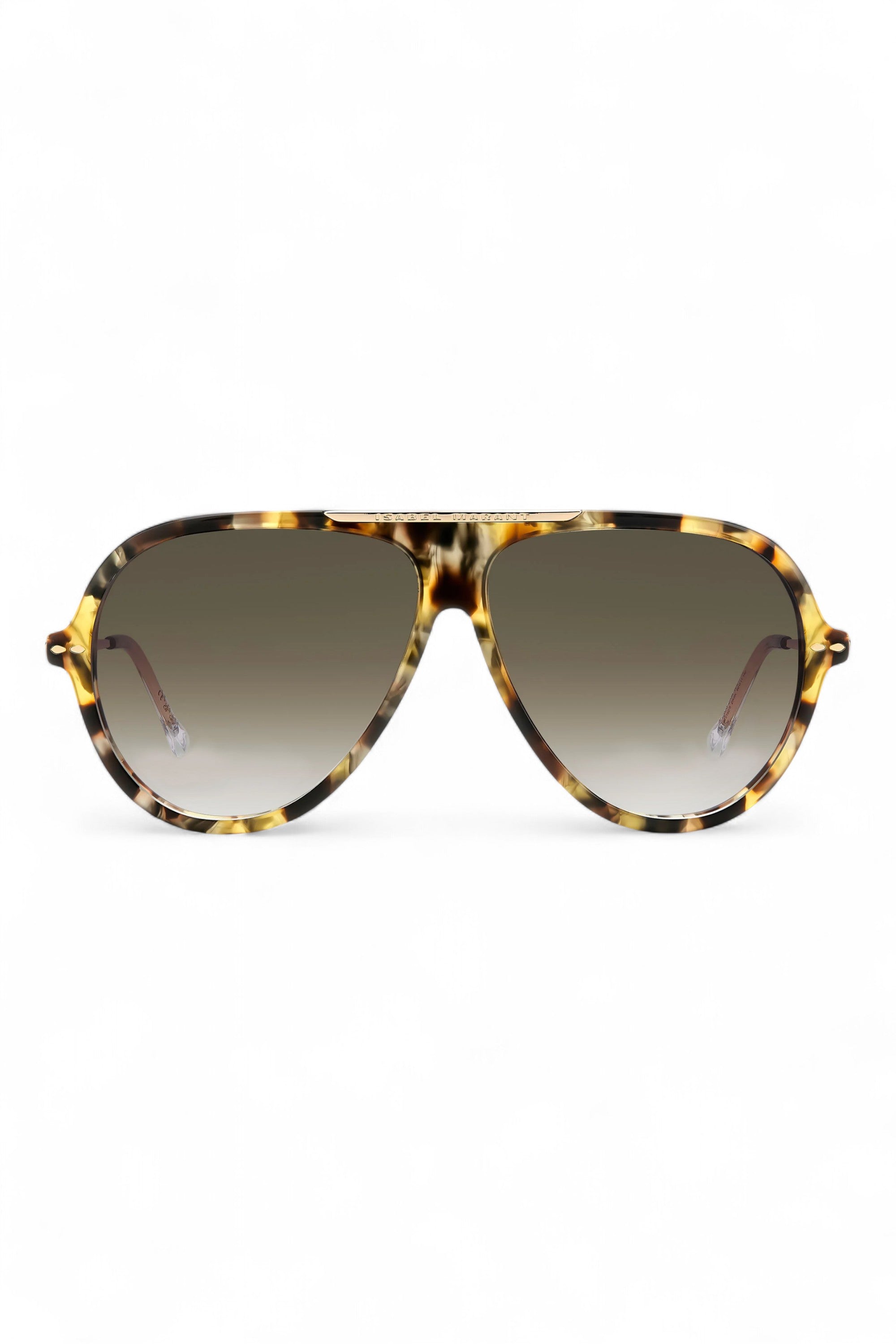 Isabel Marant IM 0162/S 22I 9K havana gold acetate aviator Sunglasses. Timeless style but with the exclusive allure of Isabel Marant: the Luck eyewear collection enriches an iconic pilot silhouette with slim profiles and a glamorous logo-detailed metal top bar. Spanning classic shades and pop hues in true Isabel Marant style, these sunglasses are embellished with leaf-shaped rivets and end tips as a stylish ode to the fashion house's hallmark codes.