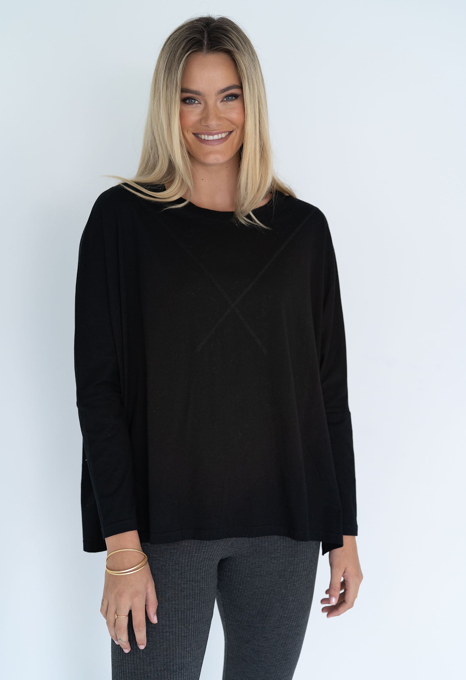 Easy throw-on style that fits all! With our signature oversize fit, long sleeves with large side splits in one size only. Style easily and effortlessly for lounging or a coffee run! We love this tee with our Humidity Lounge Pant, or as pictured with our Slouch Pant.