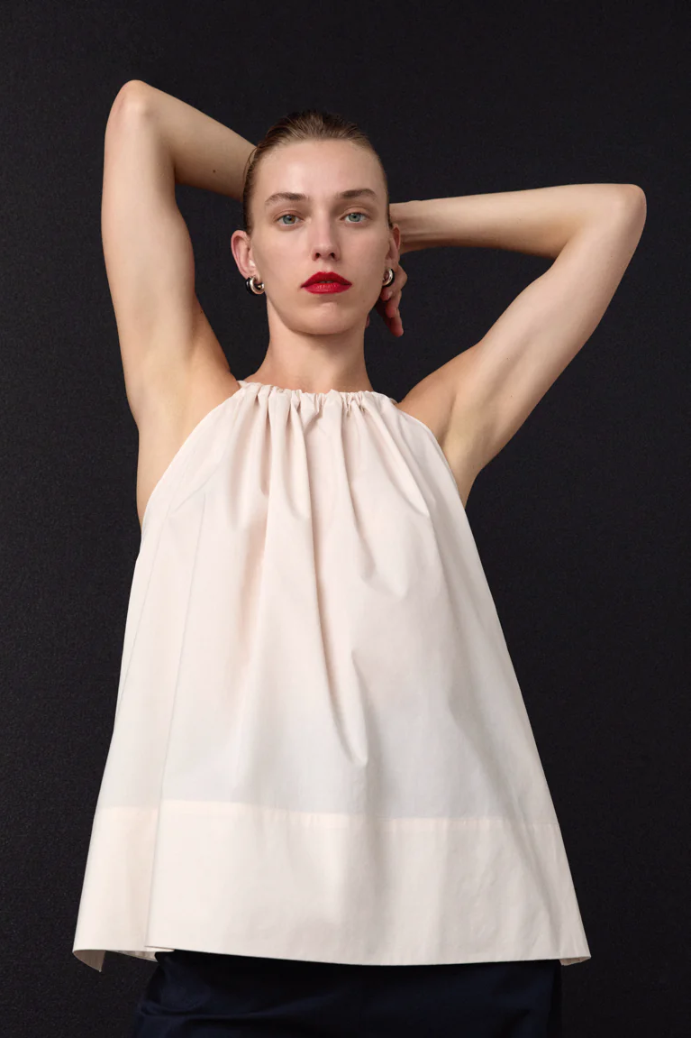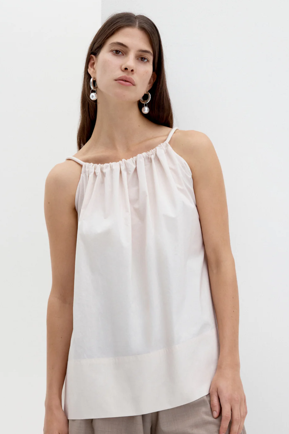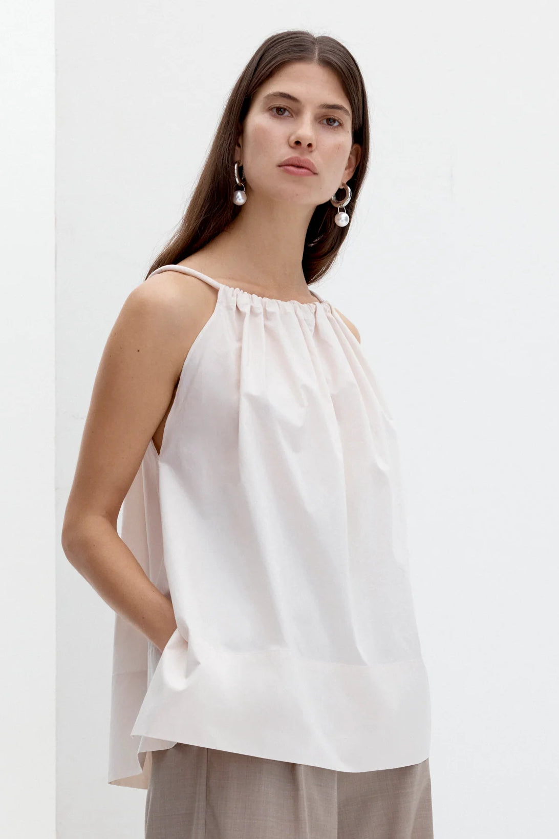 A delicate top sleeveless top with added volume, long-line side splits and a deep hem that floats effortlessly with movement. Framed by a chic gathered high neck that connects to a low back by trailing and adjustable covered rope ties.