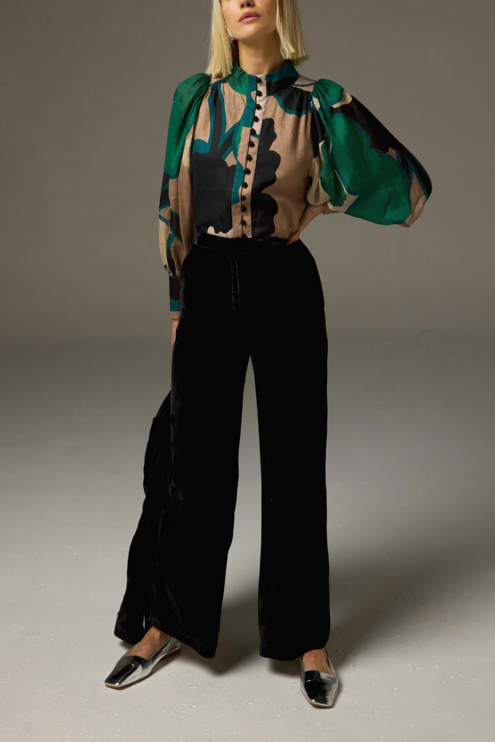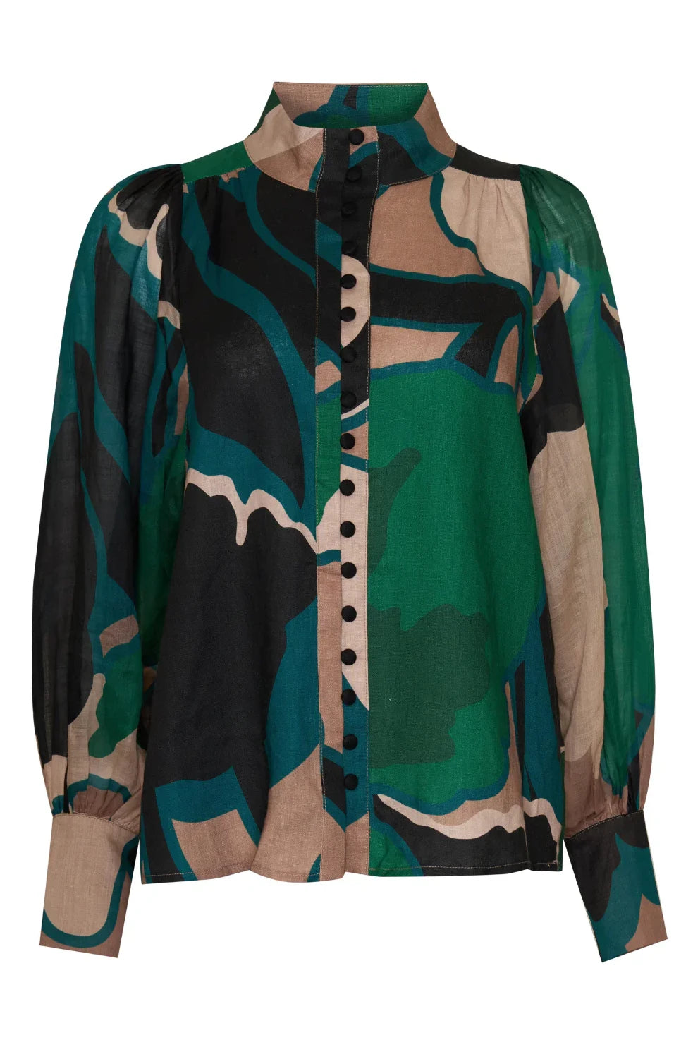 A blend of structured elegance and airy sophistication, the Atlas in organic botanic takes centre stage this season. This best-selling piece brings a high neckline punctuated by refined covered buttons, while extravagant sleeves crafted from lightweight ramie add voluminous proportions. see product details below.