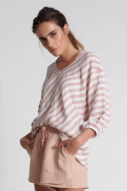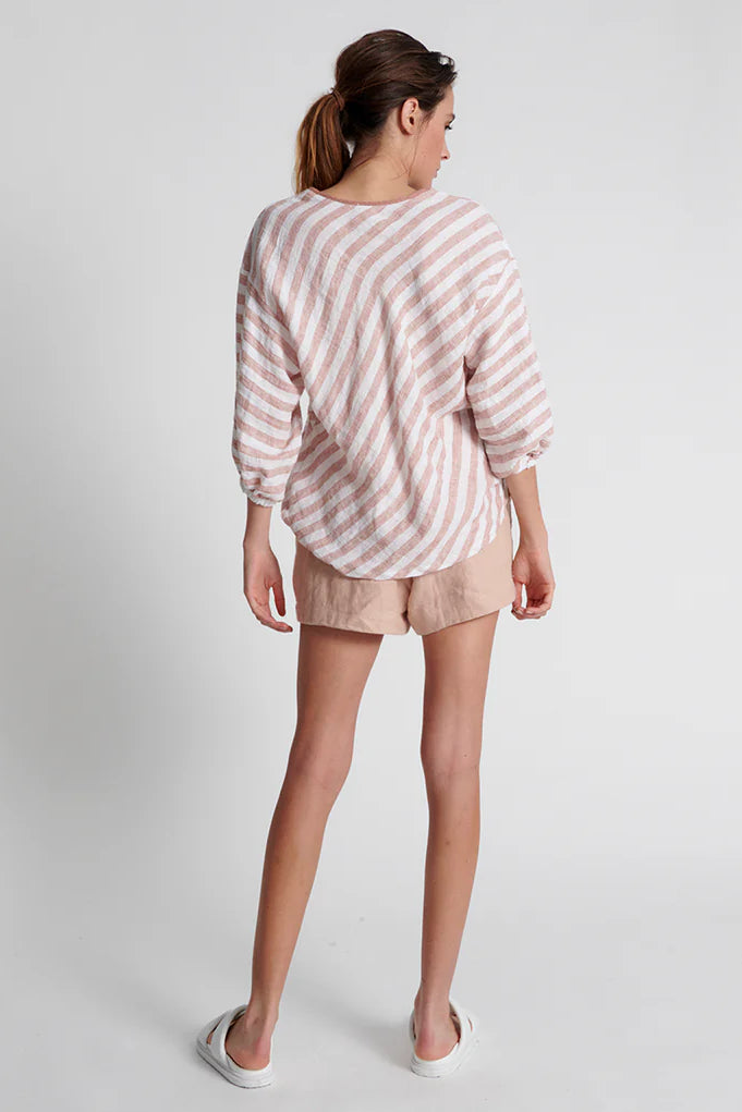 Crafted from 100% linen, the Ayra Blouse features a relaxed fit with a gentle V-neckline and 4/5 length sleeves, falling just above the wrist and elasticated for a soft balloon effect. The drop hem is slightly longer at the back for a flattering effect.