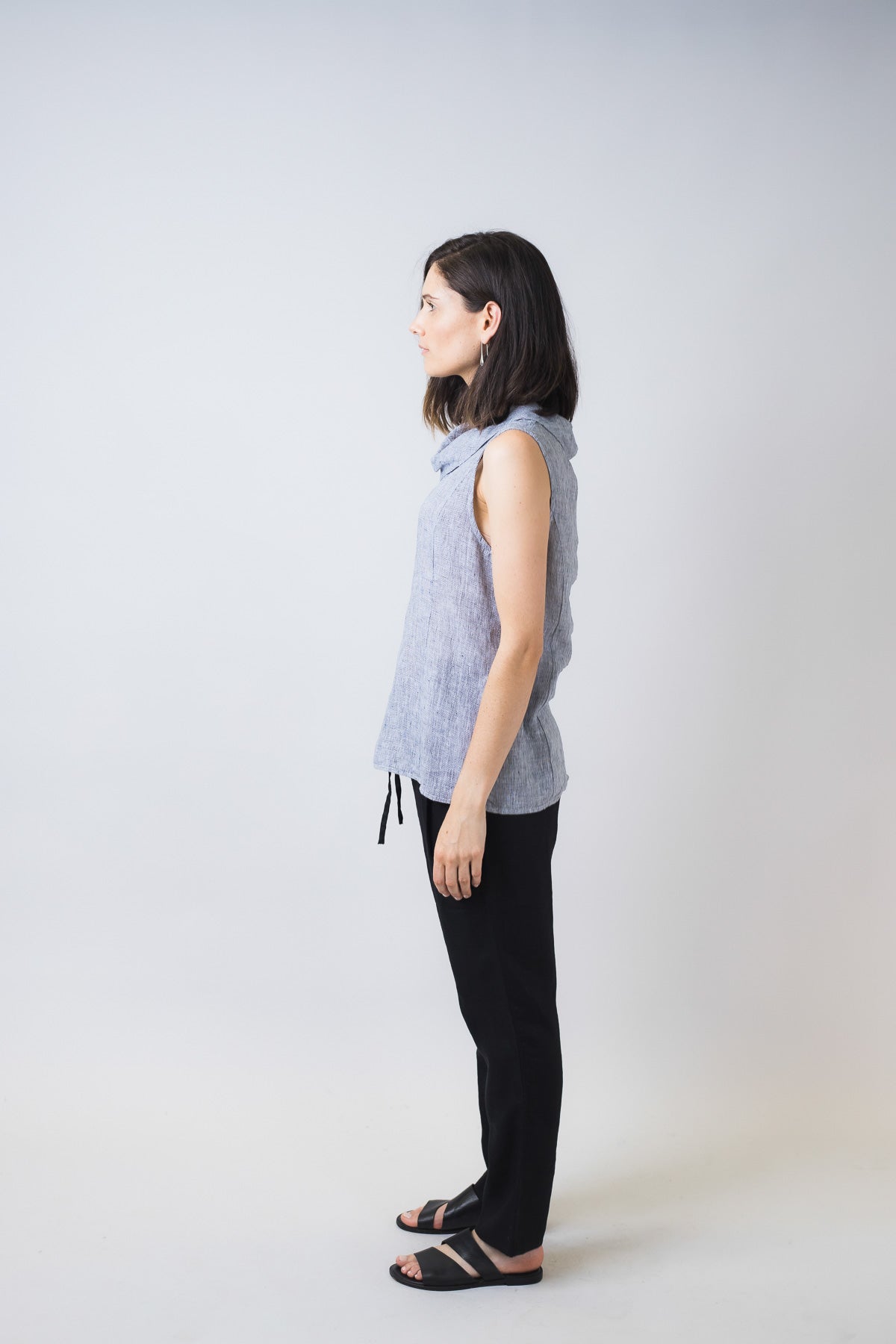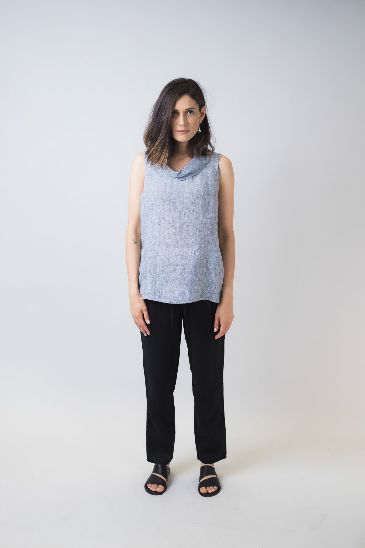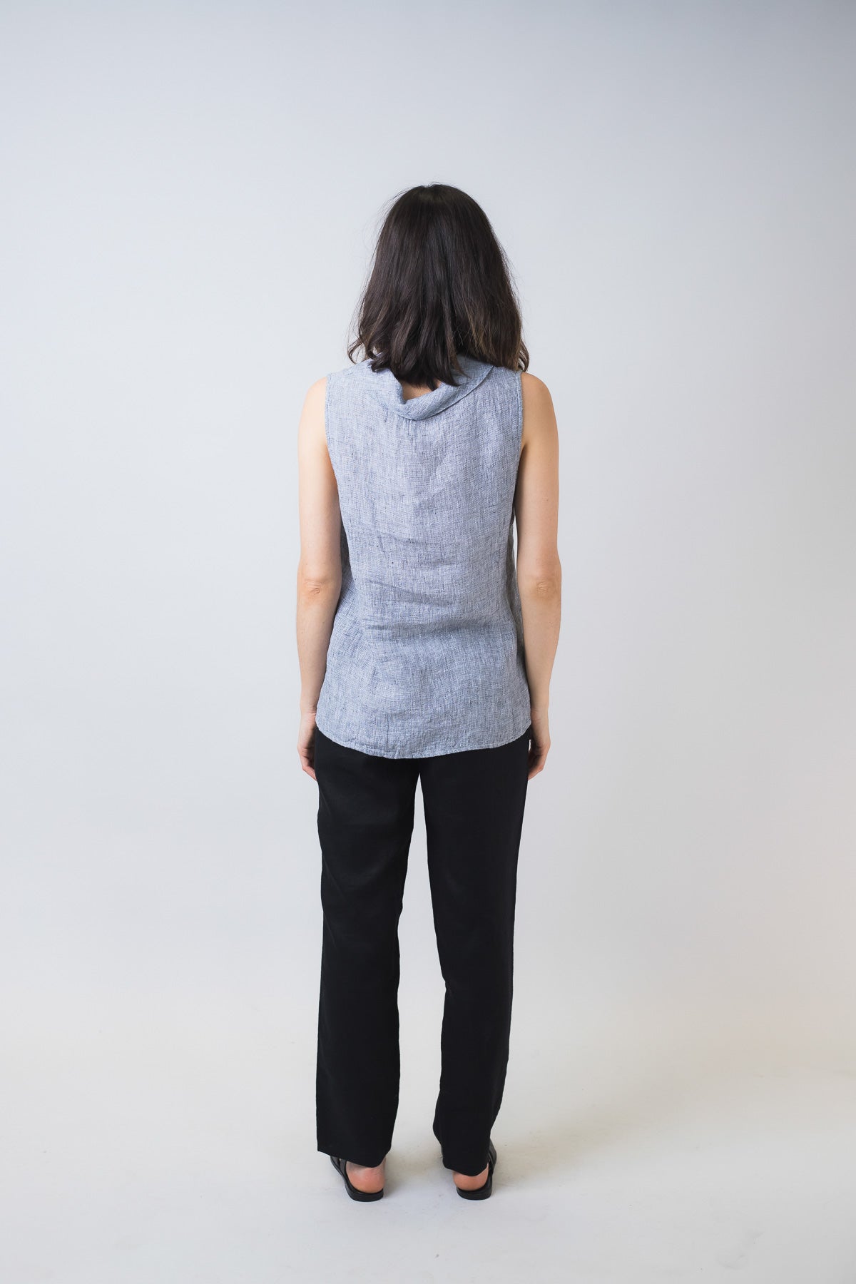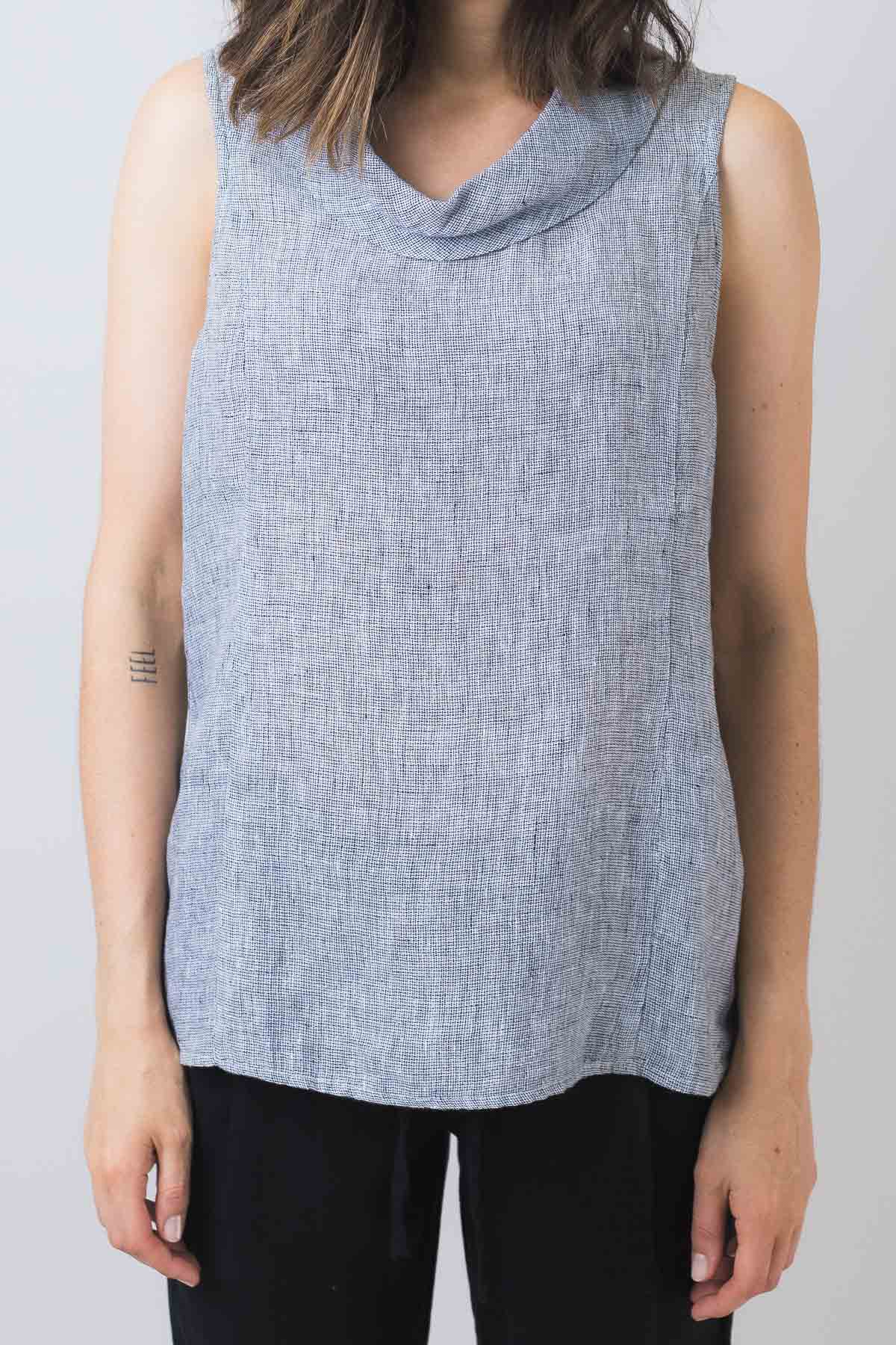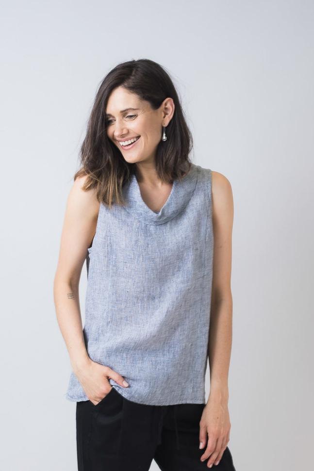 This 100% linen sleeveless, cowl-neck top is an effortlessly cute piece that will take your causal style to a new level. Simple enough to pair with white linen pants for an easy weekend look or dress it up with heels and a skirt for a sophisticated office outfit.