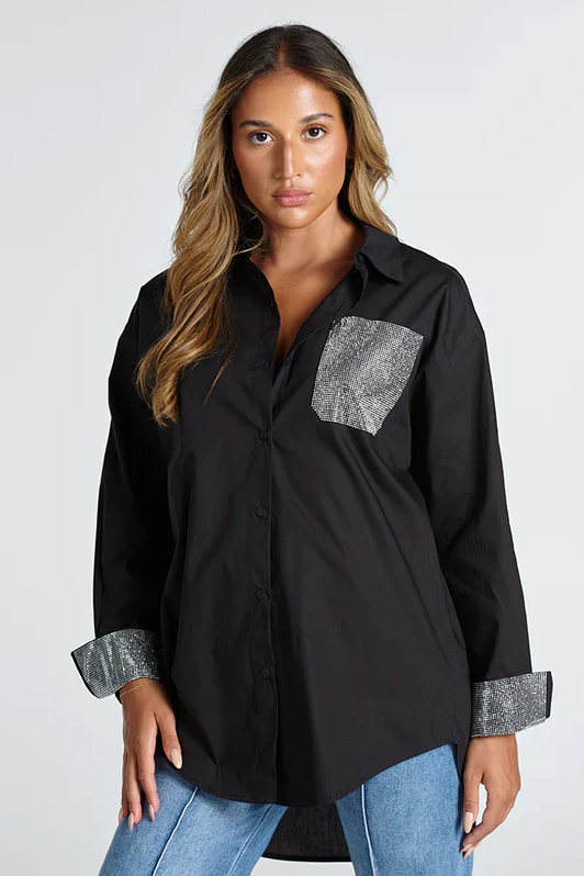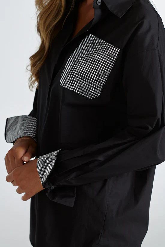 The classic Chloe Shirt in white by Aalia will elevate your wardrobe with its timeless elegance. Adorned with exquisite diamante cuff and pocket detail it looks fabulous with a silk blazer and tailored pants. Add a touch of glamour to your outfit with this versatile shirt.