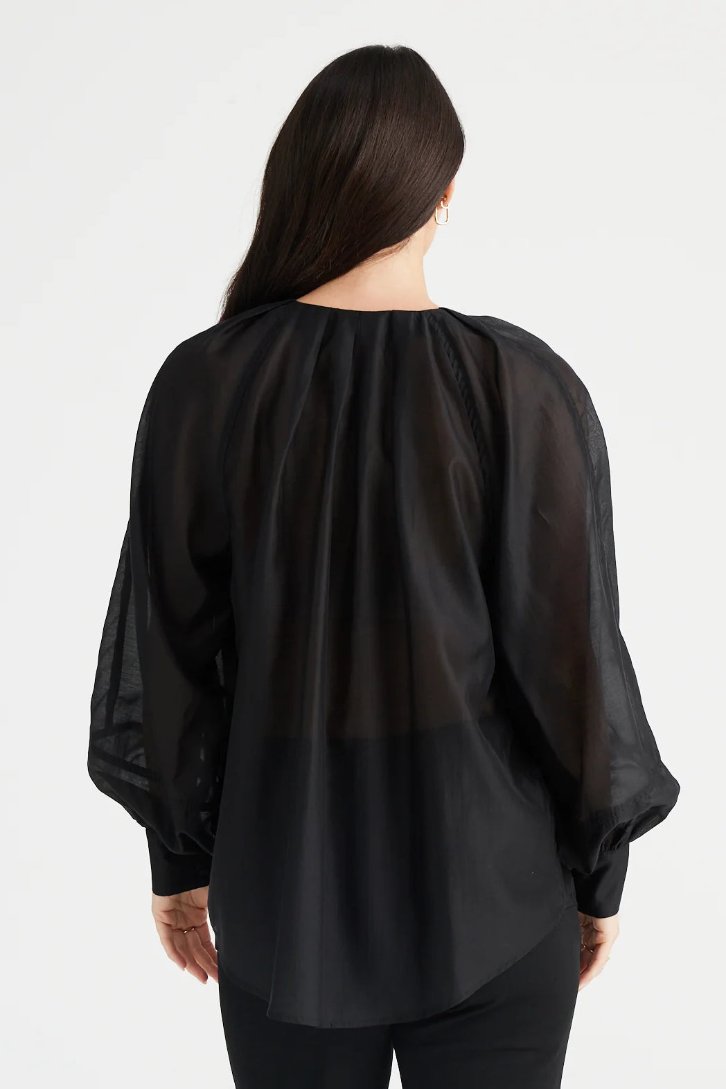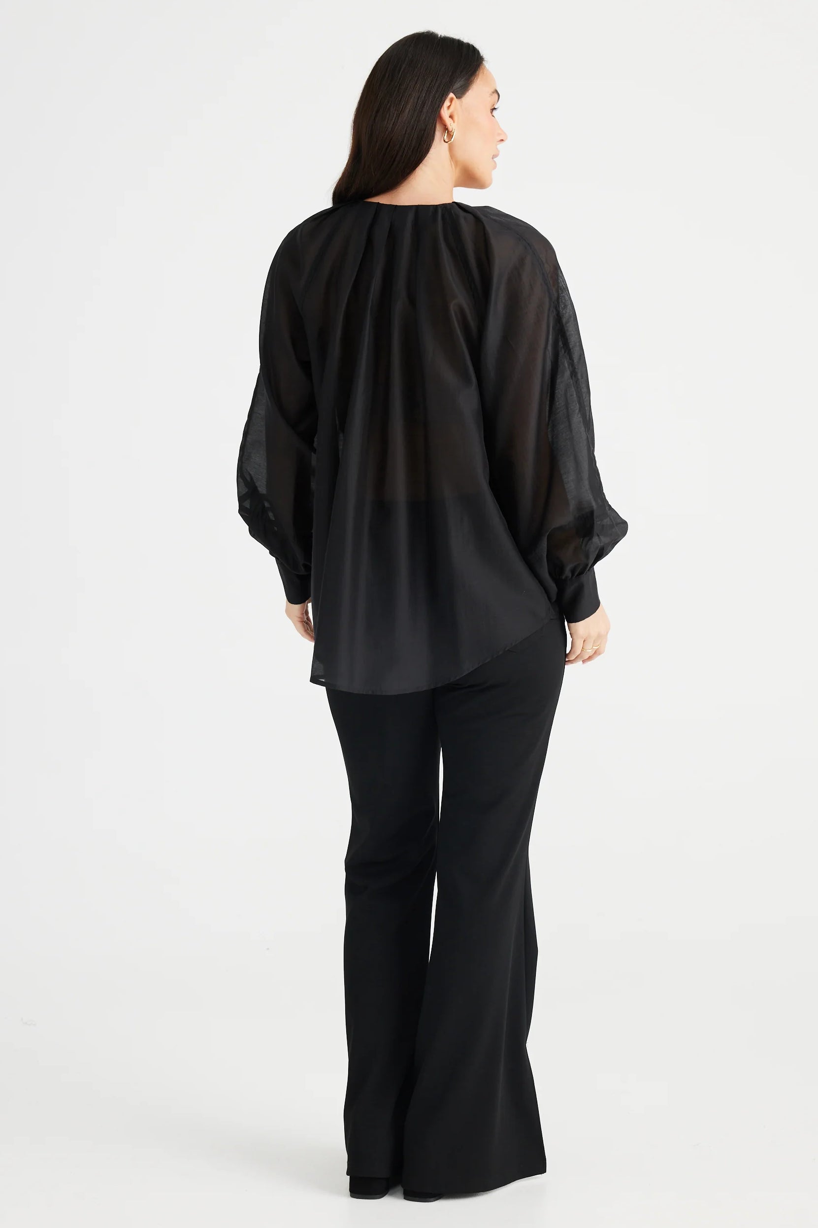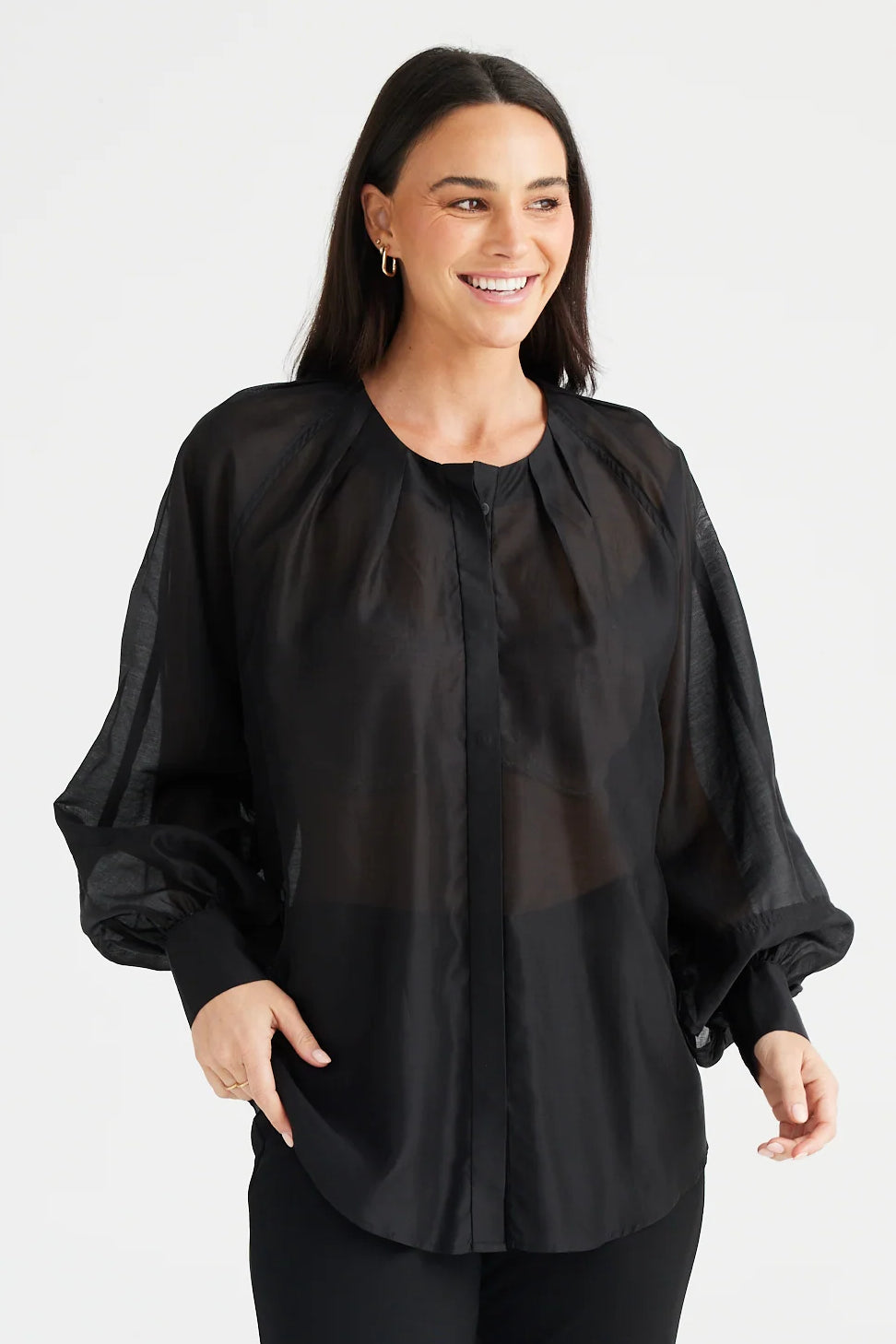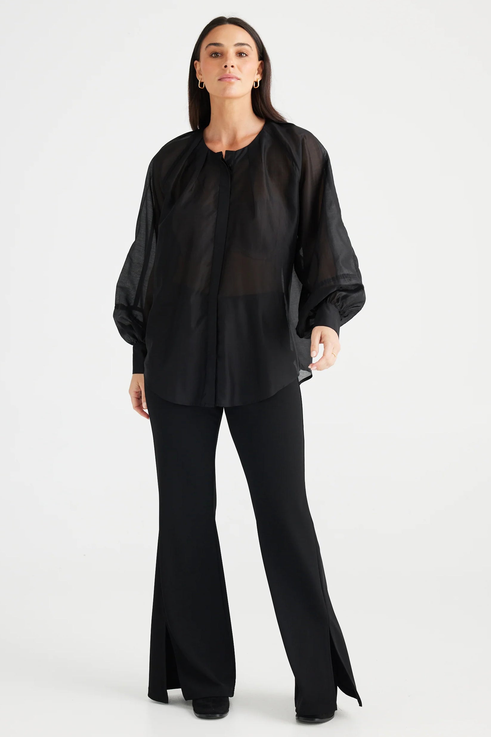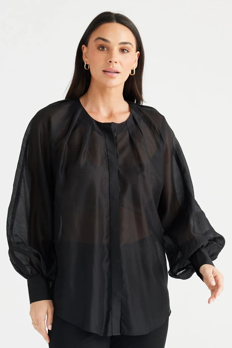 The Cooper Shirt in Black by Brave + True is a contemporary take on the classic blouse, offering a chic and versatile piece for your wardrobe. Crafted from a semi-sheer lightweight fabric, it features a relaxed fit that drapes elegantly over the body. The blouse is designed with a neat button-up front and a mandarin collar, adding a modern twist to the timeless design. The long, bishop sleeves are finished with cuffs, creating a subtle balloon effect that adds a touch of sophistication.