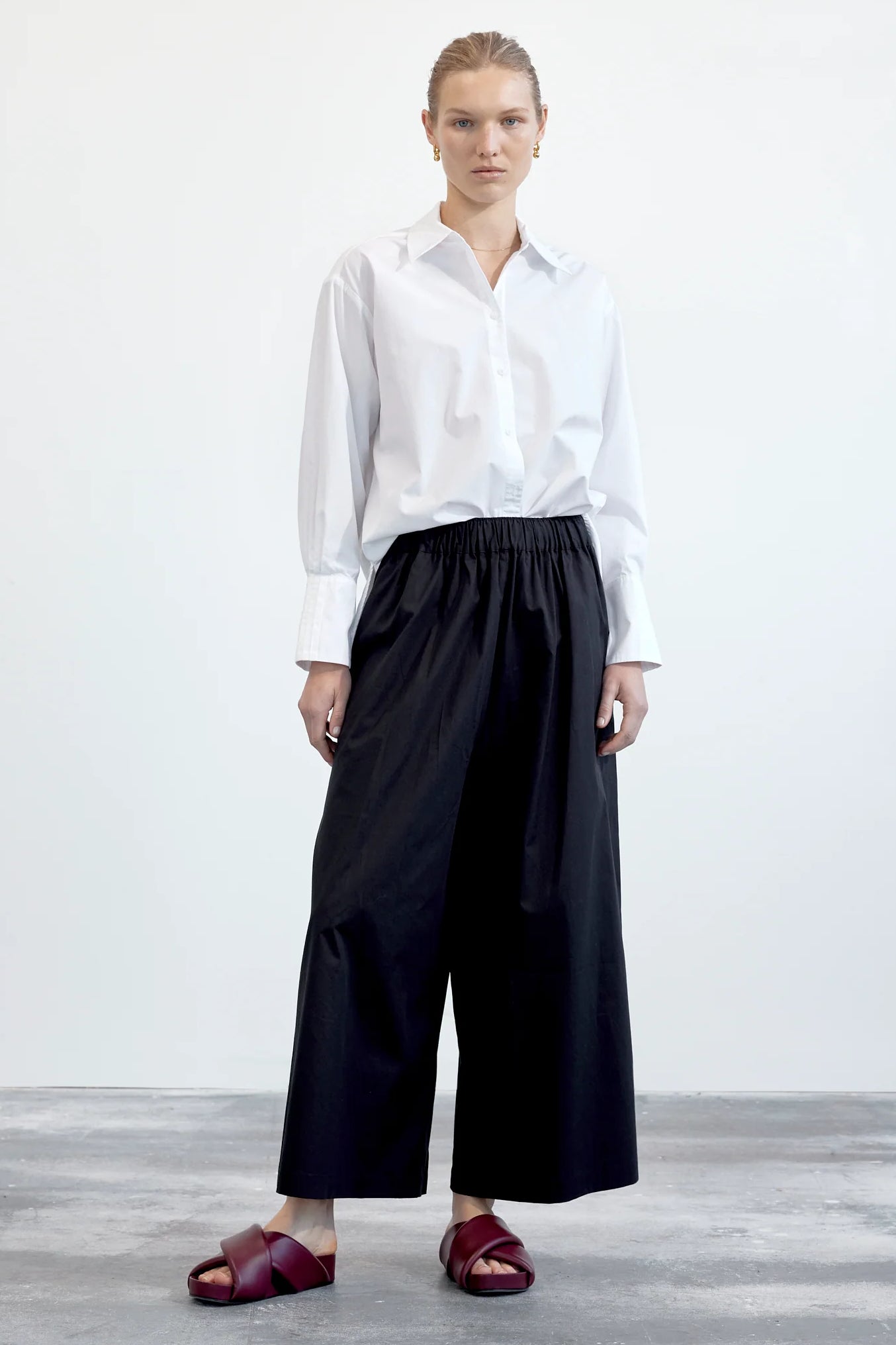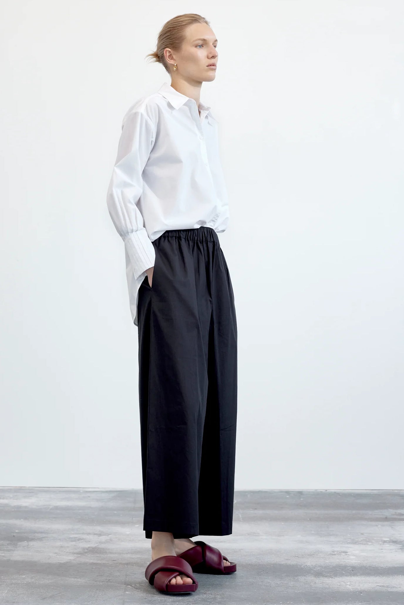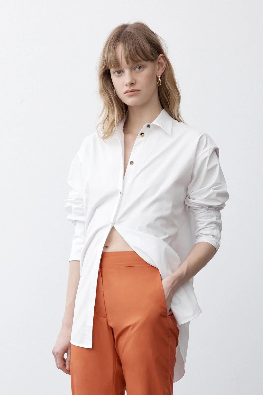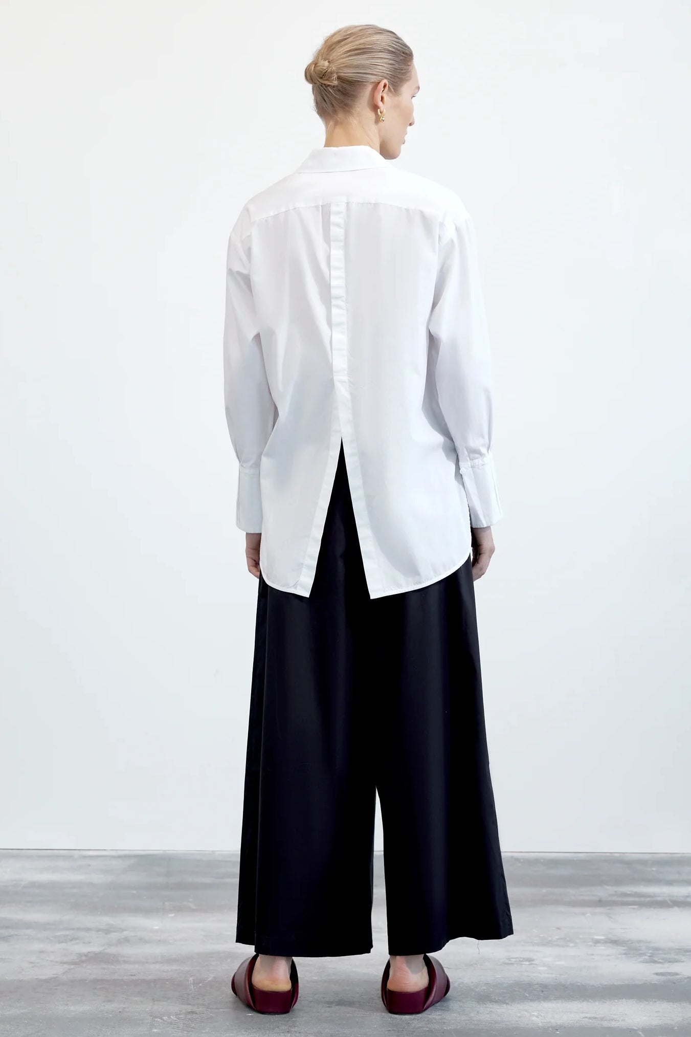A fresh take on a wardrobe staple, this collared shirt is crafted with a dropped shoulder for a relaxed silhouette. It’s back vent gives a modern edge which pairs beautifully with the elegant oversized cuffs featuring feminine pintucking detail.