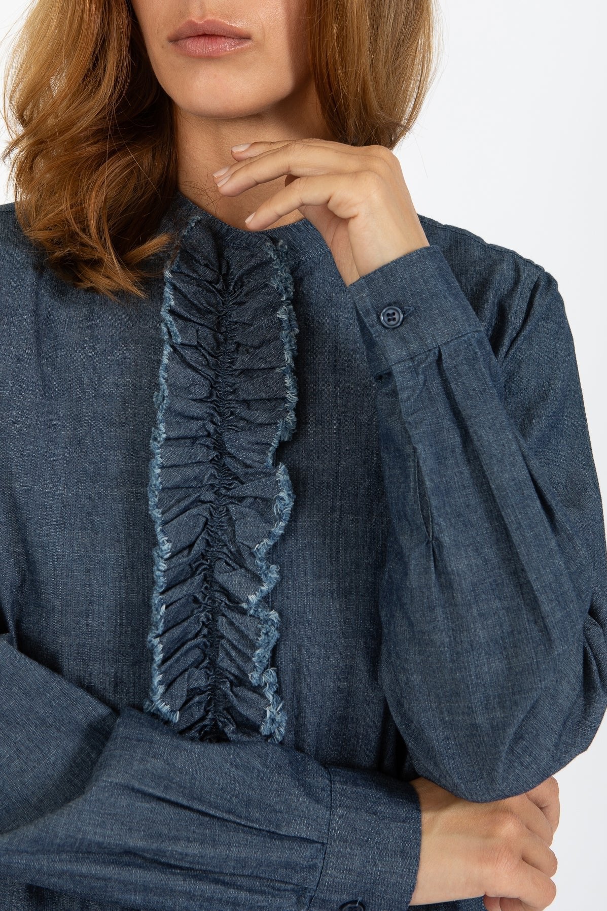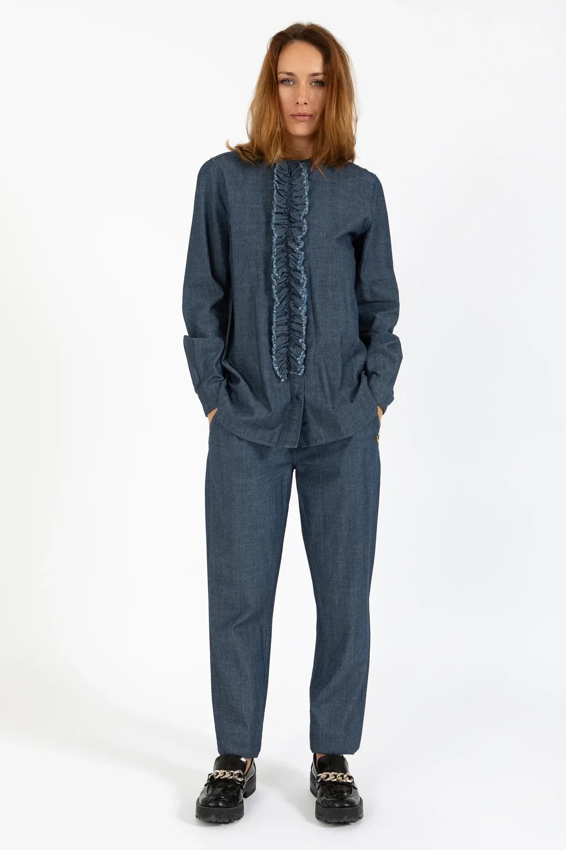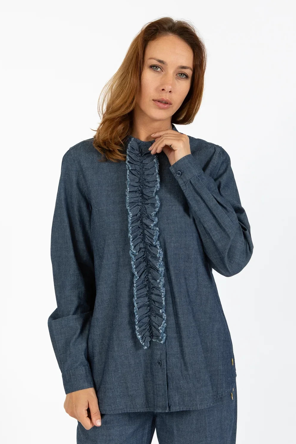 A stylish denim shirt, that adds a feminine touch to the classic denim look, with its ruffle details on the front. Perfect for both casual days and more formal occasions, where you want a twist on the traditional shirt.