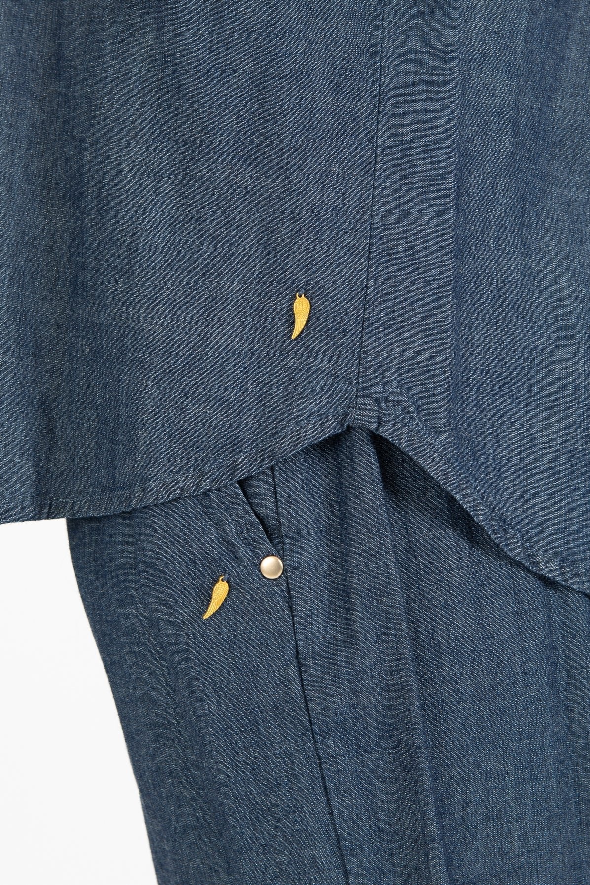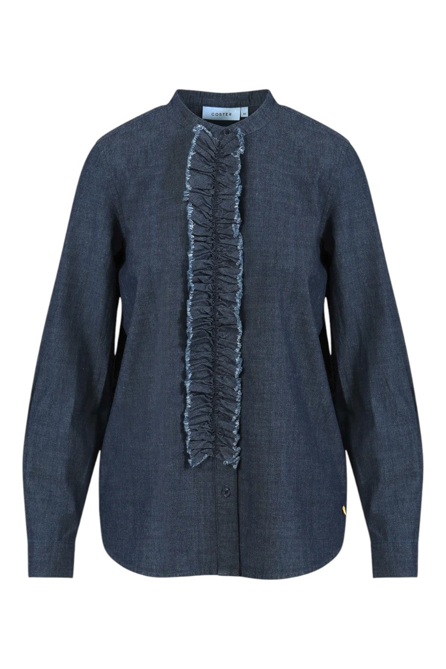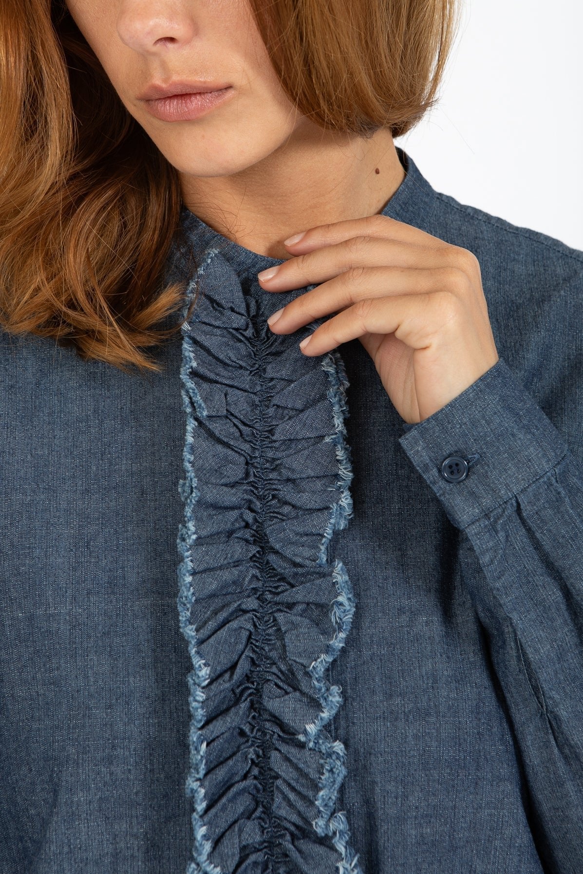 A stylish denim shirt, that adds a feminine touch to the classic denim look, with its ruffle details on the front. Perfect for both casual days and more formal occasions, where you want a twist on the traditional shirt.