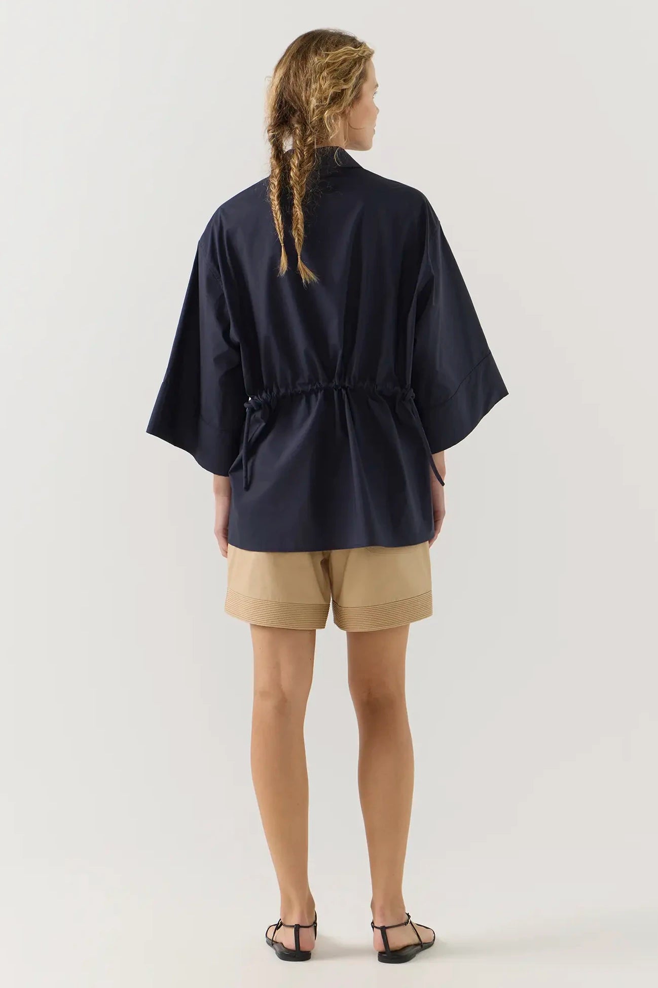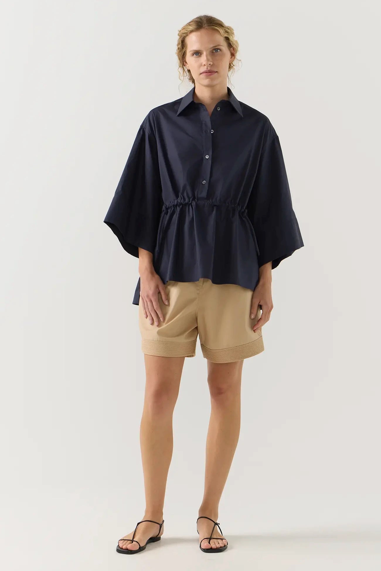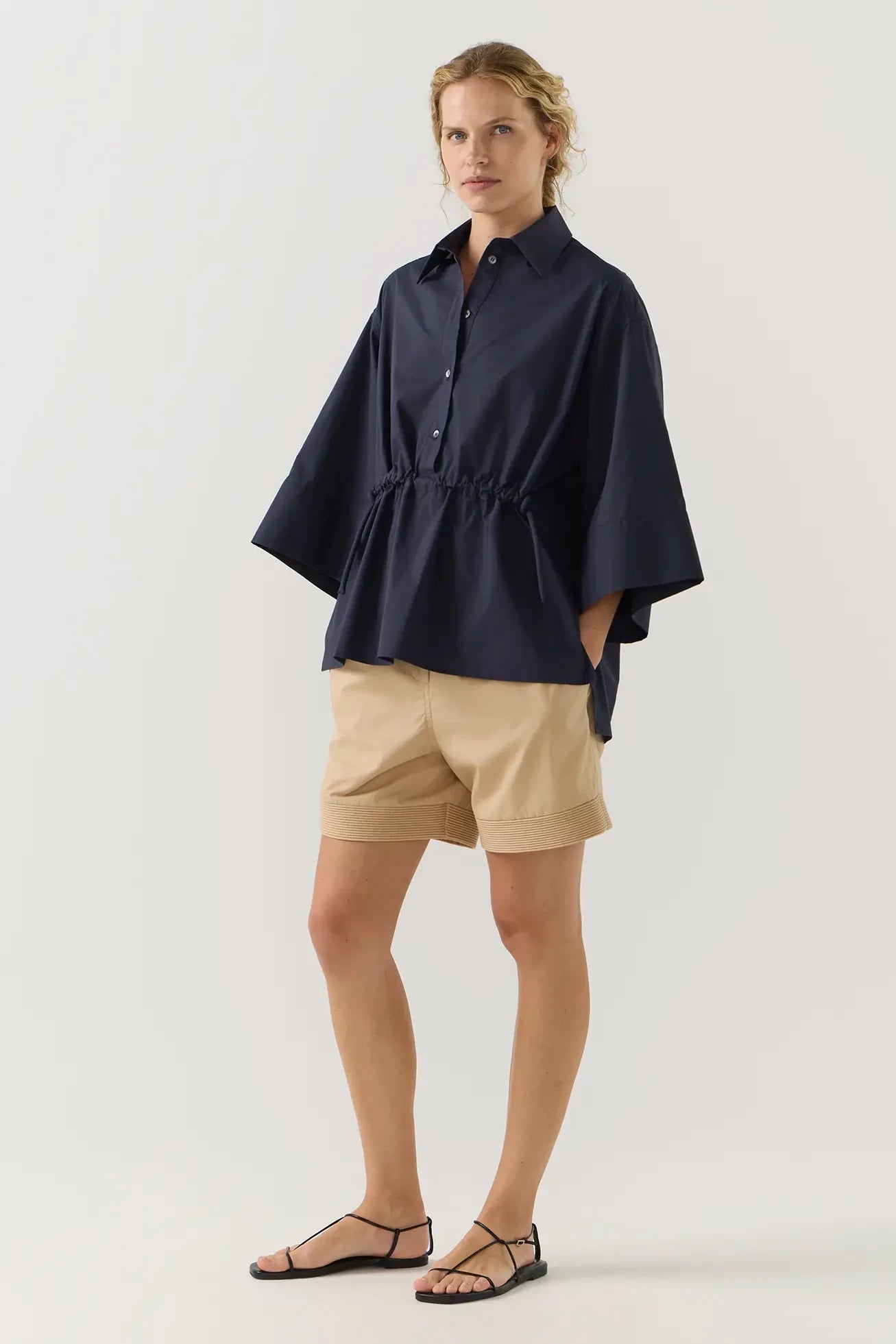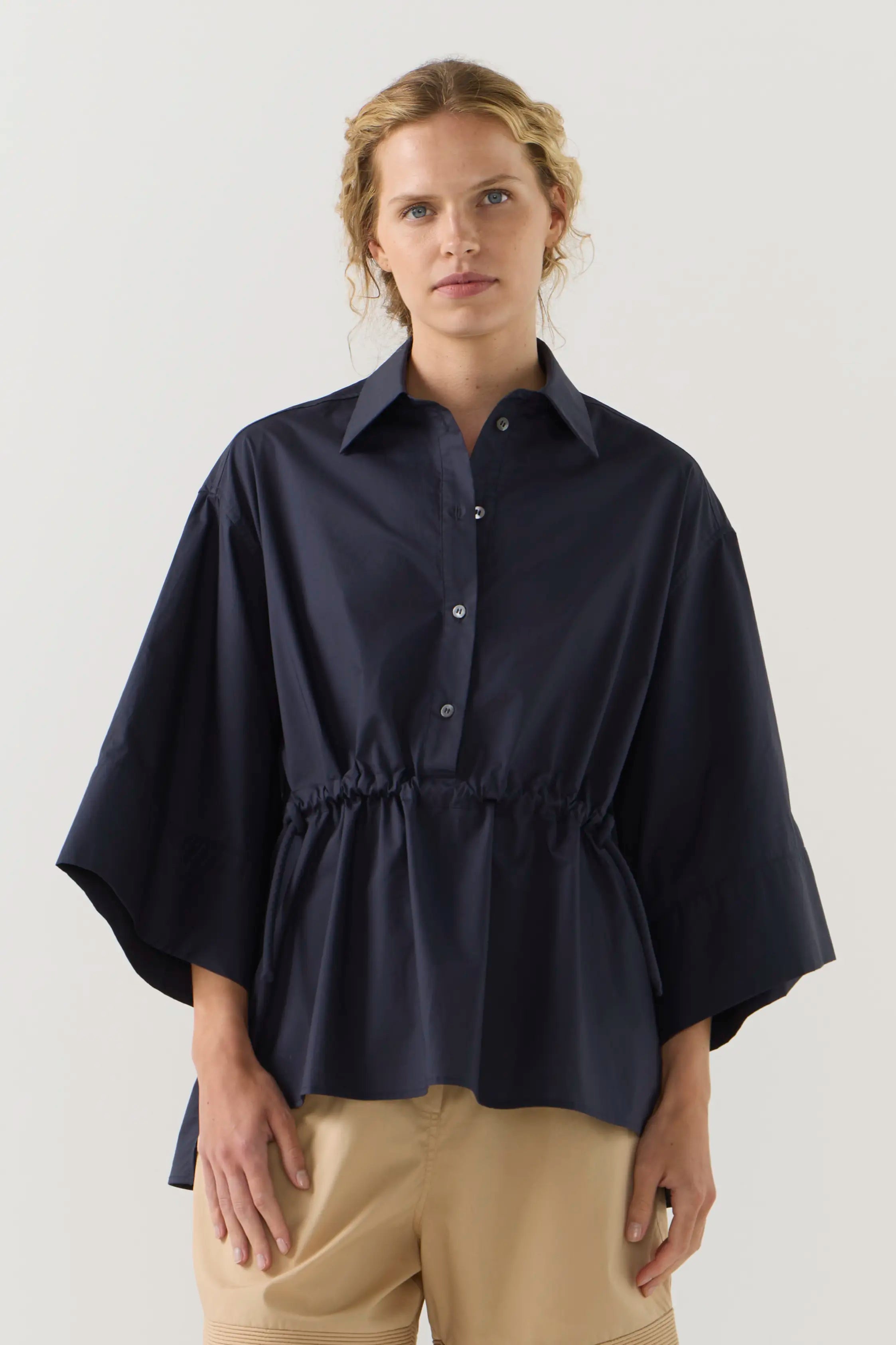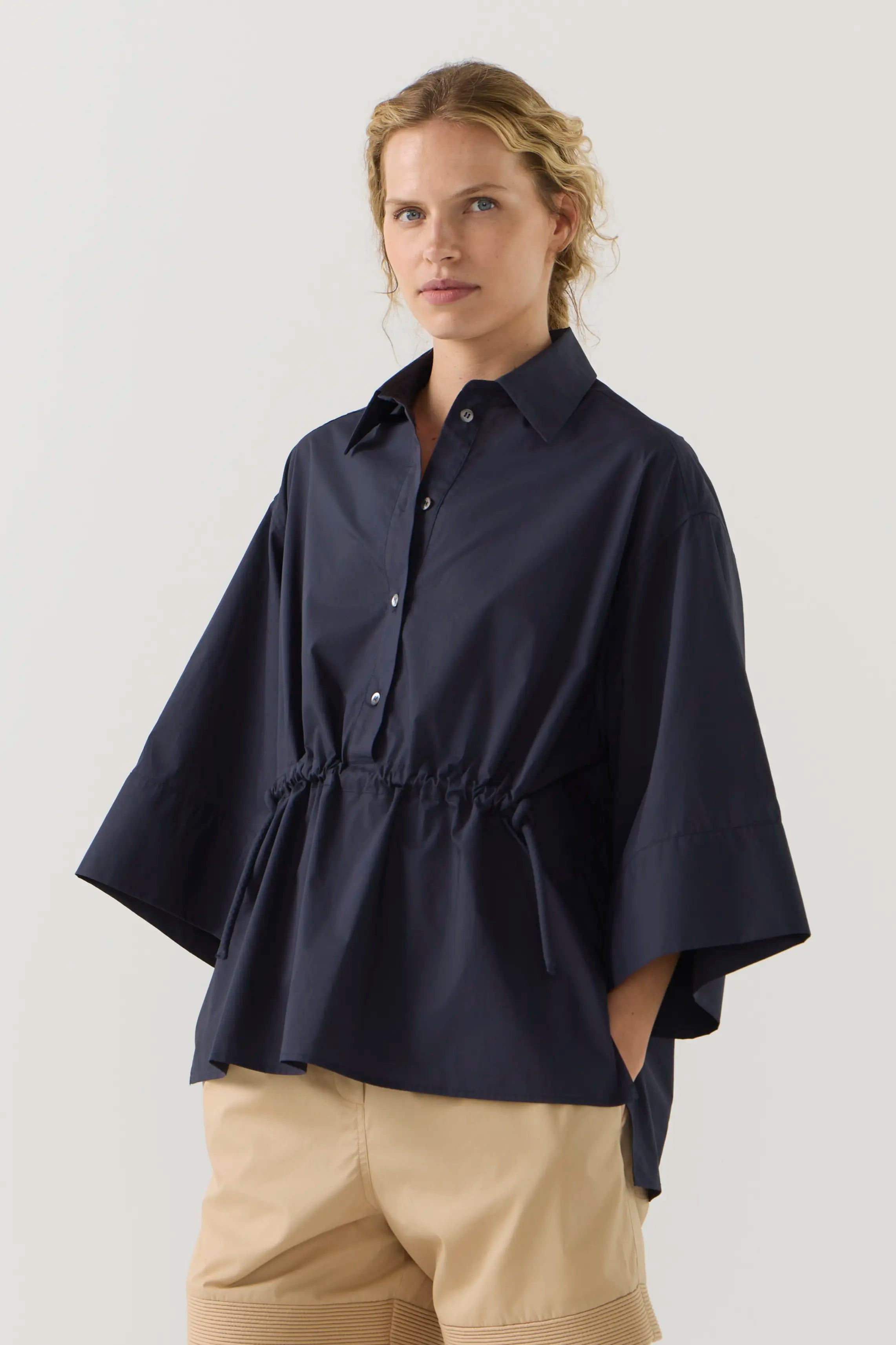 An evolution of the classic shirt silhouette, the Emily Shirt is defined by its relaxed volume and considered proportions. Cut in crisp poplin, it features a self-covered drawcord threaded through a channel at the waist, creating subtle shaping front and back. Details include a high-low hem, deep cuffs and generous side splits, offering a sense of movement and ease. A refined essential that balances structure with softness.