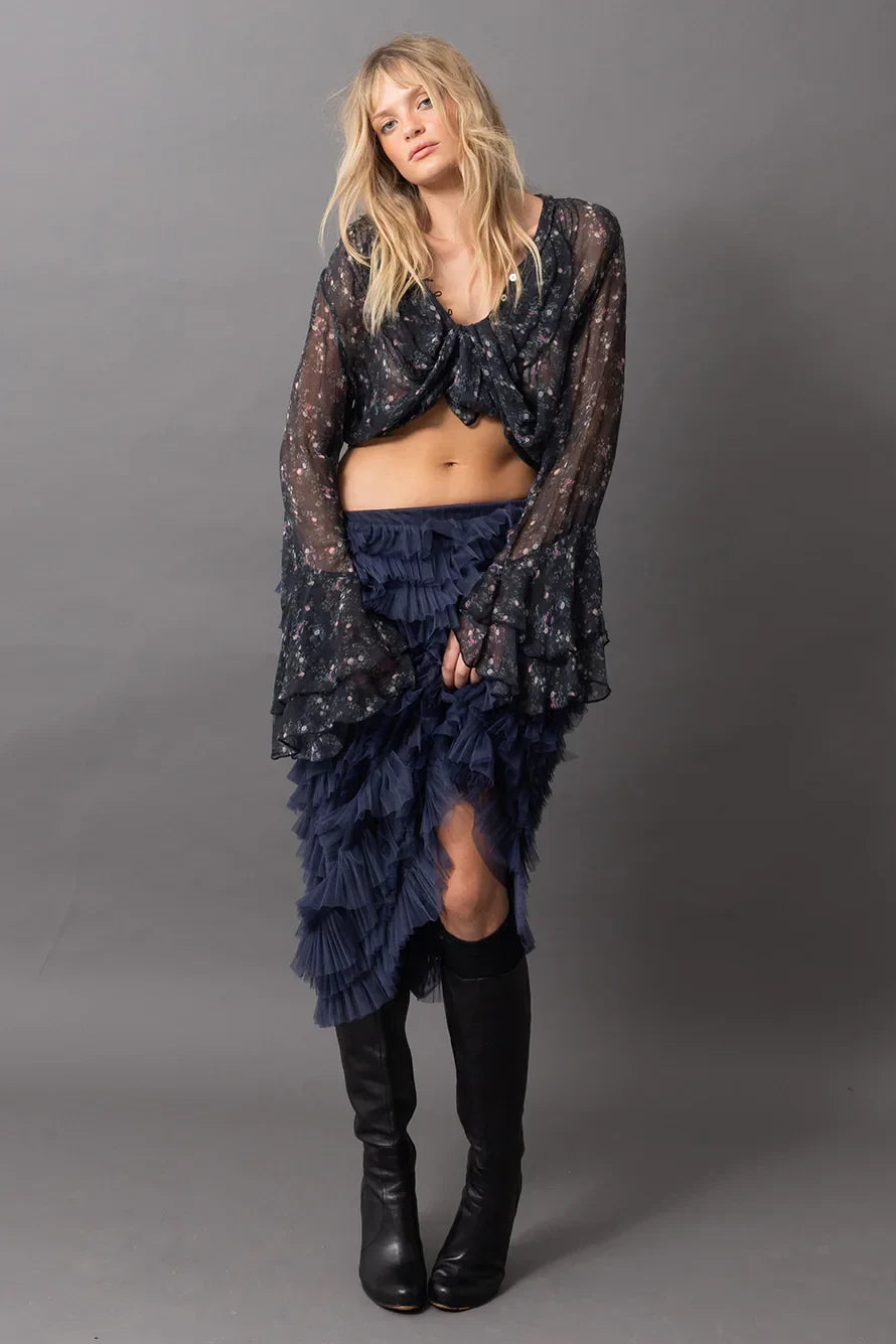 The Enchanted Long Sleeve Blouse in French Floral Black is an effortlessly romantic piece, crafted from soft crinkle viscose with a luxe silk-like feel. Featuring a button-through front and billowing sheer sleeves, this blouse is lightweight, breathable, and easy to wear. Ruffle detailing along the neckline, cuffs and hem adds a soft, feminine finish. Designed to be worn floaty and loose, it’s the perfect piece to elevate denim or pair with the matching Captivate Skirt for a coordinated, elegant look.