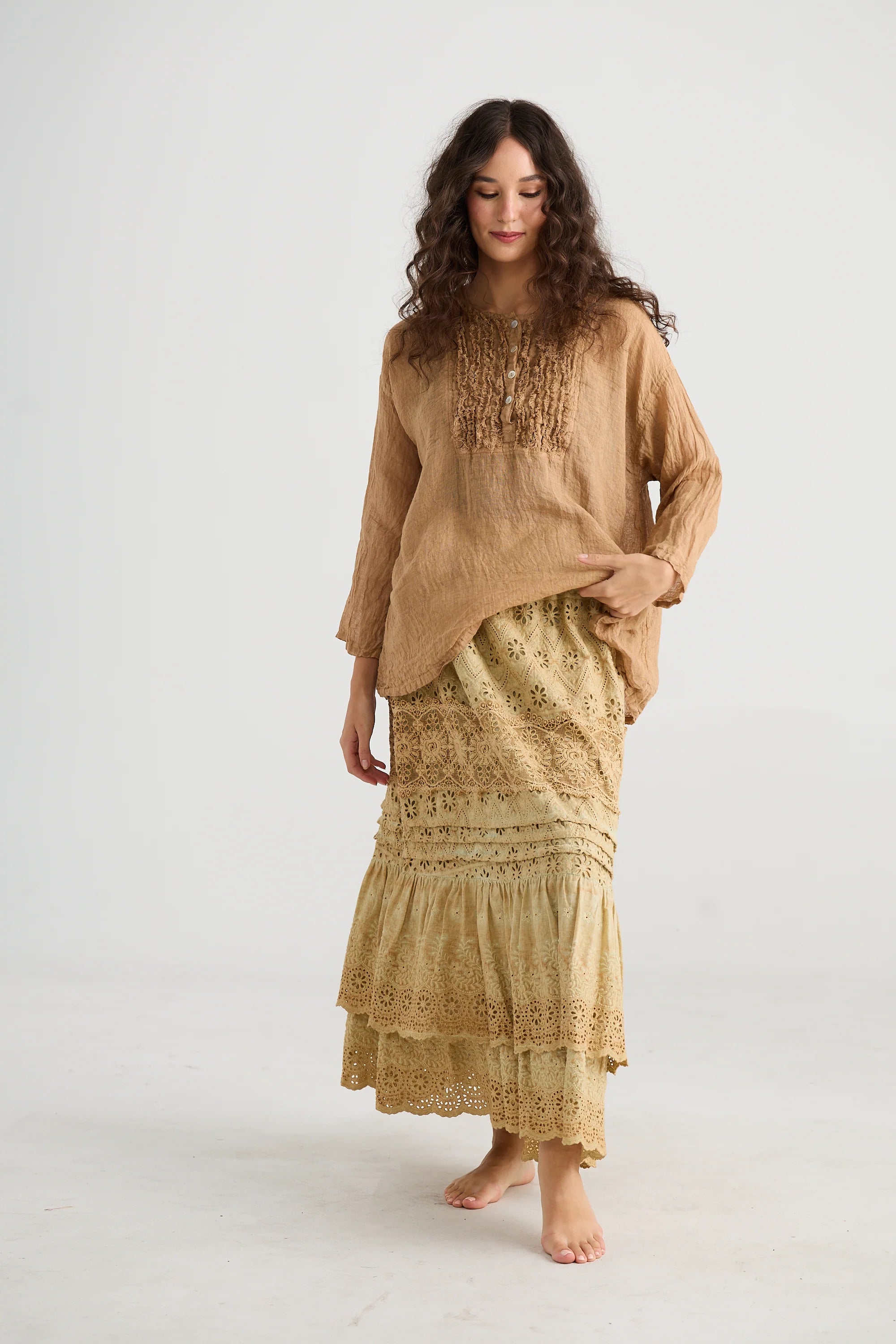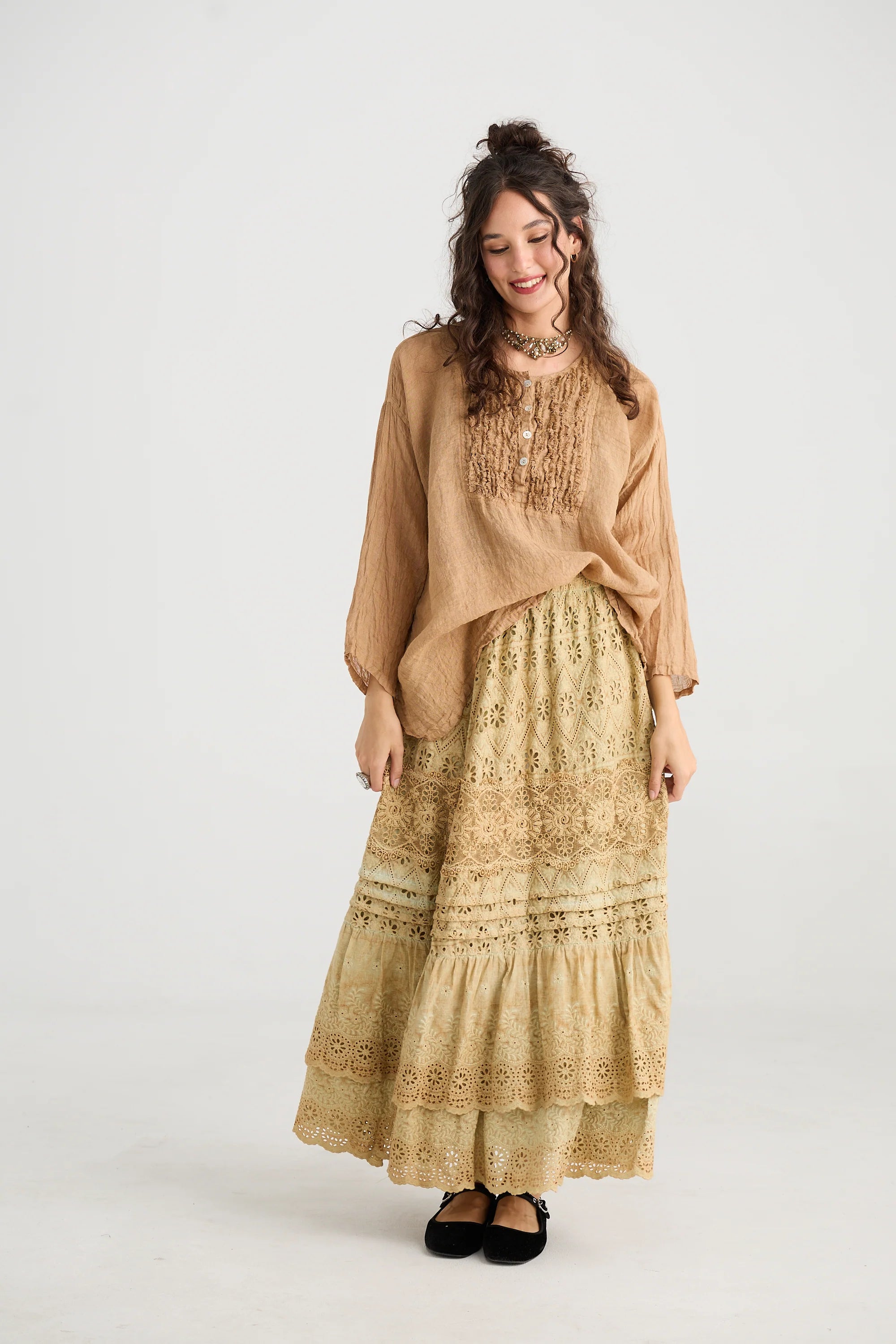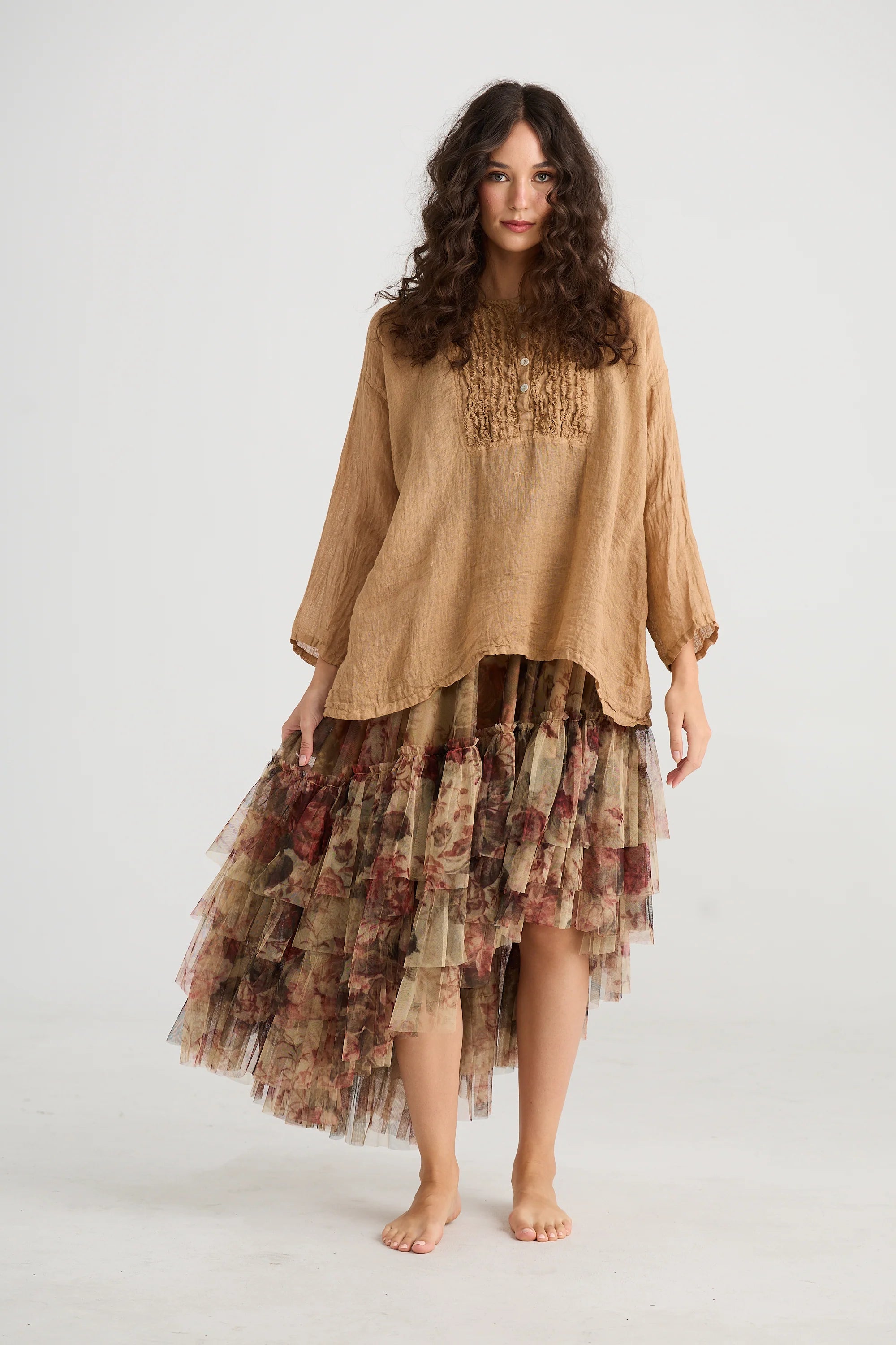 Florian is made from the most wonderful soft textured linen gauze and has a bodice detail of tattered small ruffles cascading down the bib front. With its Mother of Pearl buttons and exquisite workmanship this is a classic and romantically enchanting top.