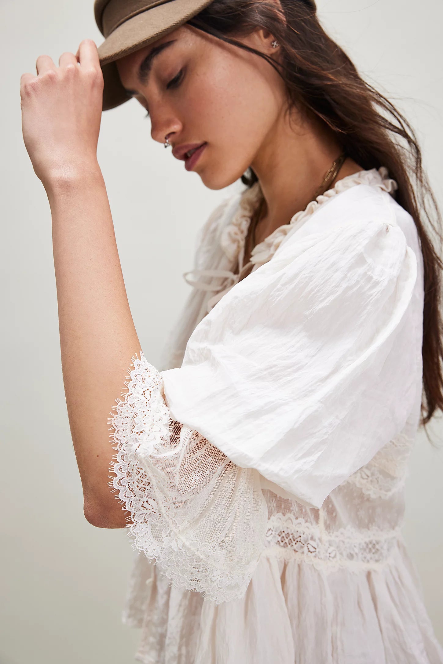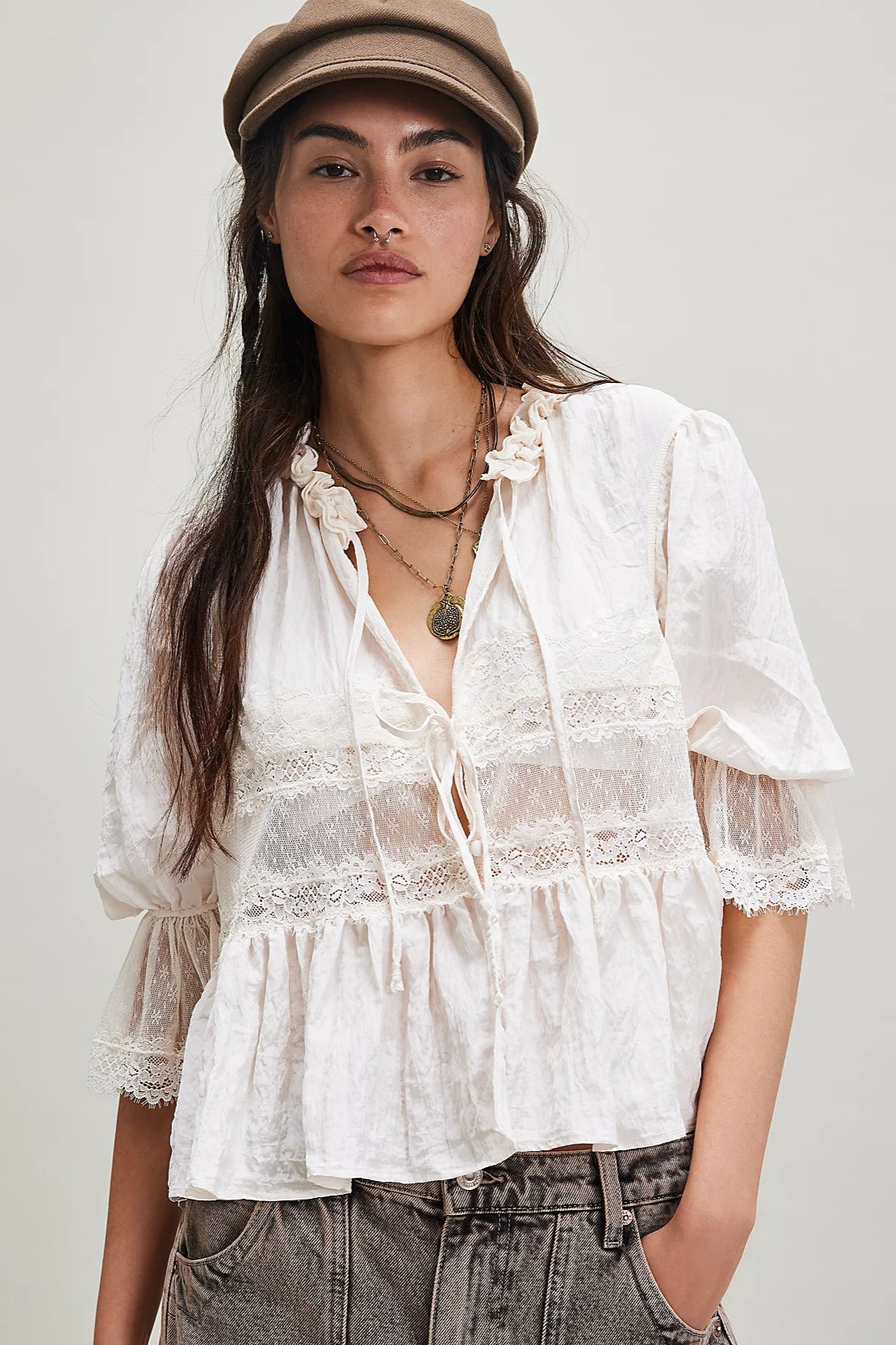 Effortlessly femme, this lace-adorned top features a soft fabrication and flattering silhouette with slightly puffy sleeves and a deep V-neckline. This simple top adds the perfect femme finishing touch to every ‘fit.