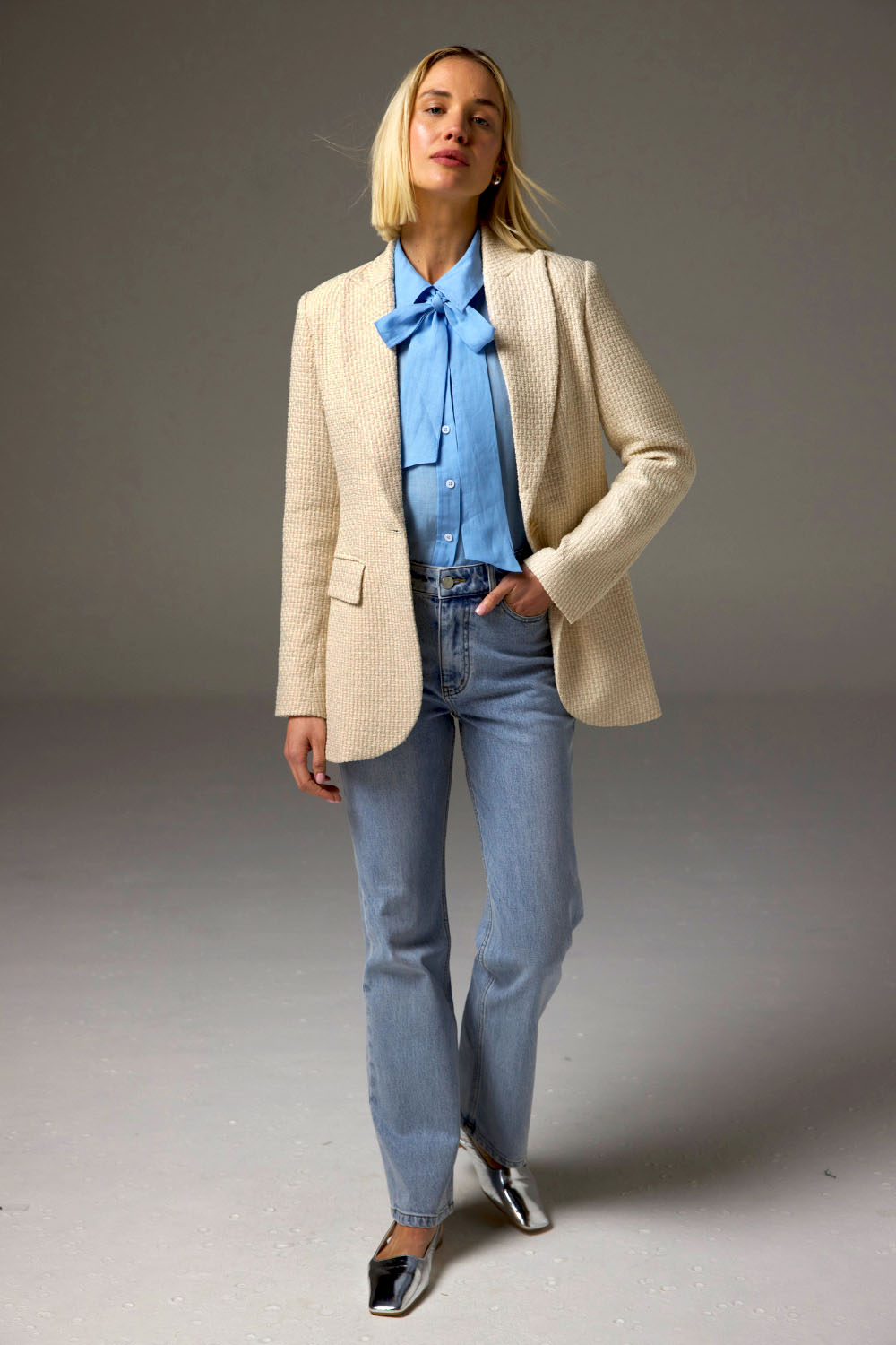 The Fruition Top is a versatile and sophisticated piece, tailored in a lightweight ramie fabric that adds a breezy, effortless touch. The detachable necktie offers styling versatility, while contrasting shell buttons evoke a timeless refinement. A gathered rear yoke creates soft volume, bridging the aesthetic between tailored elegance and contemporary ease.
