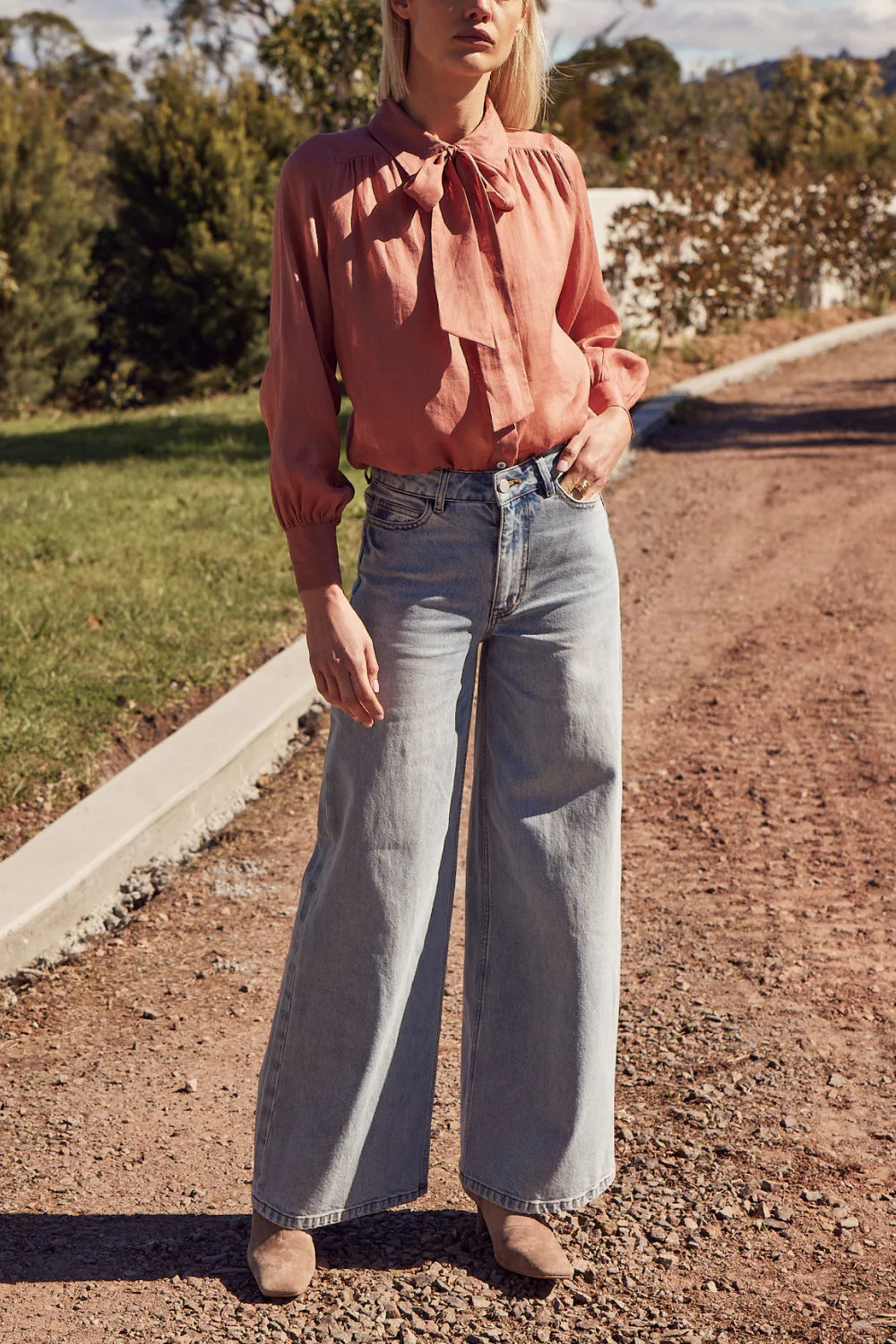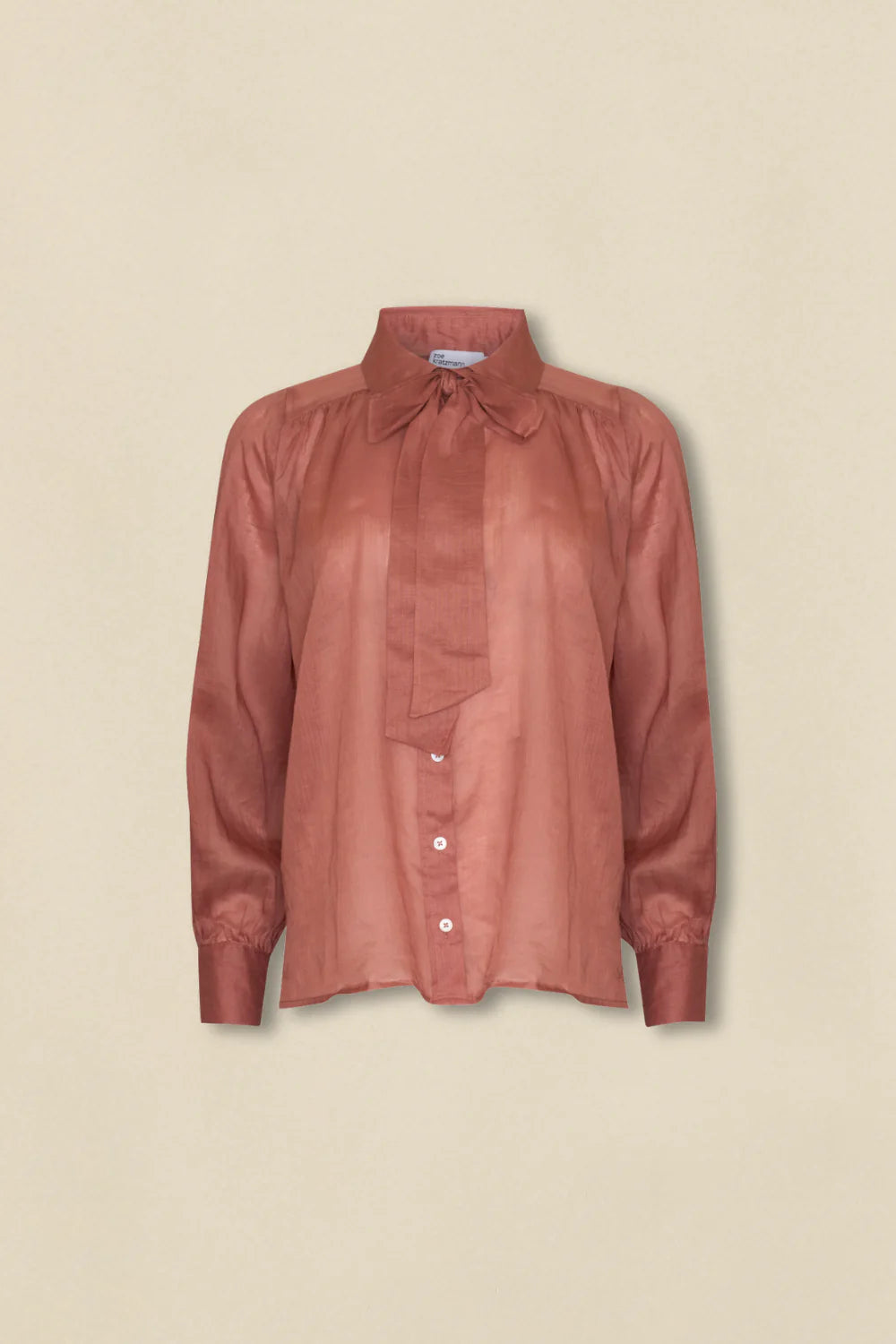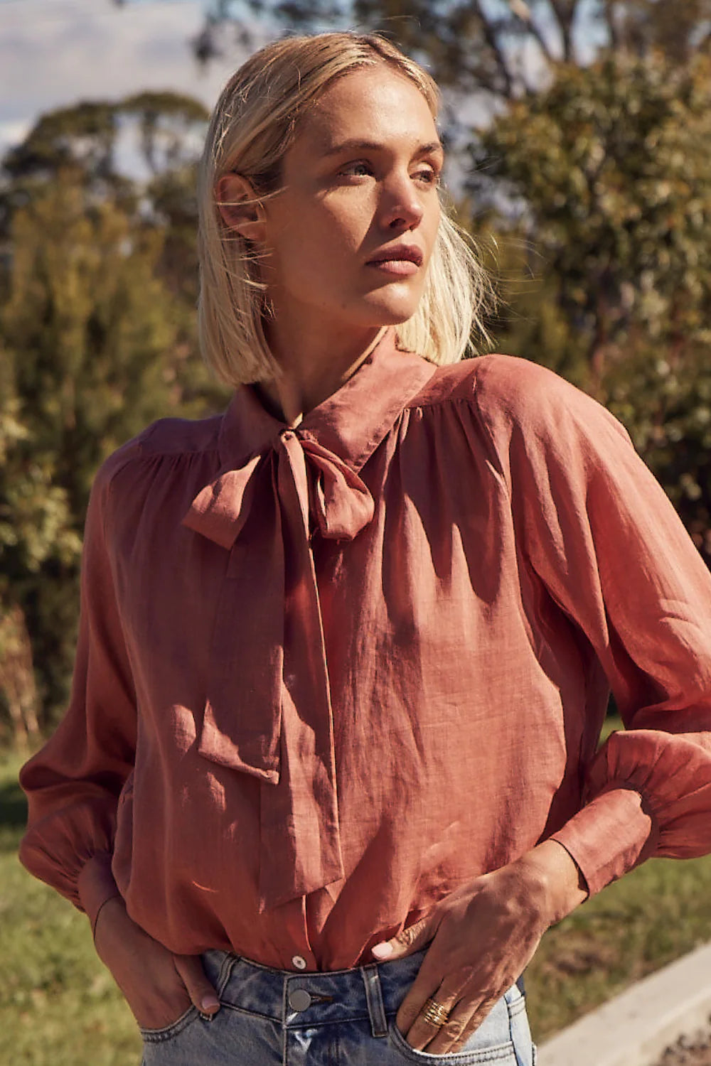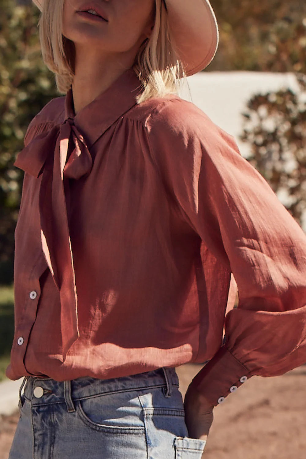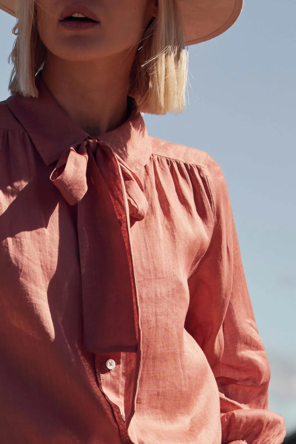 The Fruition Top is a versatile and sophisticated piece, tailored in a lightweight ramie fabric that adds a breezy, effortless touch. The detachable necktie offers styling versatility, while contrasting shell buttons evoke a timeless refinement. A gathered rear yoke creates soft volume, bridging the aesthetic between tailored elegance and contemporary ease.