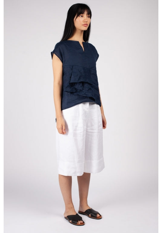 This natural and structured beautiful top can be worn by nicely pressed or crushed after wash. Fuzuki Fold Top has French sleeves with curved neckline with asymmetrical split in front. It creates unique and elegant style and easy to wear any shape of Pants or Skirts from slim line to volumed balloon look. we designed this style to be worn casual or for office. The hemline is slightly curved at the front with the back being longer, with side splits. The Fuzuki Fold Top is perfect to travel with and the fabric can be worn crushed.
