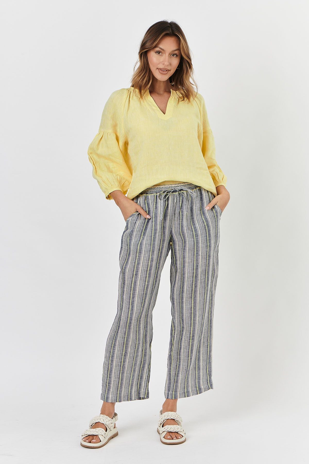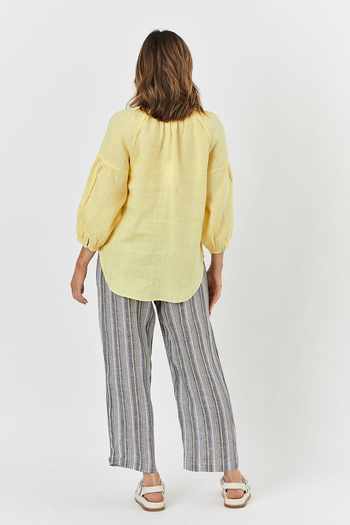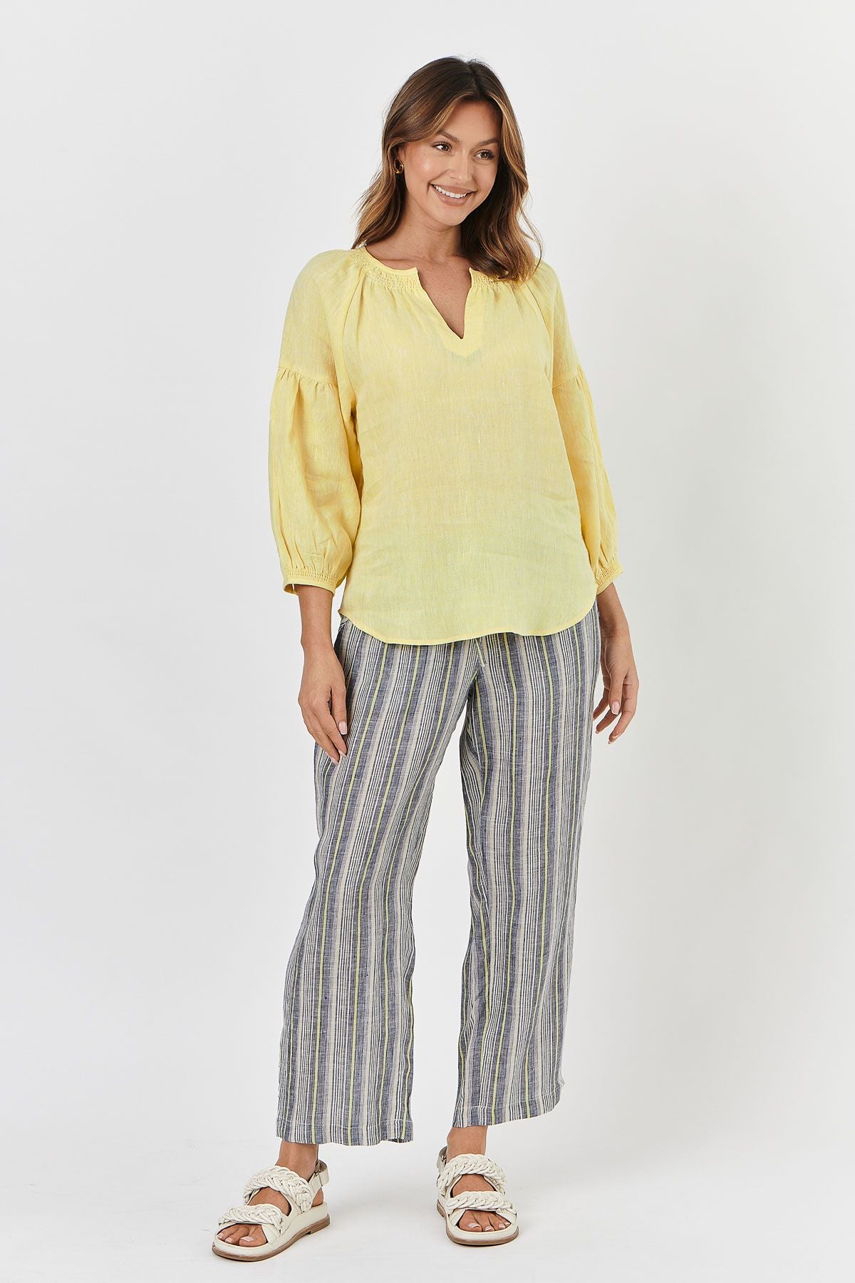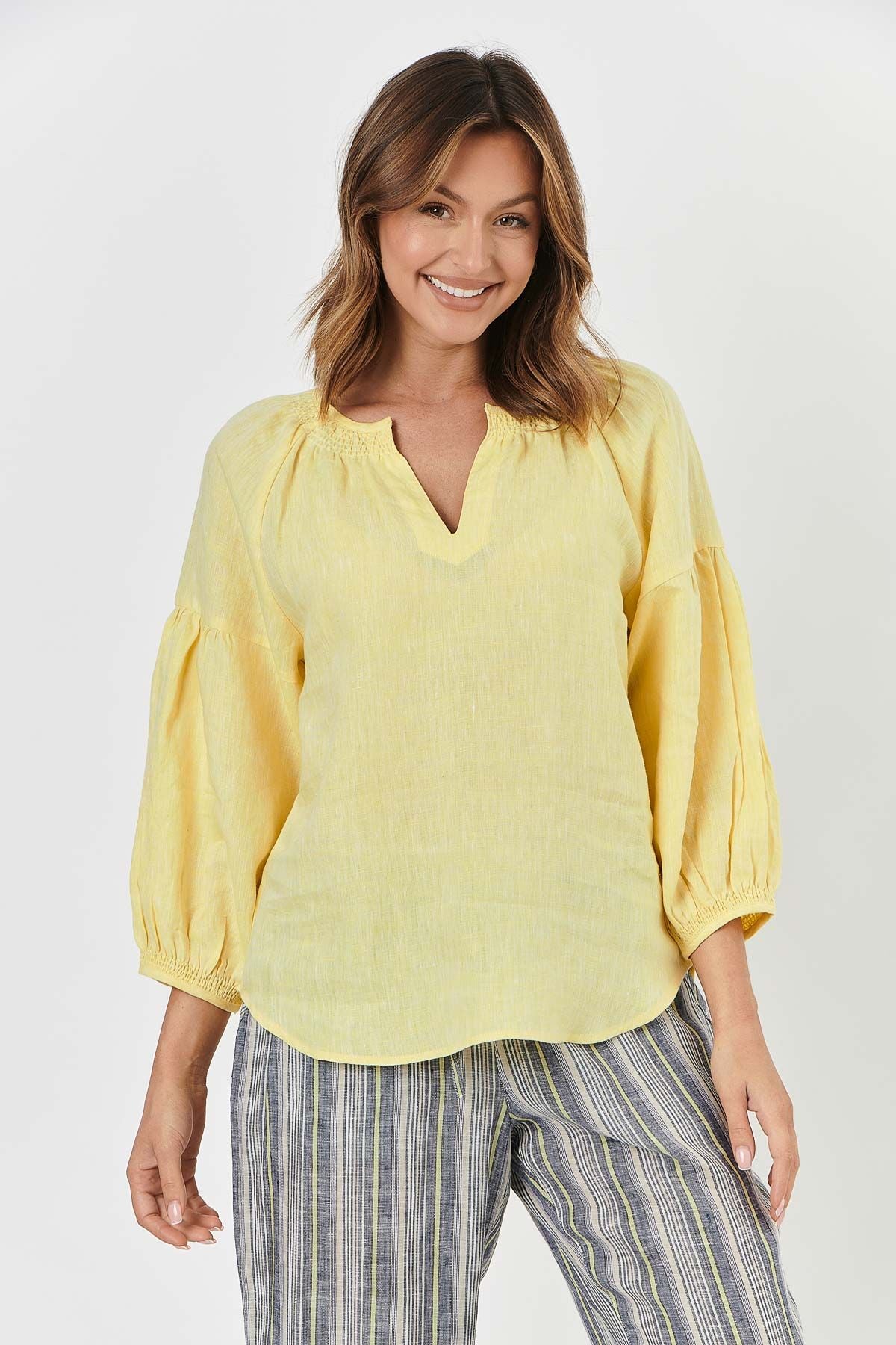 A city twist on the boho blouse, GA412 in Zest is a linen top featuring a V-shaped opening alongside elegant bunched stitching at the collar. Made from 100% linen, the relaxed balloon sleeve is designed to fall mid-way down the forearm.