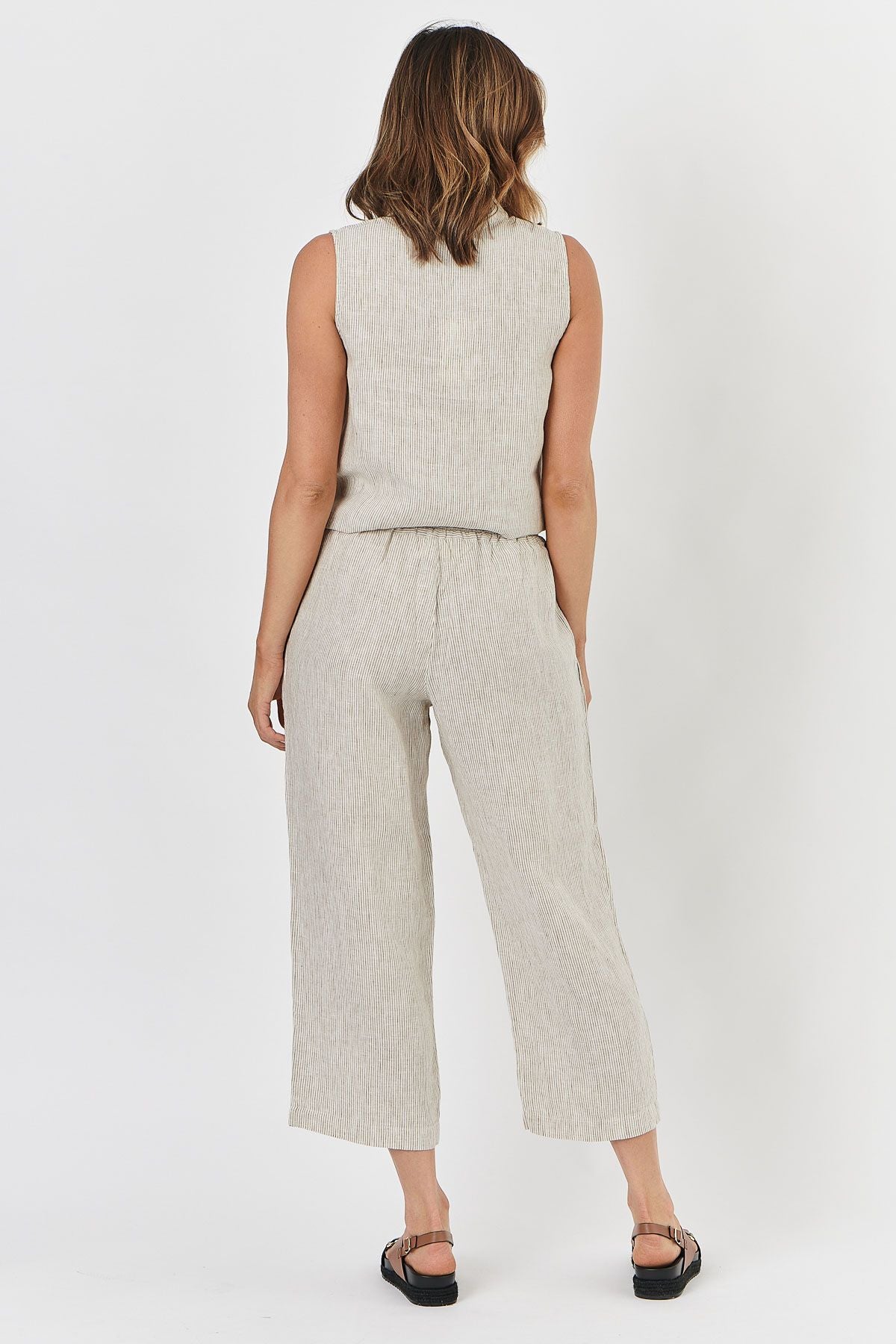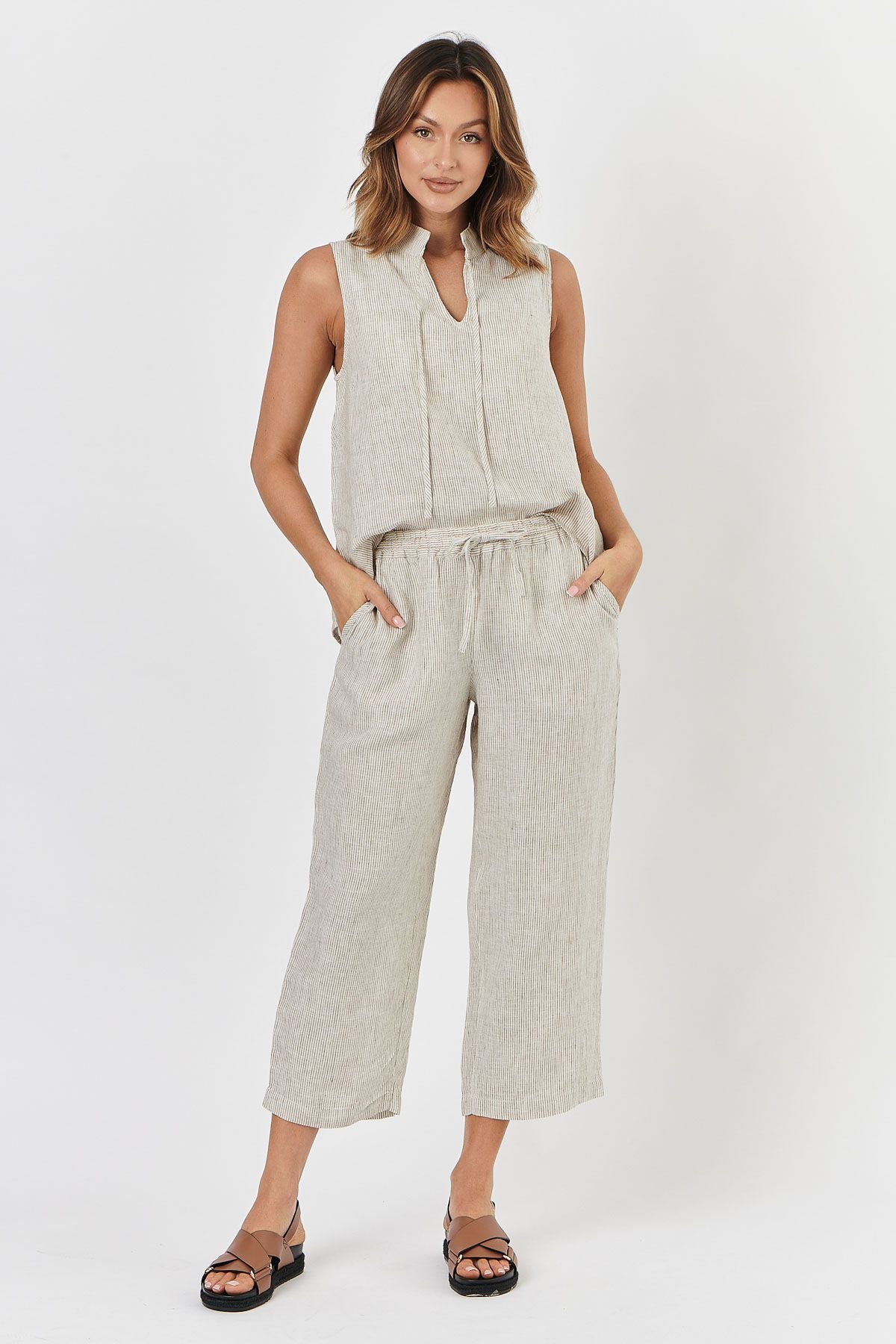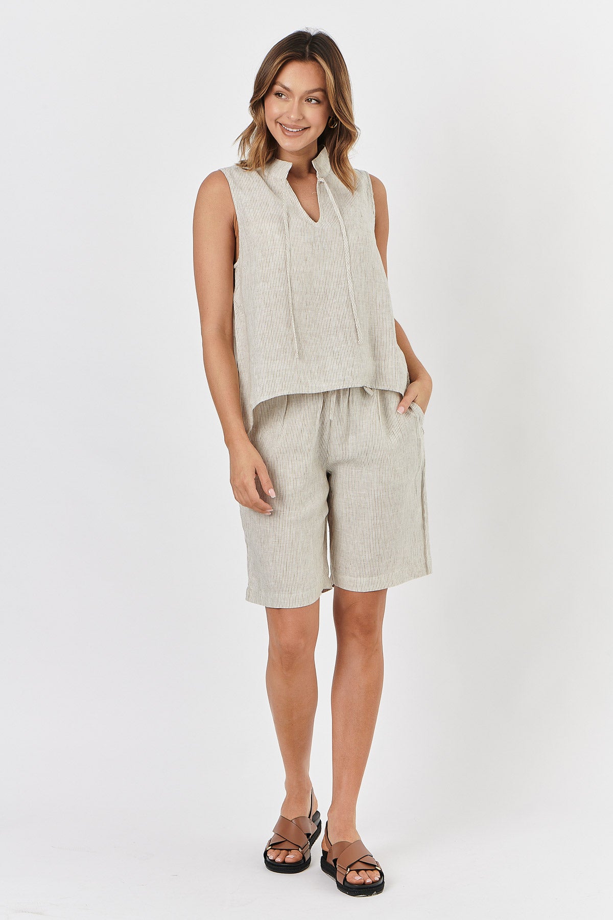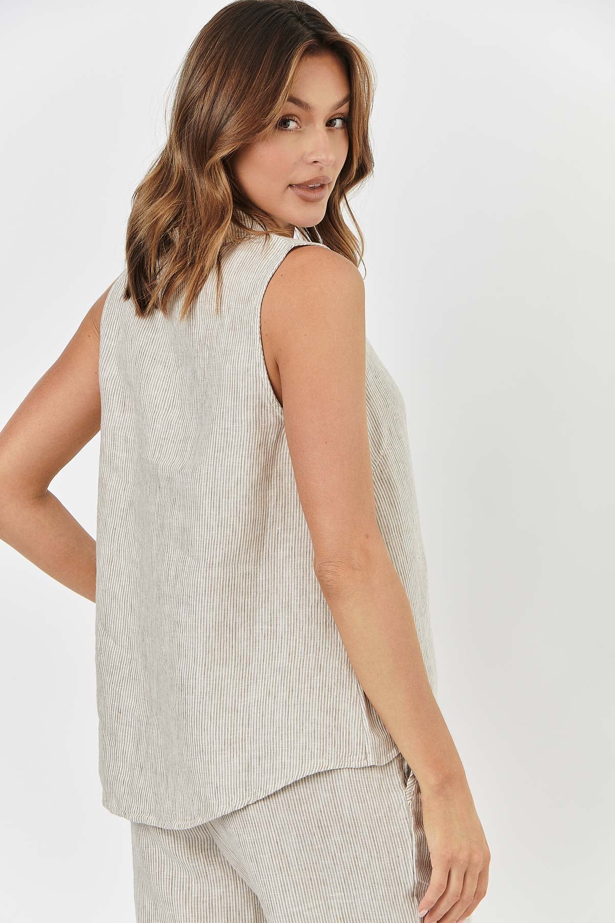 GA423 in Rattan is a sleeveless linen top with a split crew neckline, optional tie, and subtle shark-bite hem. A timeless piece made from 100% linen that can be worn tucked in or loose.