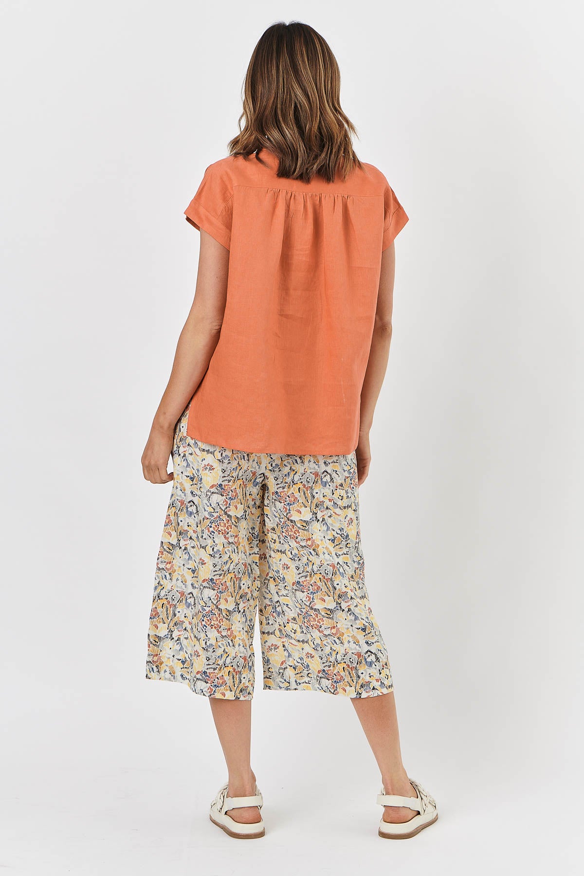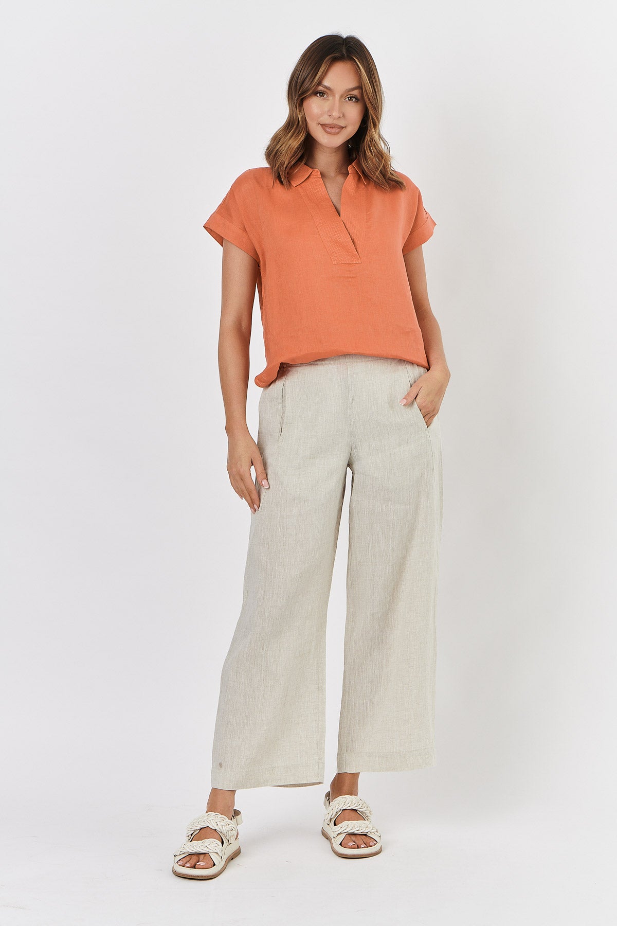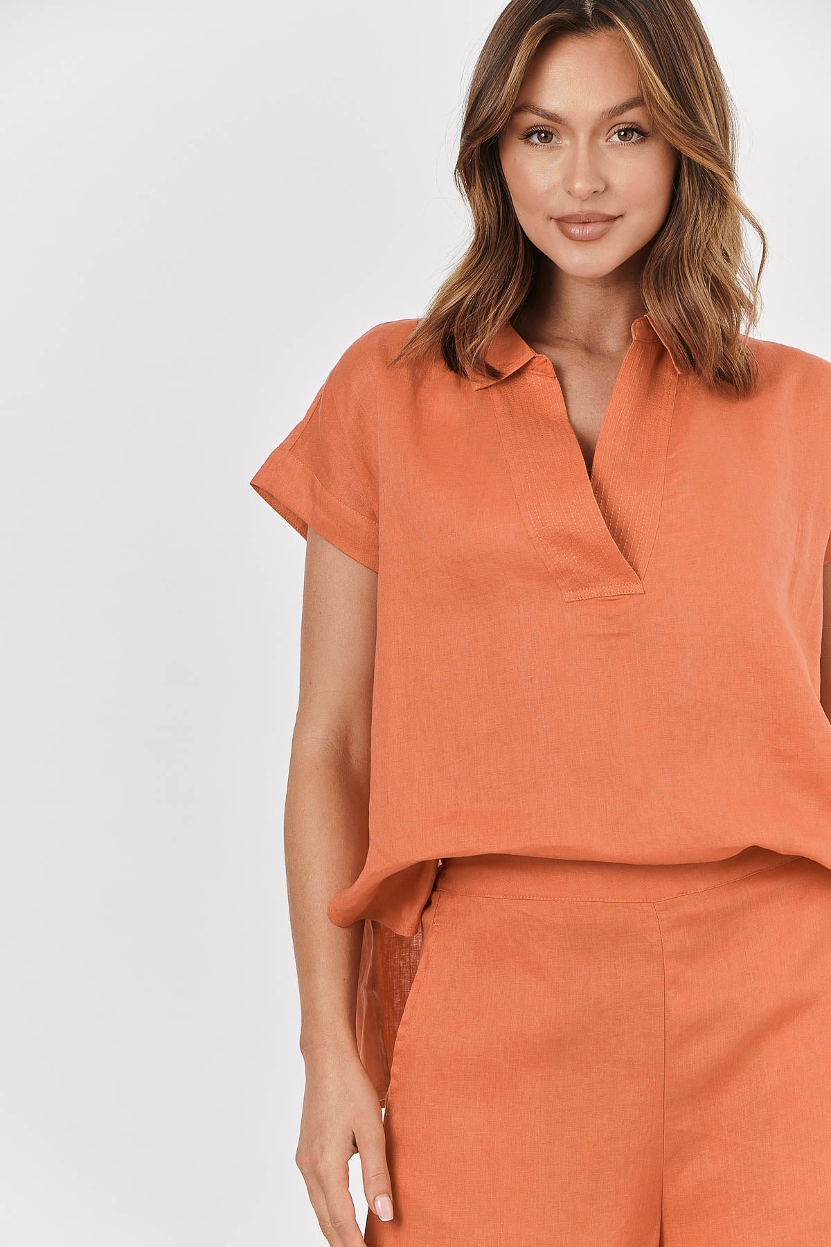A classic short-sleeve shirt with a kaftan-inspired twist. Made from 100%, ultra-soft linen, GA451 in this fresh Tandoori features a deep V-neck, a point collar, and short folded, raglan sleeves. Subtle stitching at the neck adds an elegant touch.