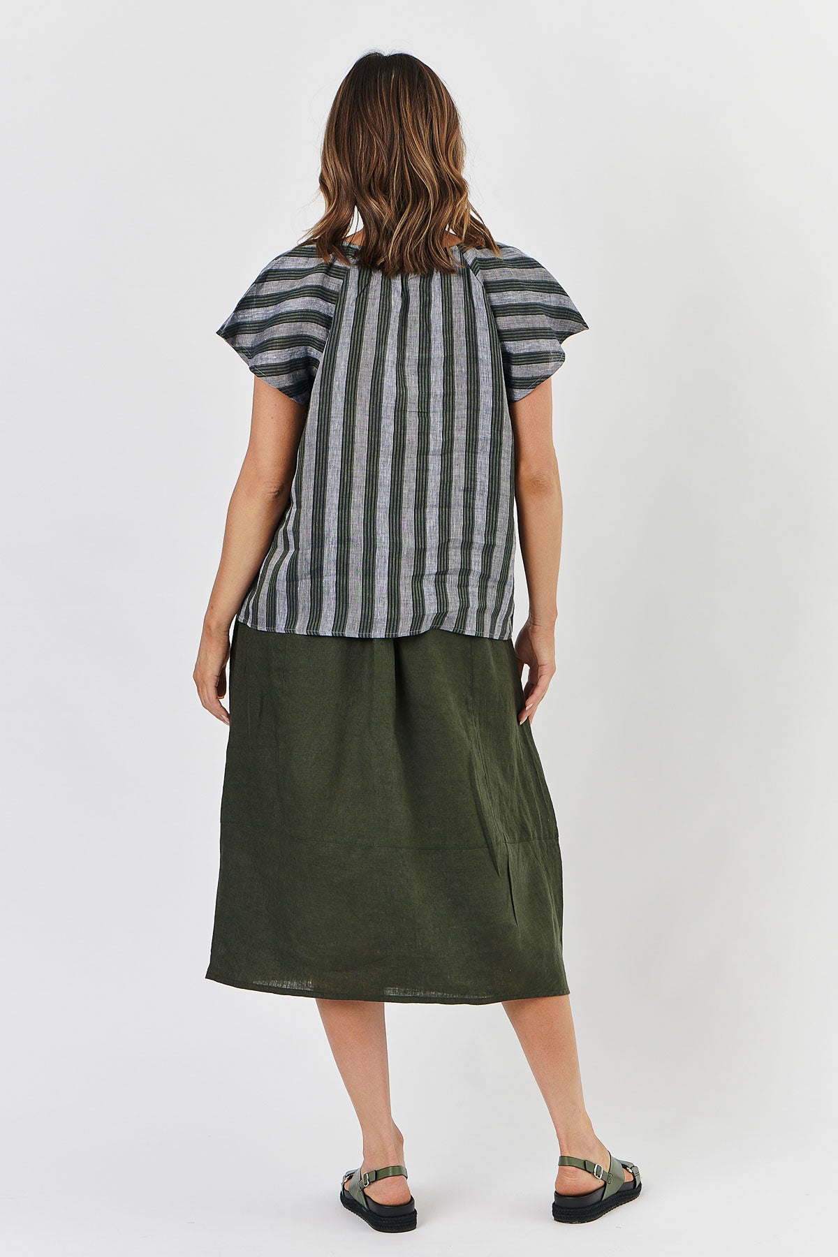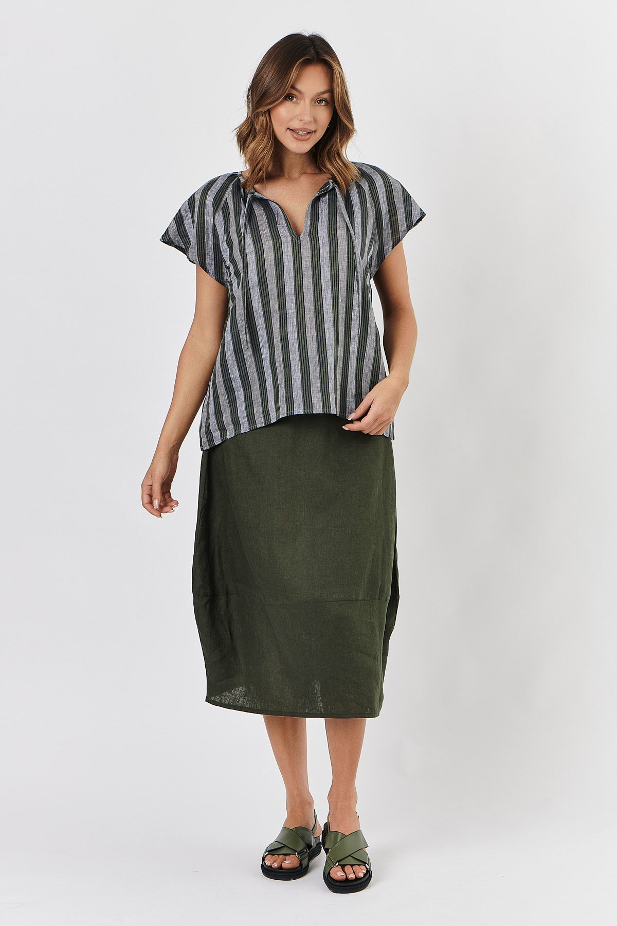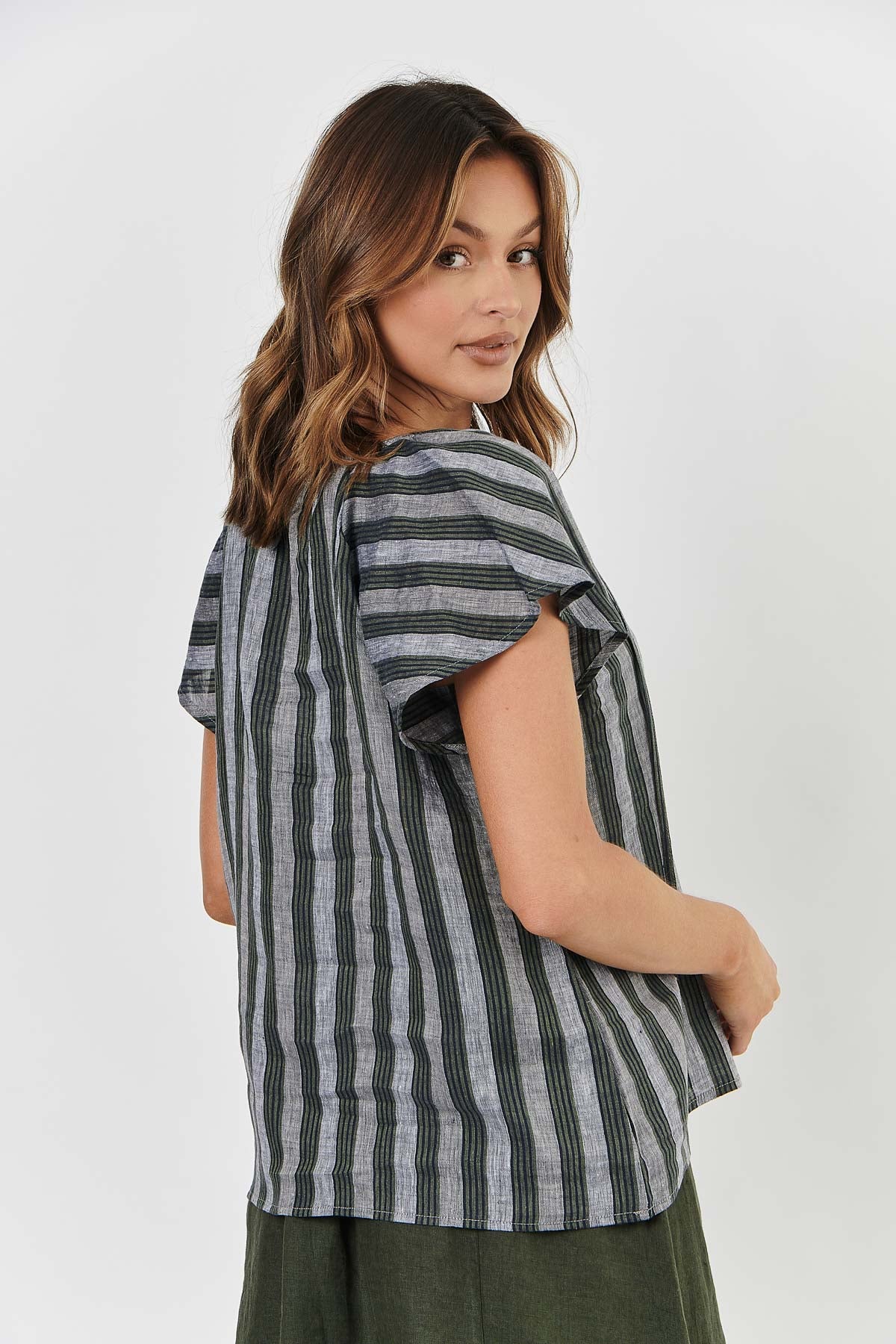 GA459 in Tatami is a 100% linen top with a V-neckline and optional tie at the neck. Featuring a billowy short sleeve for a touch of volume.