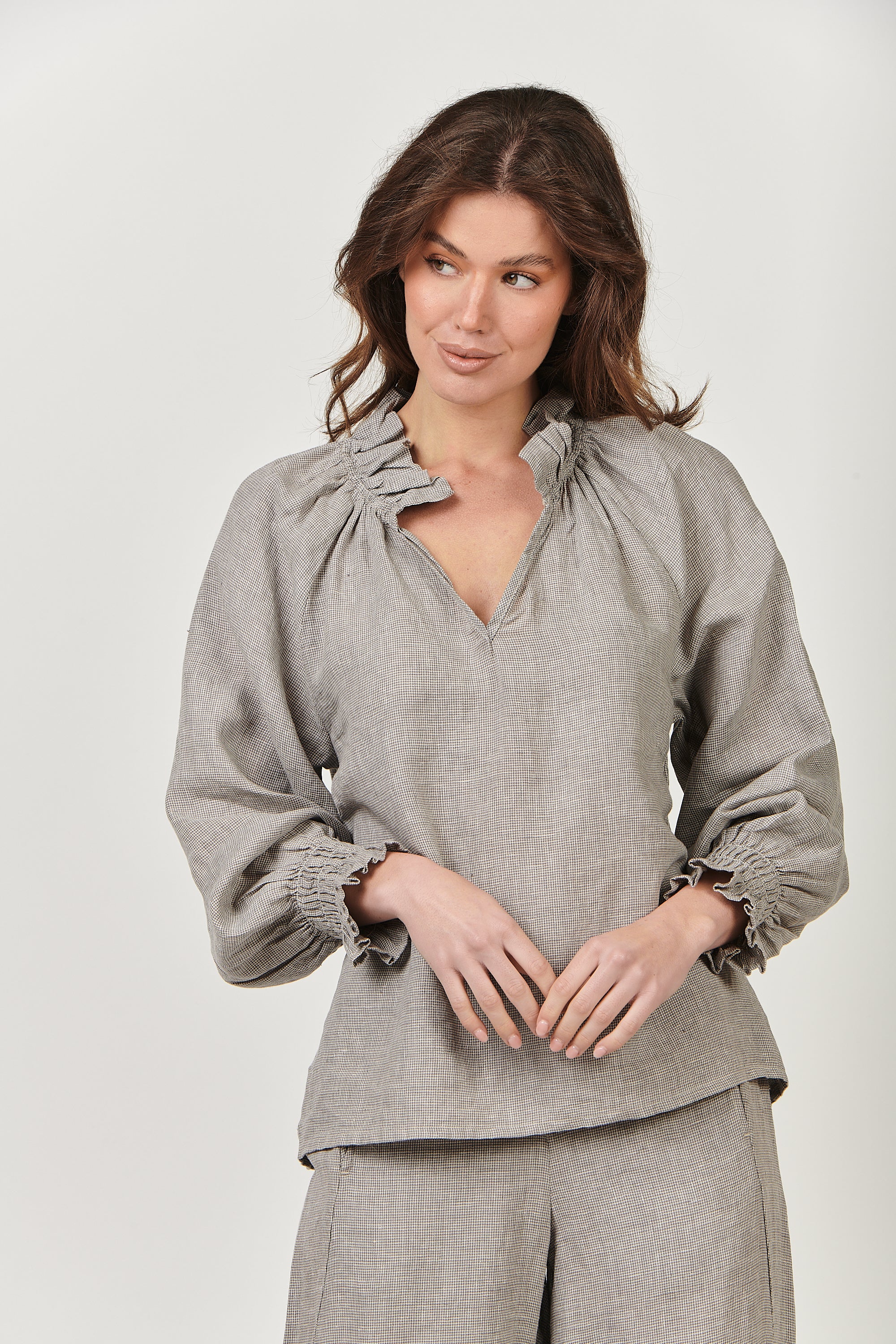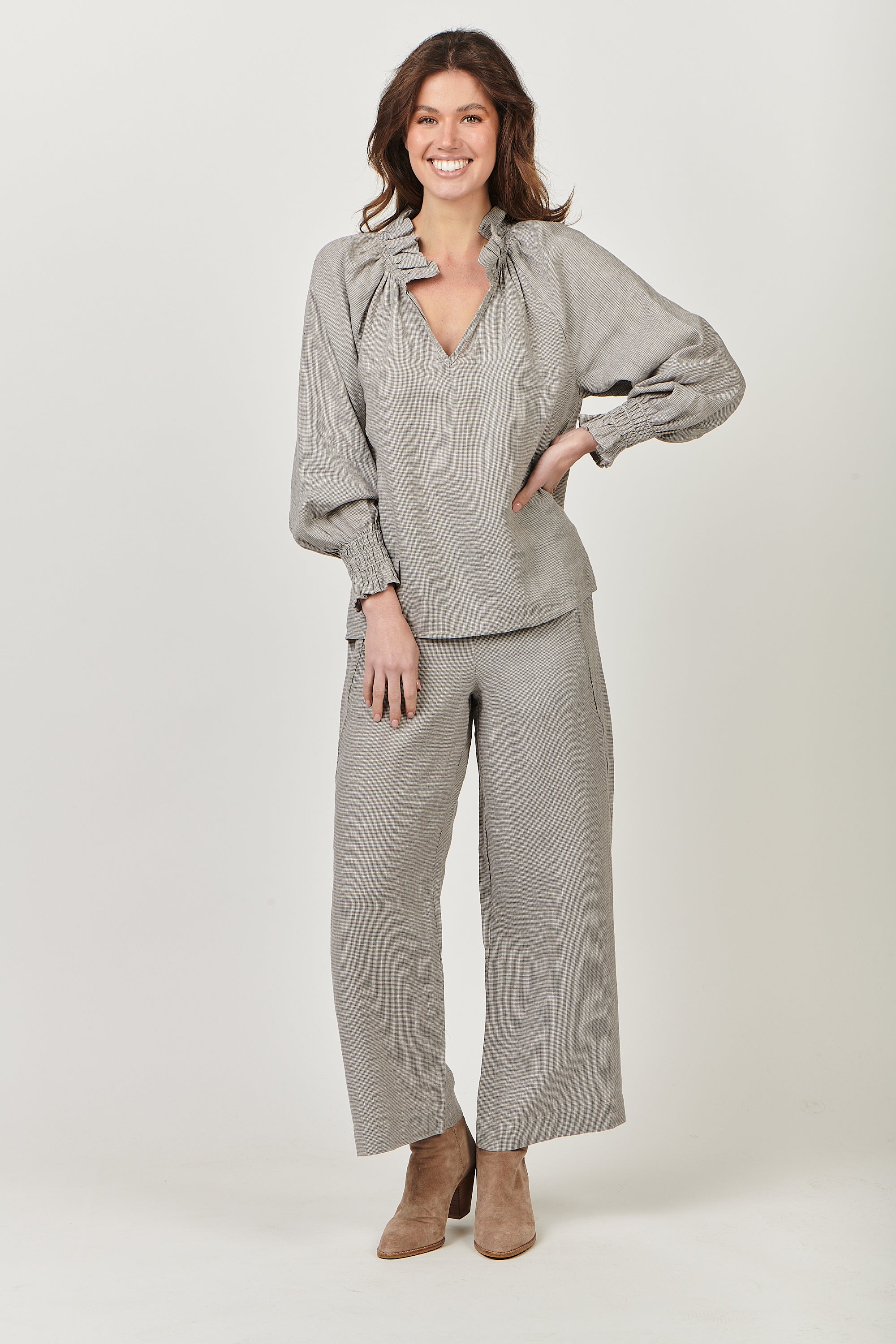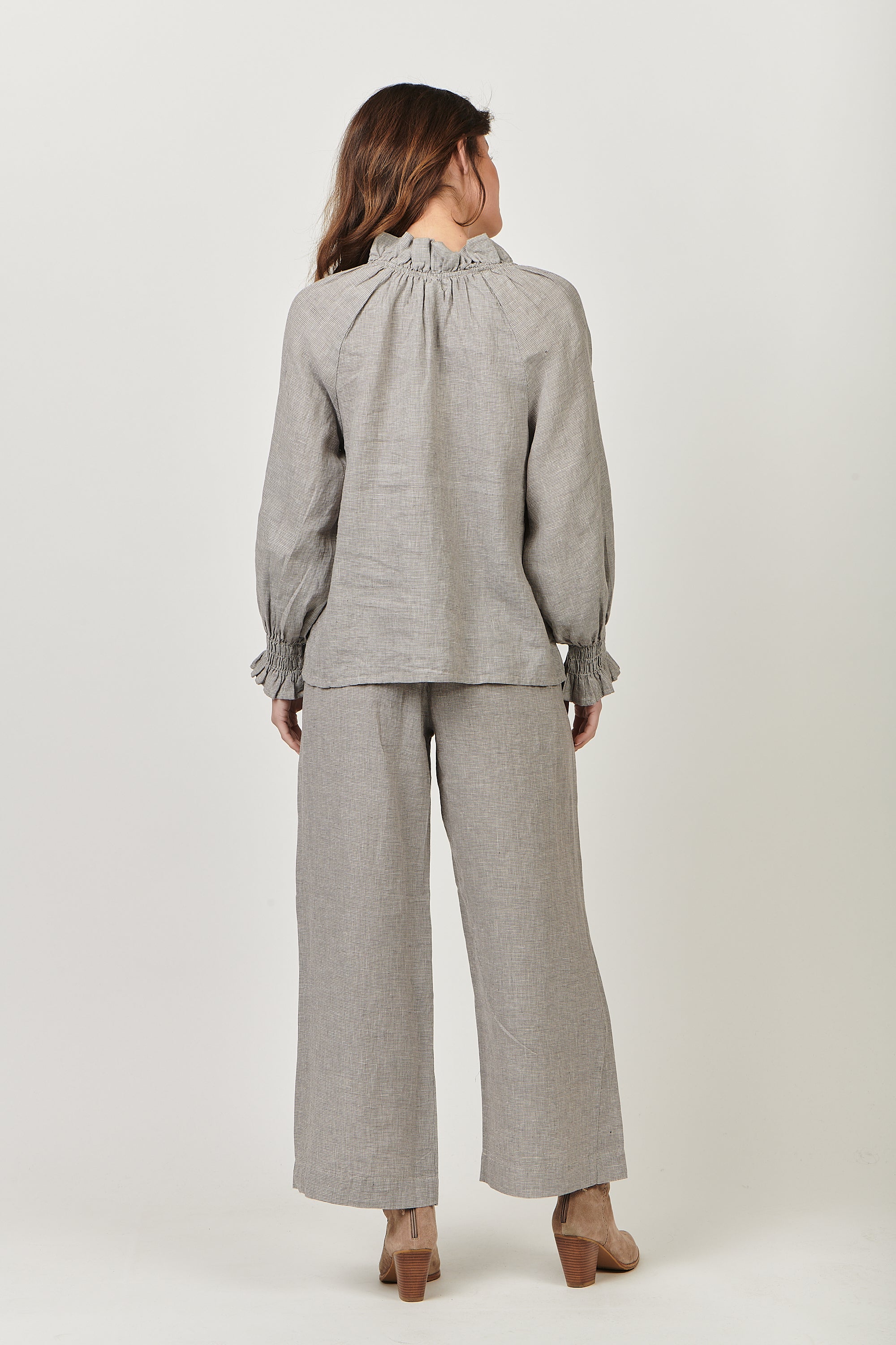 It’s all about shape and texture with this long-sleeve linen top. Featuring a luxurious ruffle collar, V-neck, and a balloon sleeve with layers of gathering detail at the cuff. Made from 100% linen, designed to be worn tucked in or loose.