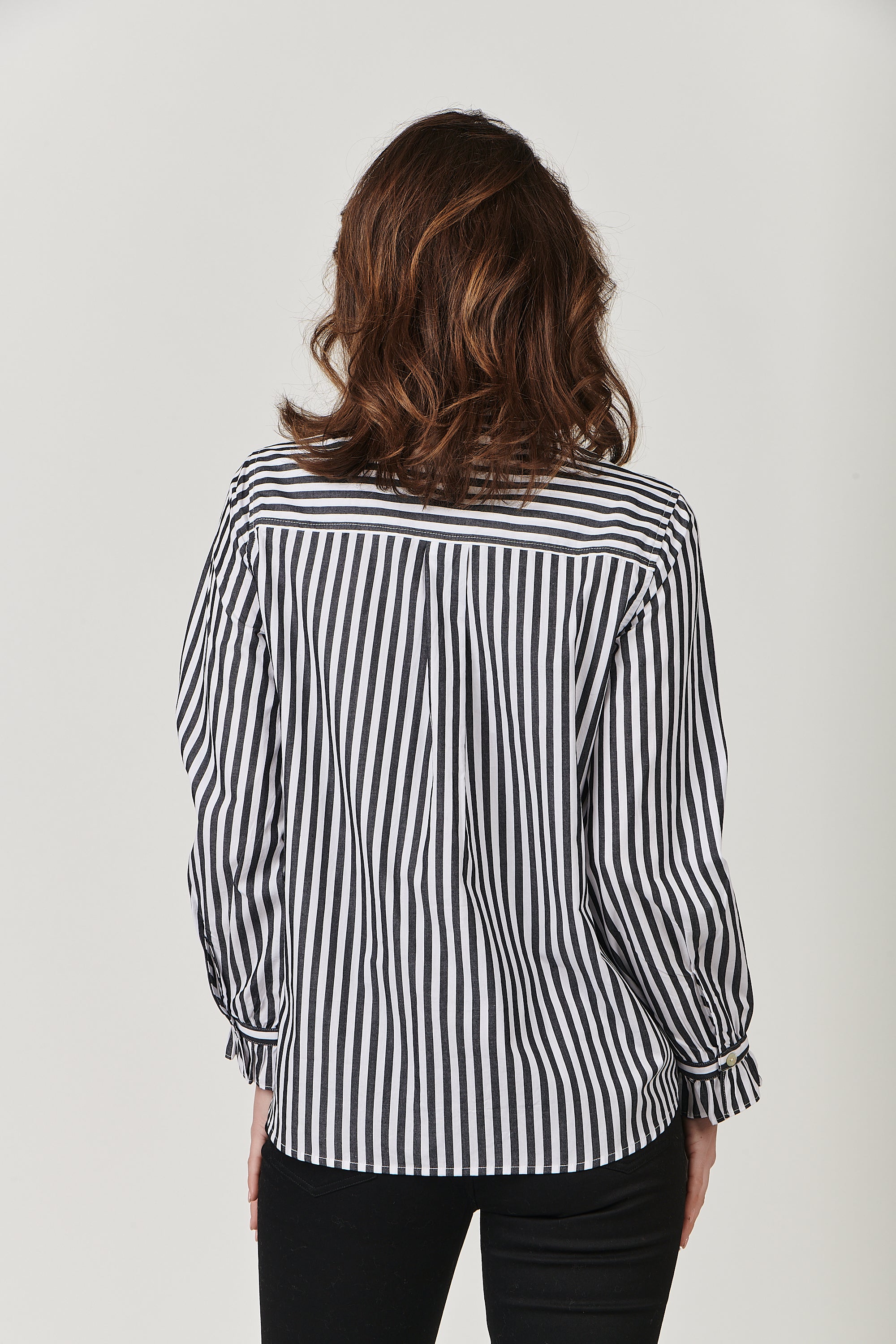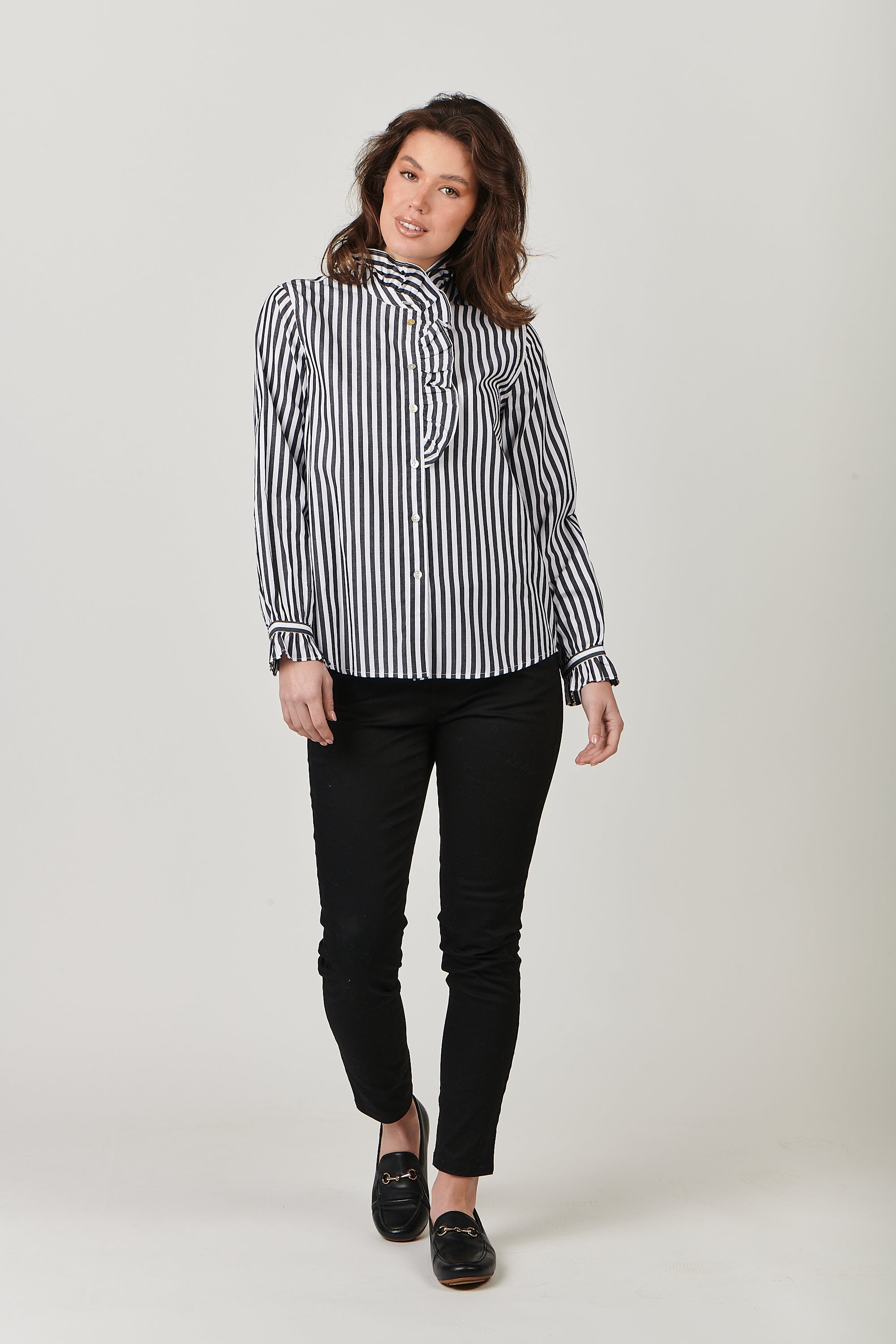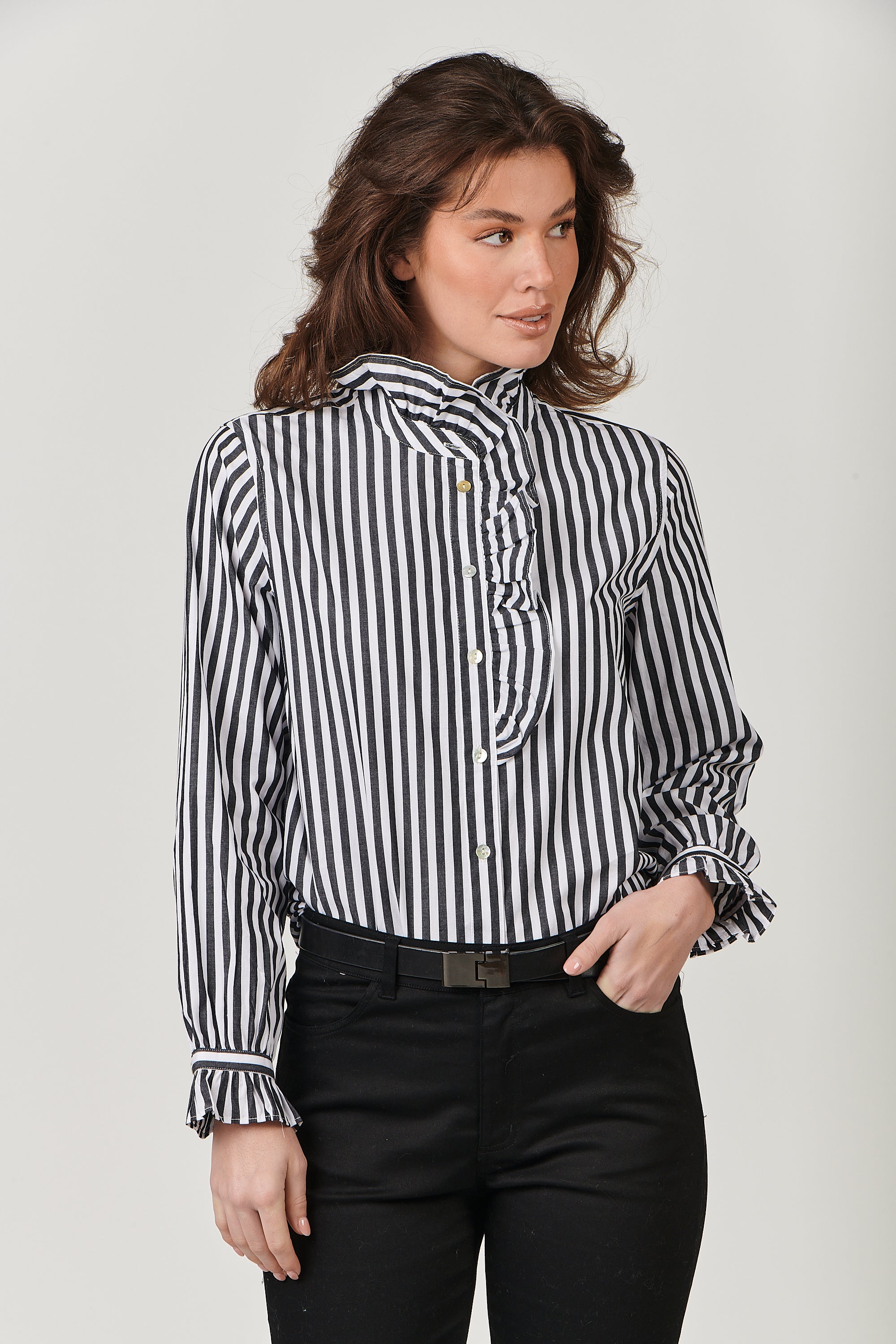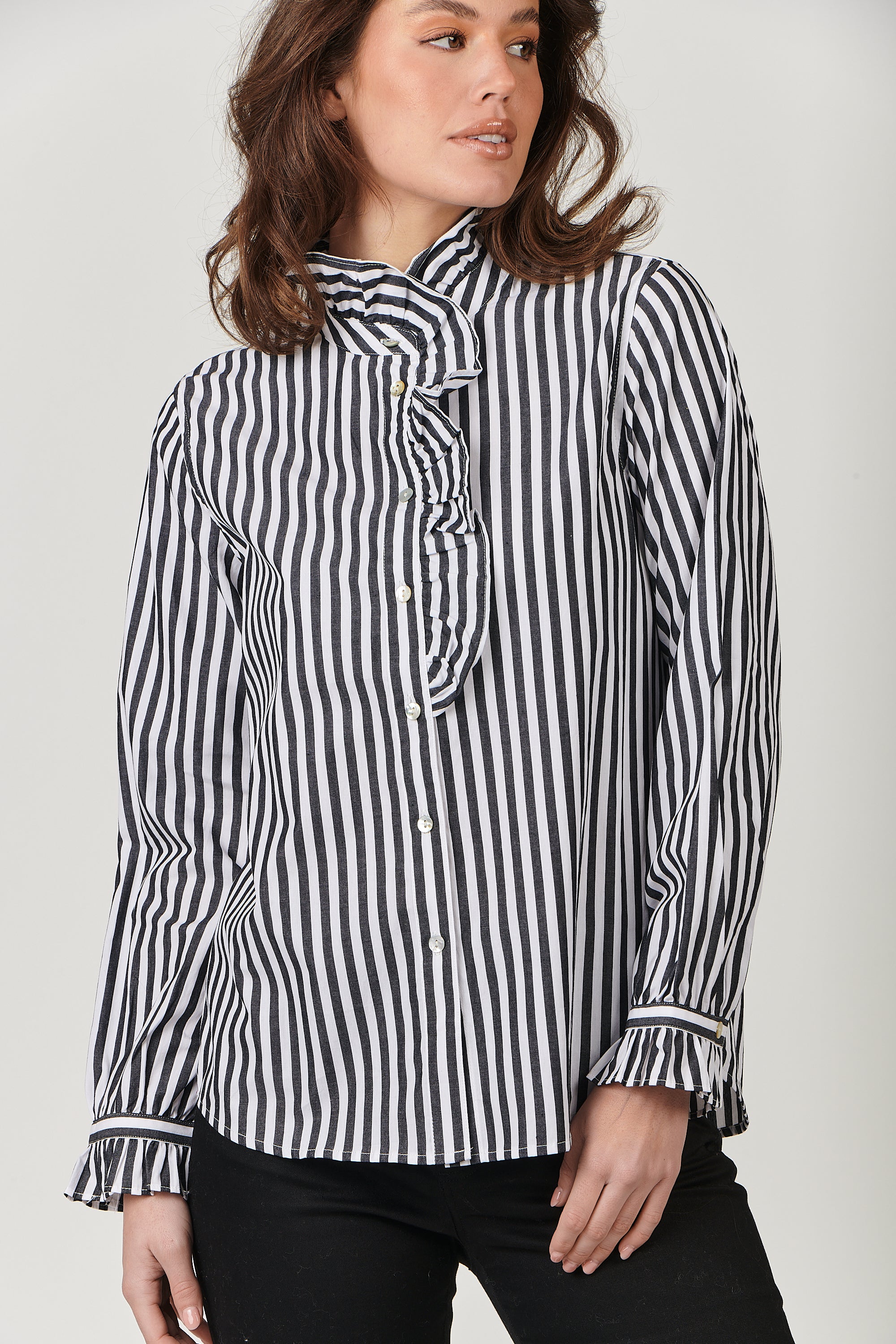 A poplin shirt with a cuffed balloon sleeve and an exaggerated ruffle front for a unique, elegant look. This shirt features buttons all the way down and an inverted box pleat at the back.