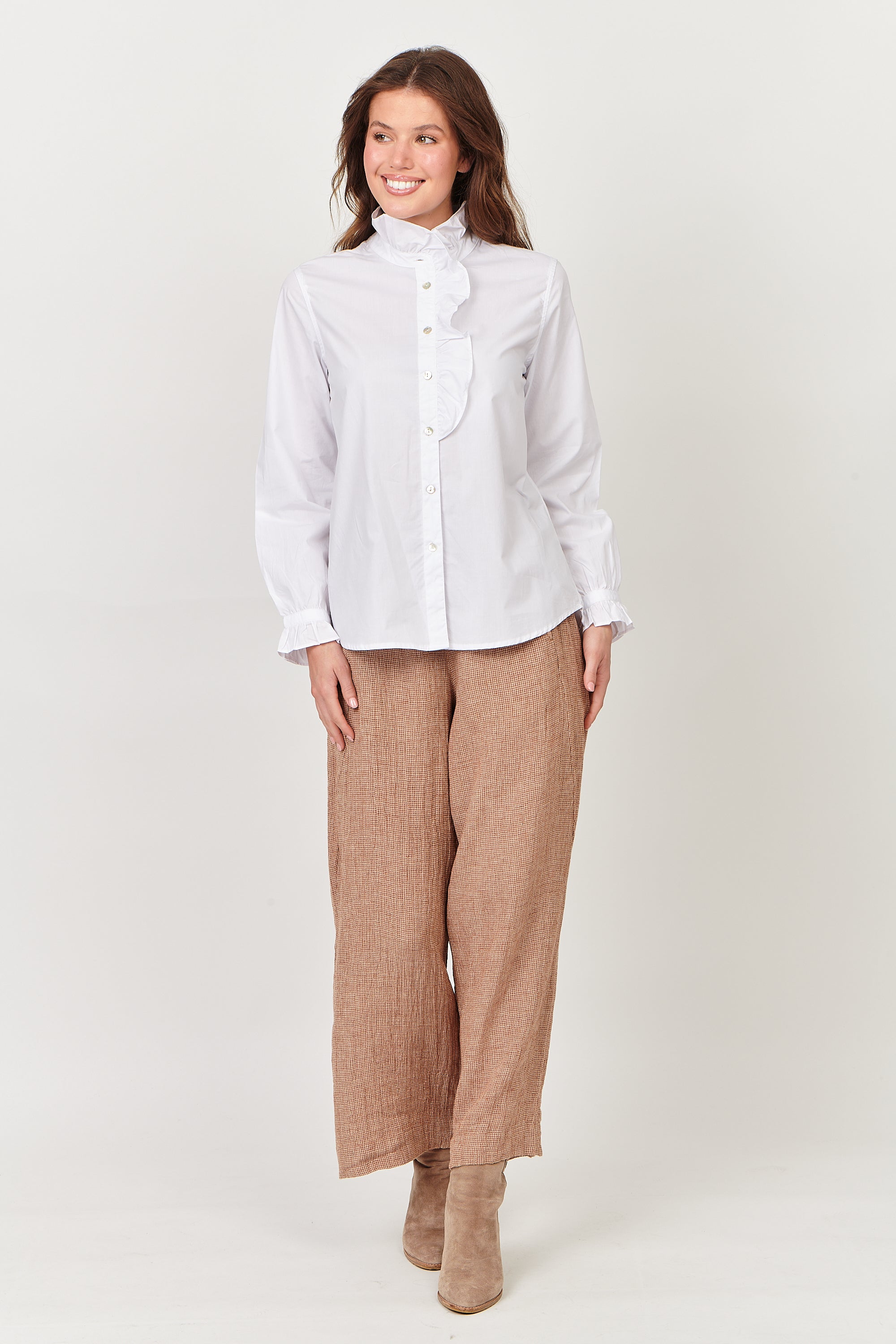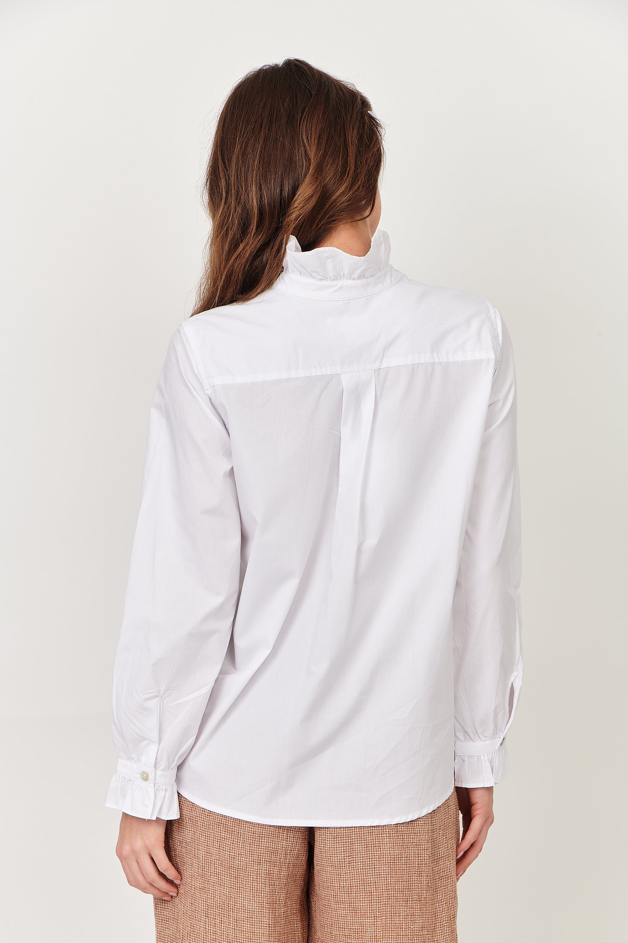 A poplin shirt with a cuffed balloon sleeve and an exaggerated ruffle front for a unique, elegant look. This shirt features buttons all the way down and an inverted box pleat at the back.