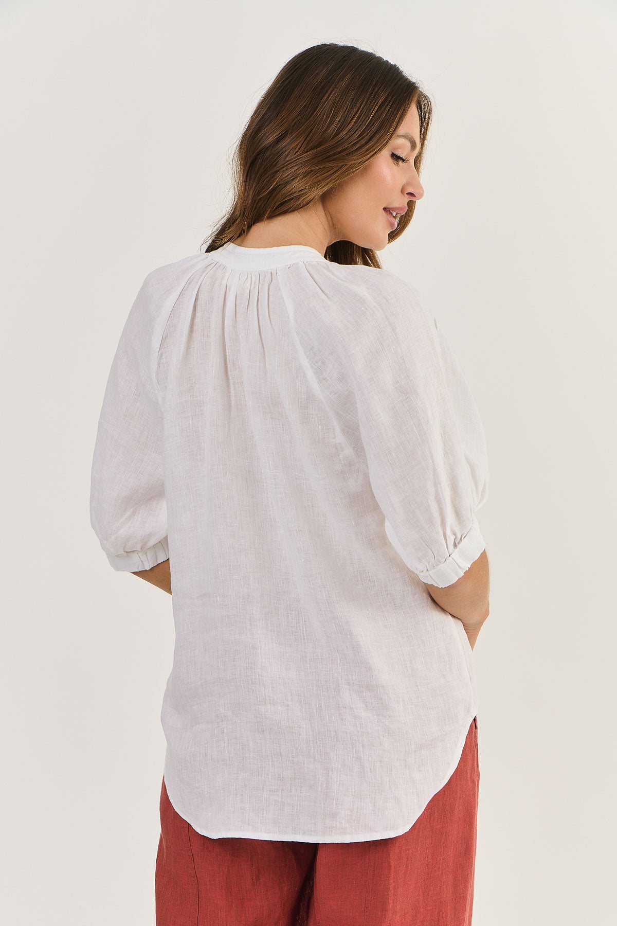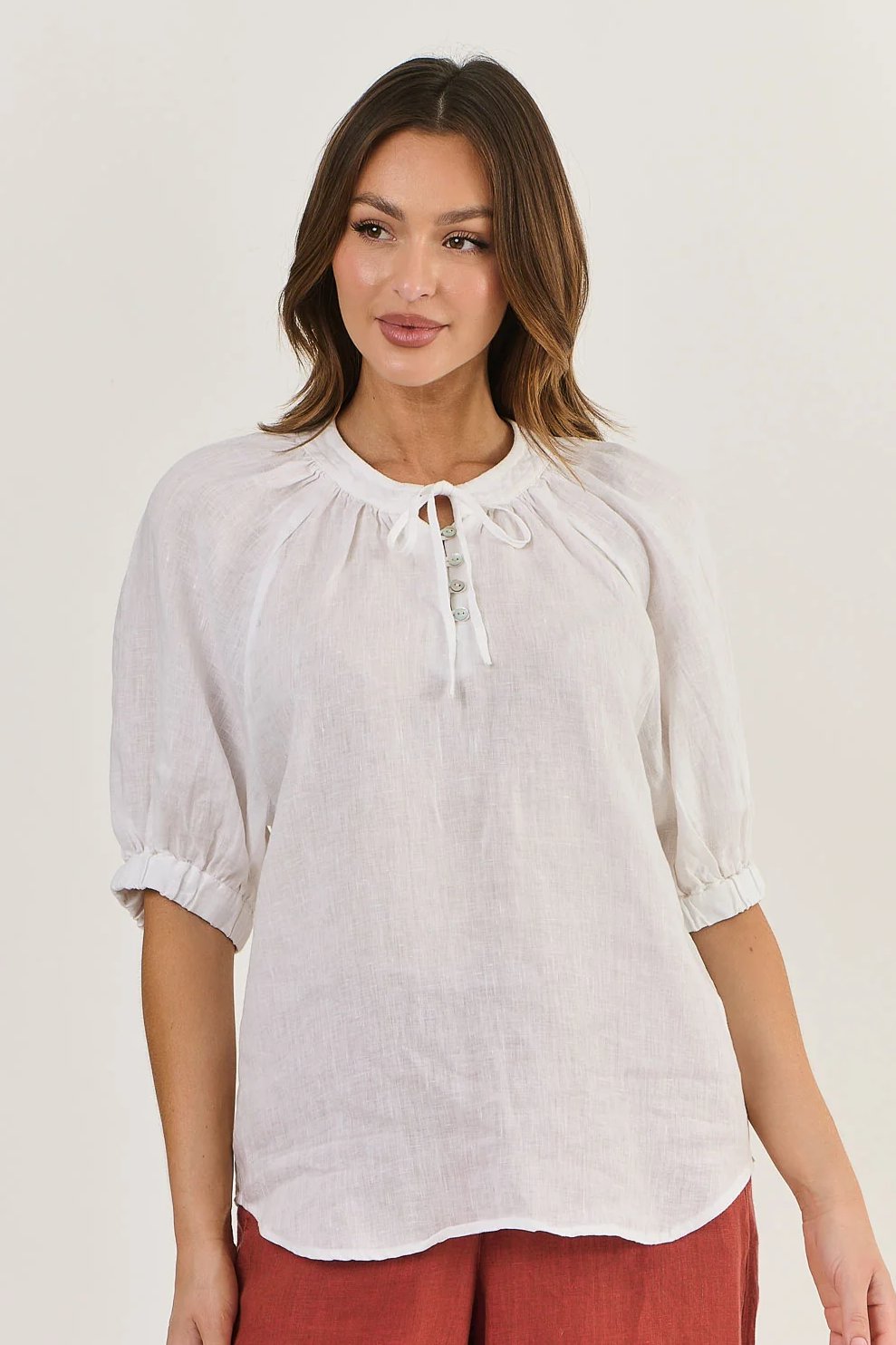 The GA540 Linen Top is a beautiful top with its elbow length raglan sleeves that end in a gathered cuff. Gathering is echoed at the round collar which fastens at the front with a tie and a few delicate shell buttons. The high low hem makes it easy to tuck this top into your favourite linen pants.