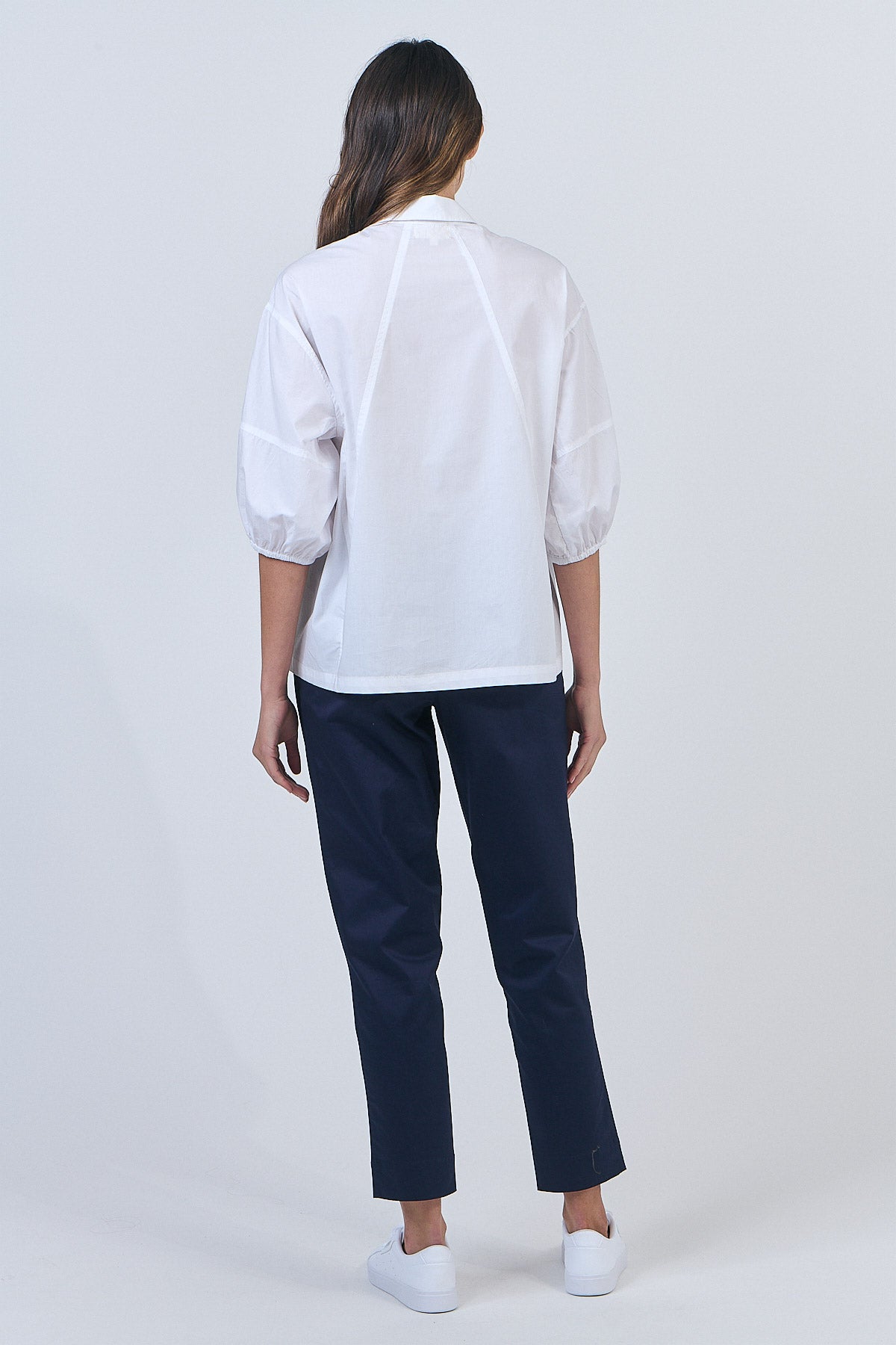 Say goodbye to stiff, uncomfortable shirts and hello to the GA638 —crafted from 100% cotton with elegant gathered sleeves for effortless movement. Its relaxed silhouette features a classic collar and buttoned front, perfect for easy styling whilst maintaining a polished appearance. Designed with three-quarter length sleeves and a slightly cropped hem, this versatile piece pairs beautifully with our coordinating bottoms for an effortlessly chic ensemble.