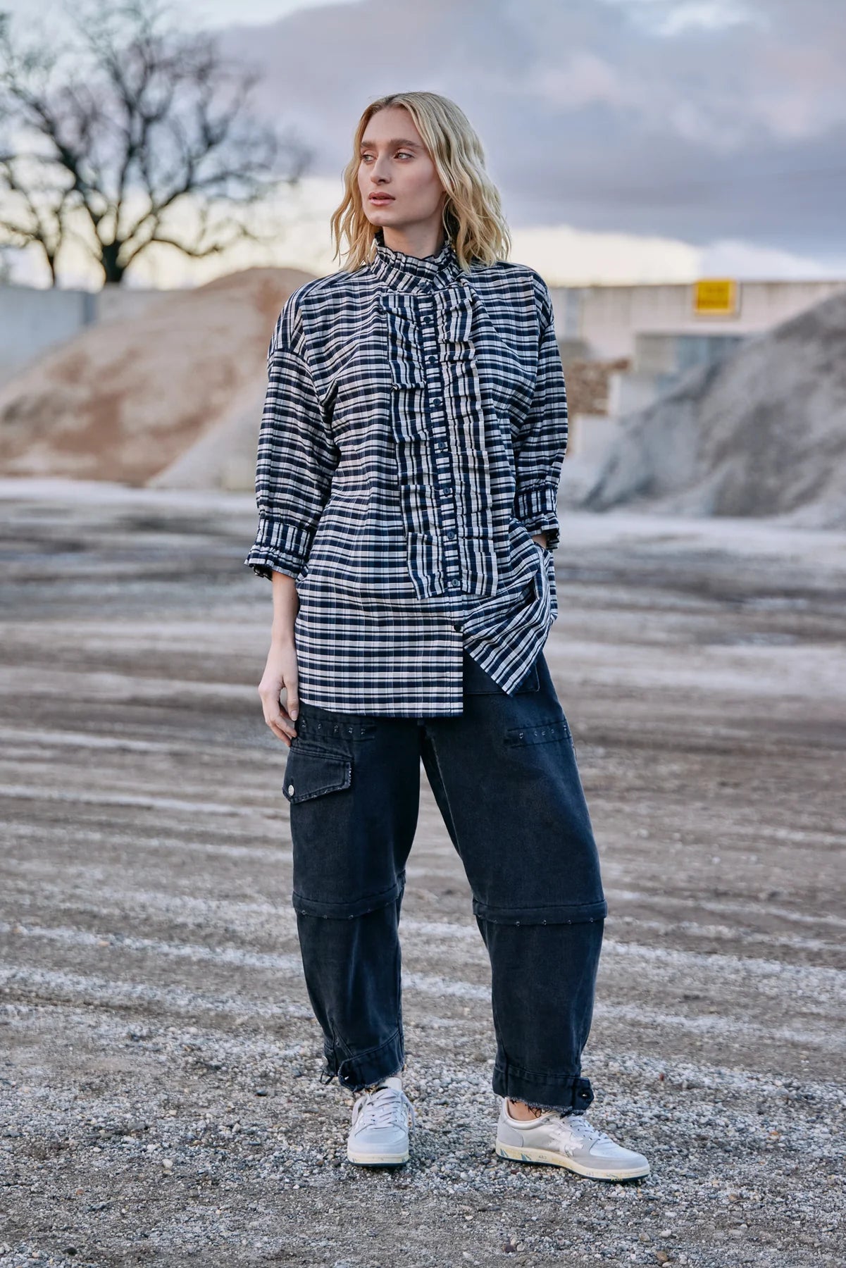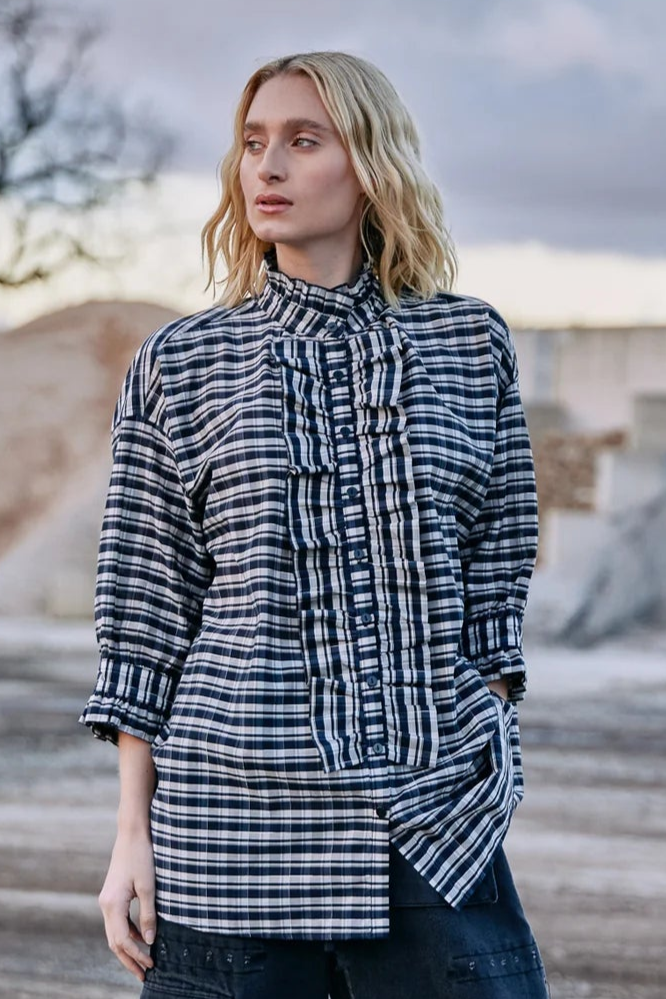 Experience luxury and style in the M.A. Dainty Gambit Shirt. Made with a Silk Cotton blend, this shirt features a ruffle button up front, ruffle cuffs and neck detail, and a subtle metallic check pattern in dark navy and white. Elevate your wardrobe and make a statement with this unique and chic piece.