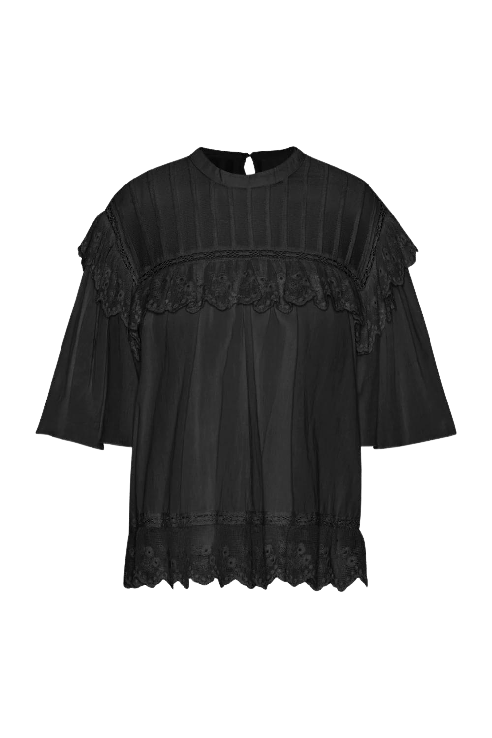 The Gamma Blouse is a feminine blouse with many beautiful lace details. The blouse has a loose fit with wide sleeves. In the back of the neck the blouse has a hole with a button for closure. The fabric is super soft and has a light feel making it very comfortable. Also Available in Chalk.
