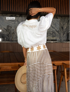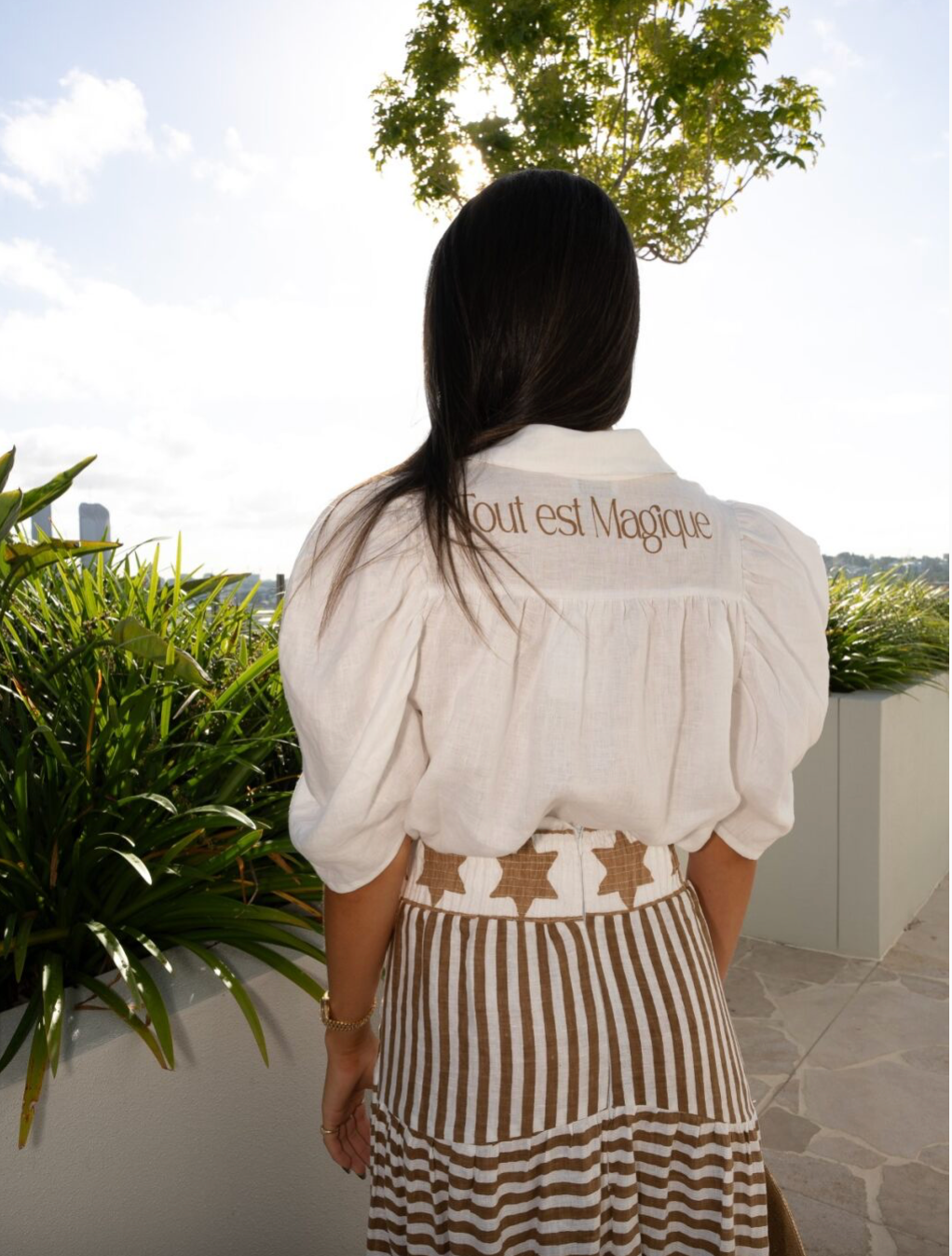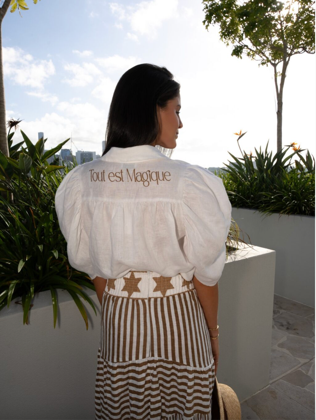 bespoke hand-printed yoke reading Tout est magique (“Everything is magic”), this piece